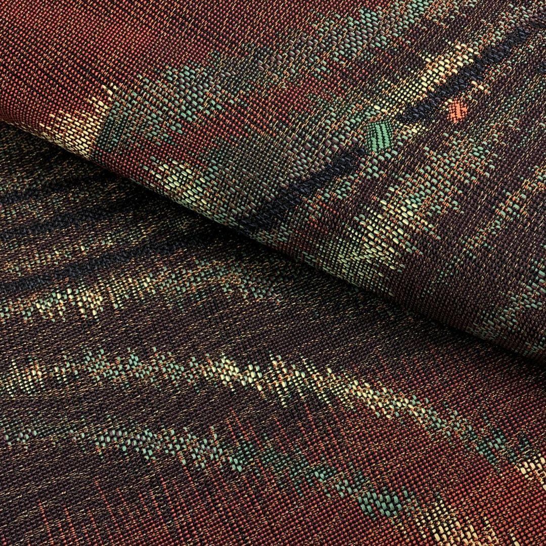 深緋色ベースの深みのあるお色味に抽象模様の柄裄がデザインされた雰囲気の良い素敵なお品でございます。