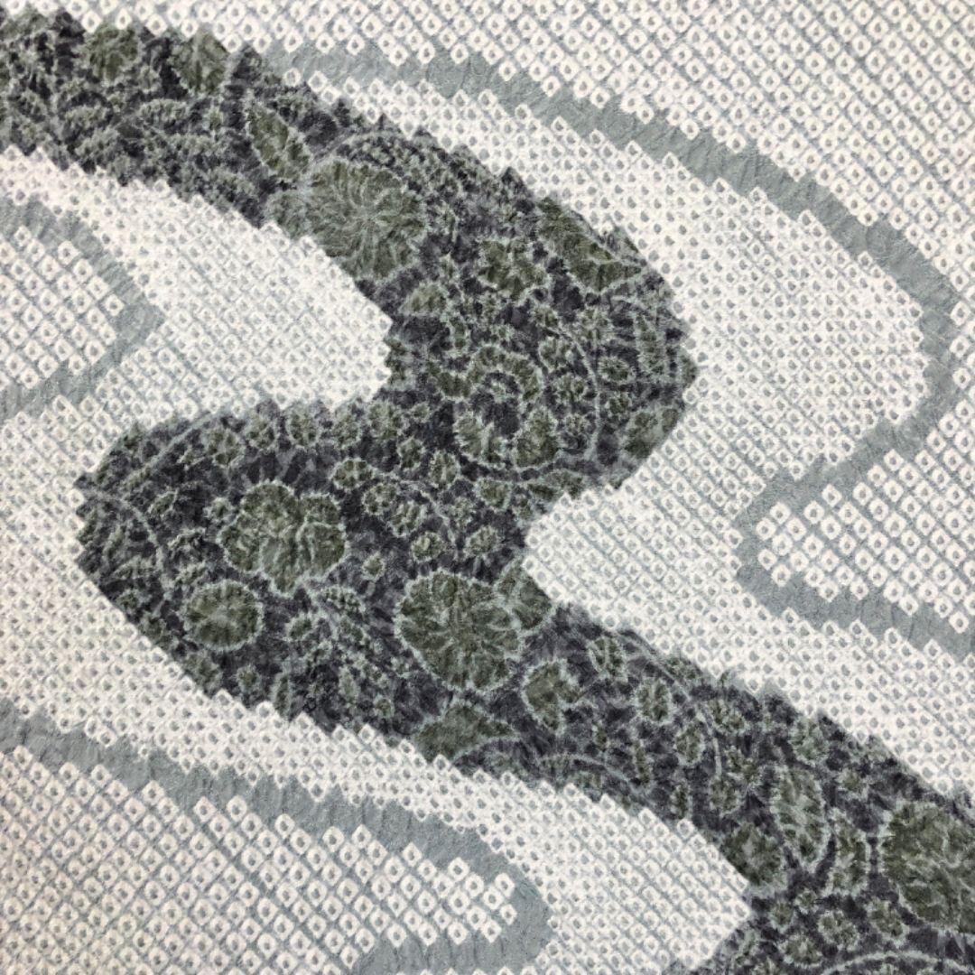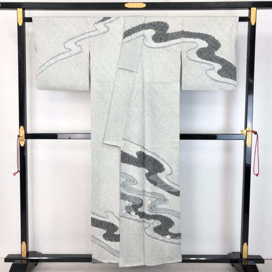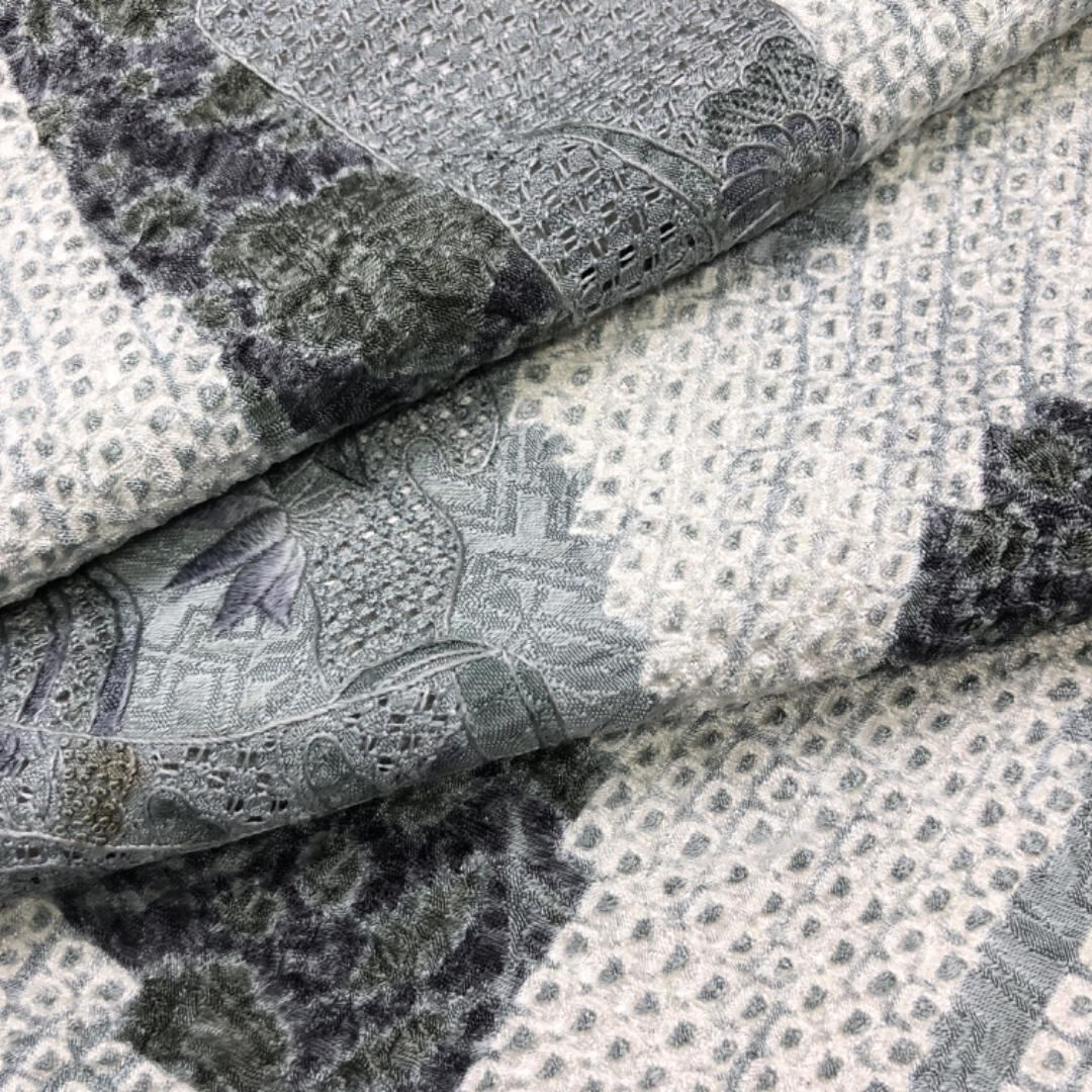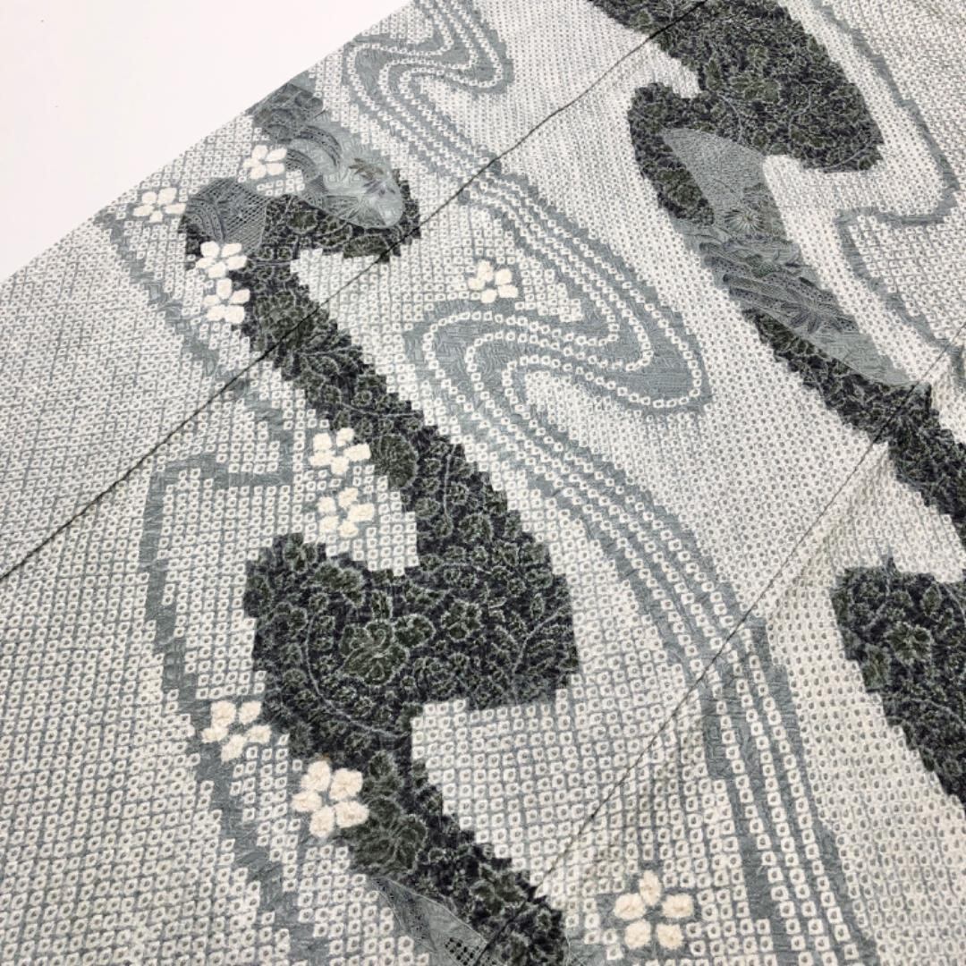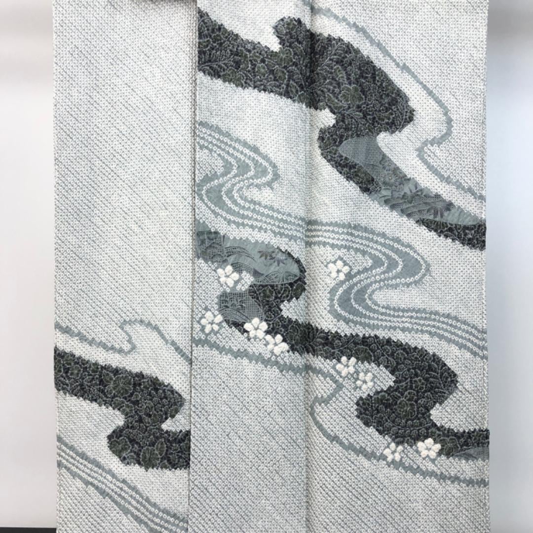 沈香茶色の上品なお色味に流水模様、相良刺繍、汕頭刺繍などが使われた花模様がデザインされた品の良い素敵な柄行のお品でございます。