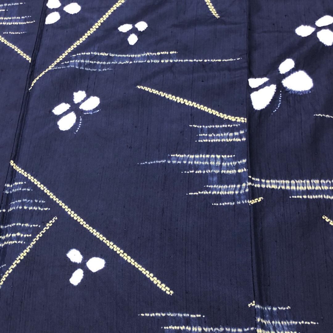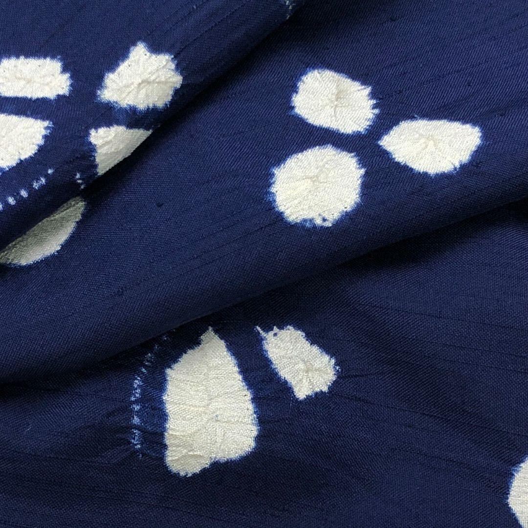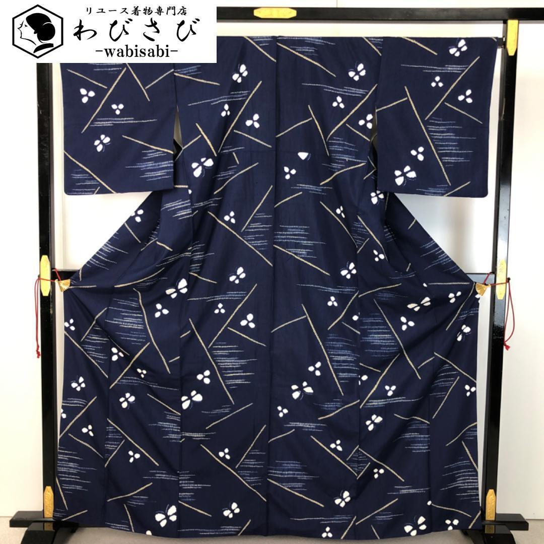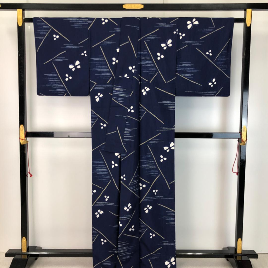 紺桔梗色の落ち着きのあるお色味に絞り柄の蝶々の可愛らしい柄行がデザインされた雰囲気の良い素敵なお品でございます。