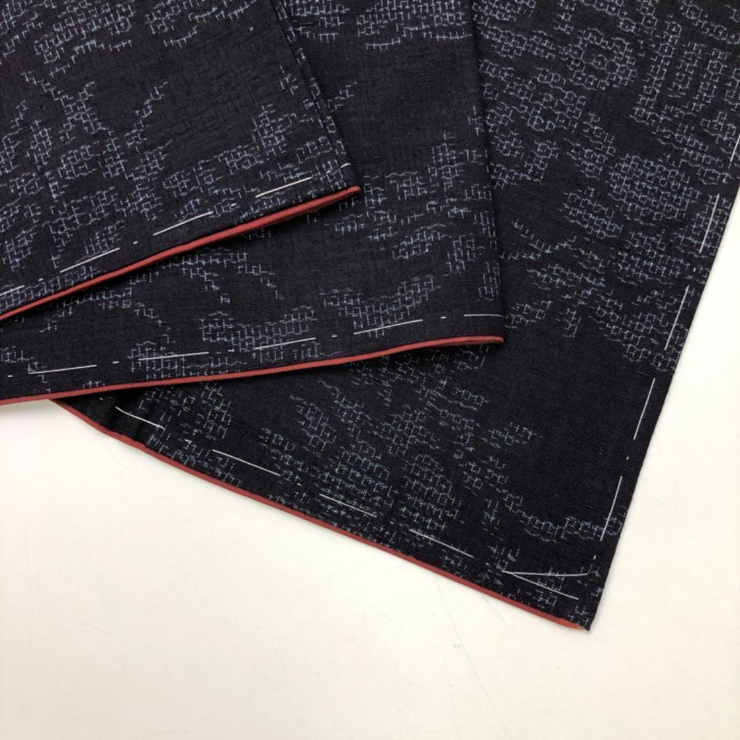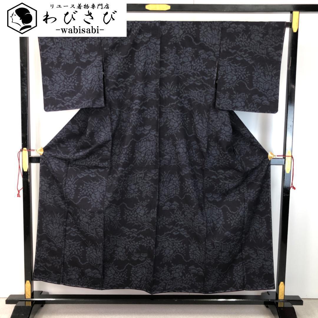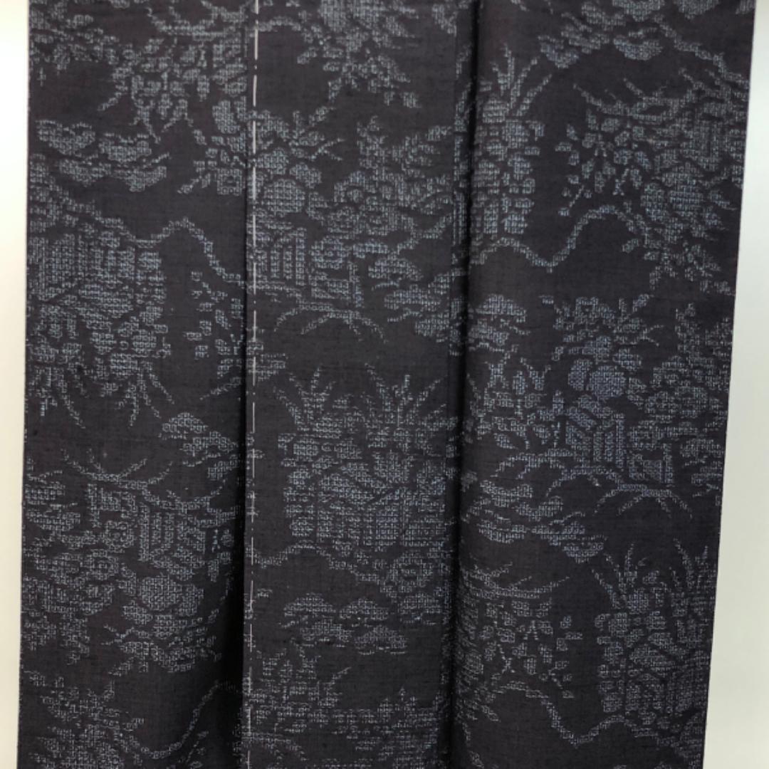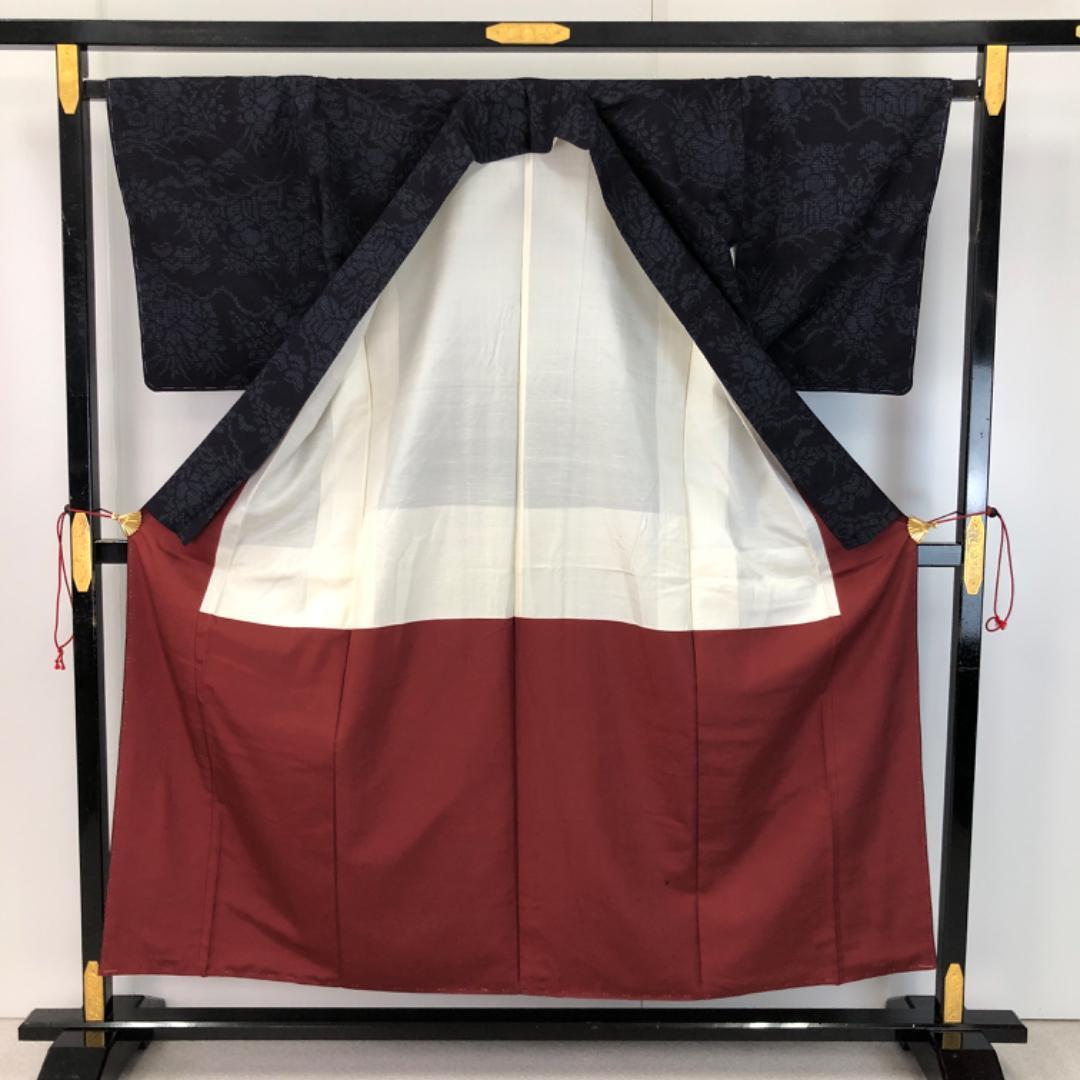 紺鉄色の落ち着きあるお色味に花模様の柄裄がデザインされた雰囲気の良い素敵なお品でございます。