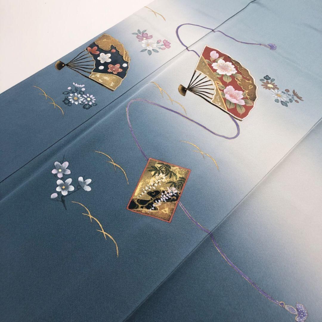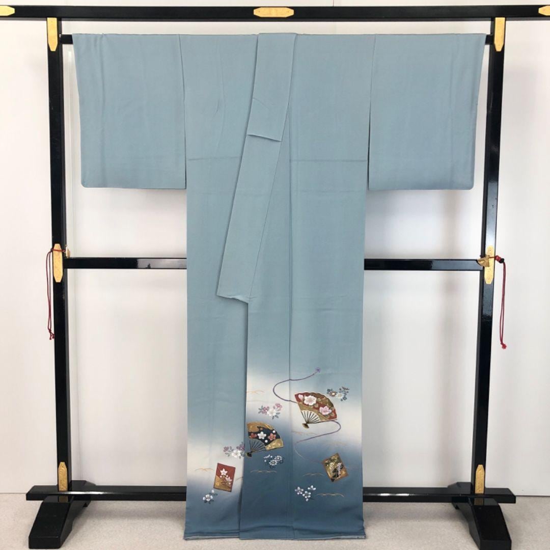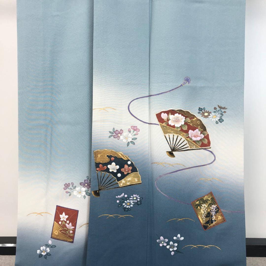 空色鼠の上品なお色味に暈し、扇子に花模様の柄裄がデザインされた雰囲気の良い素敵なお品でございます。