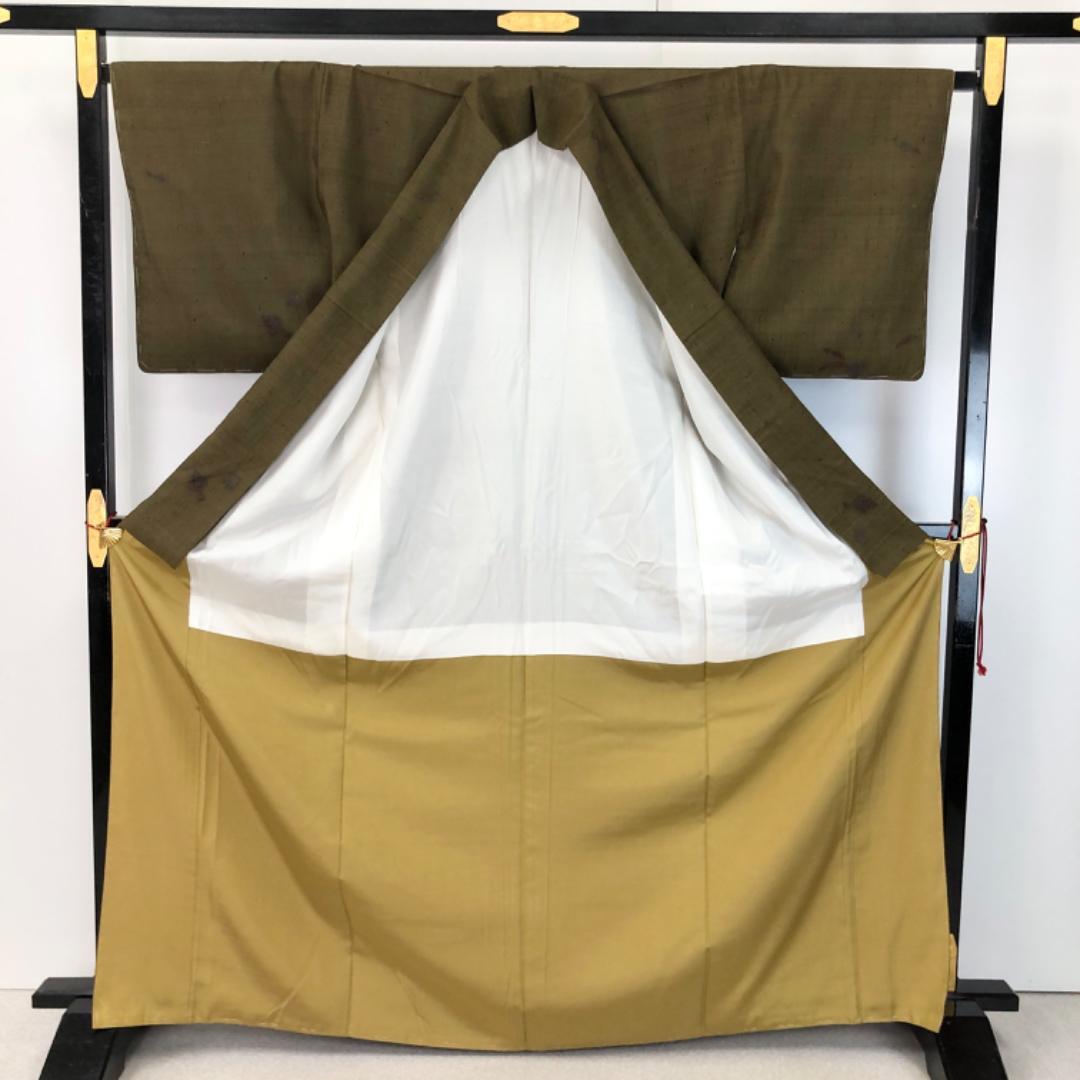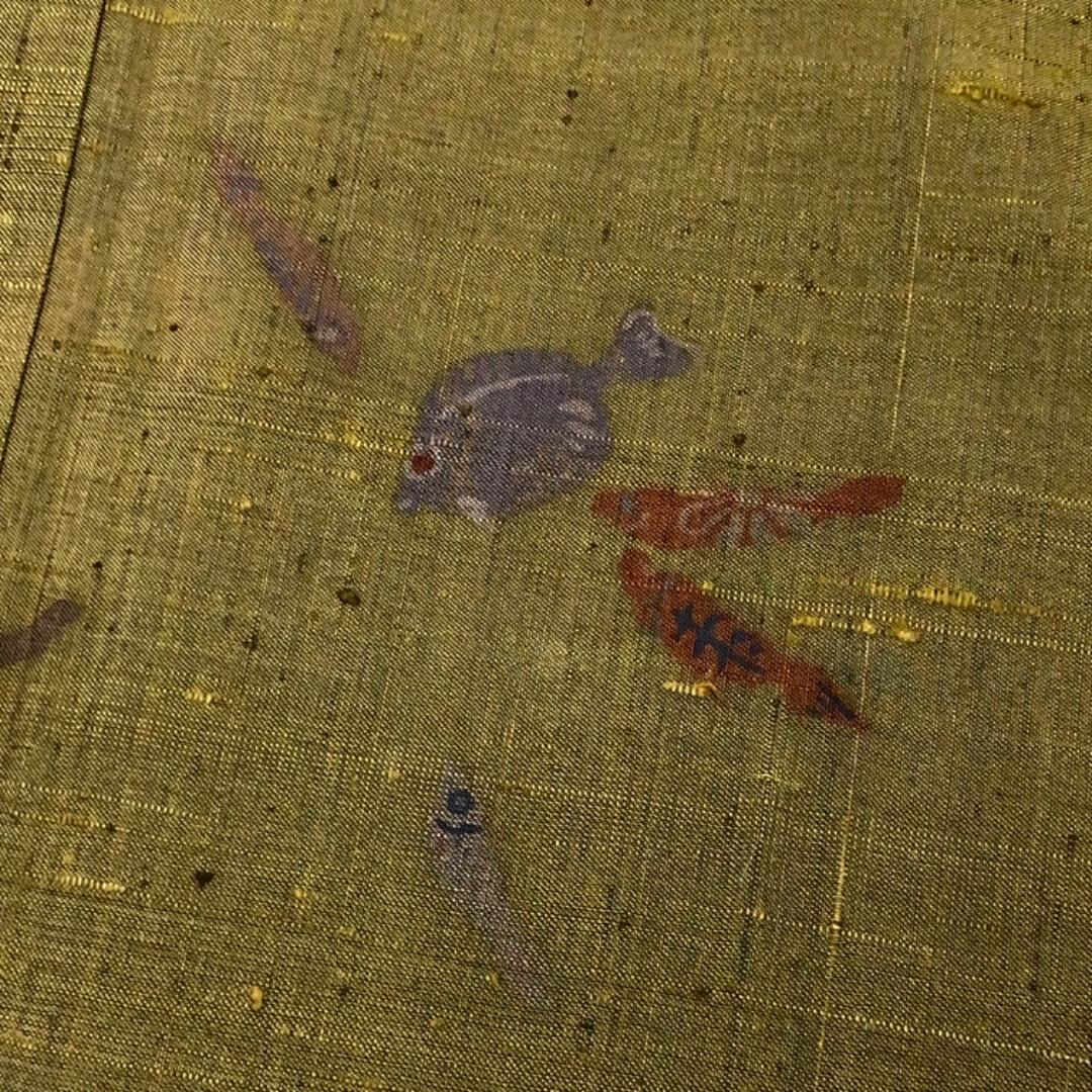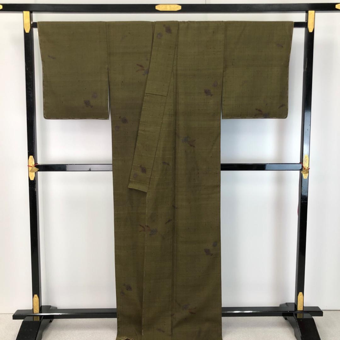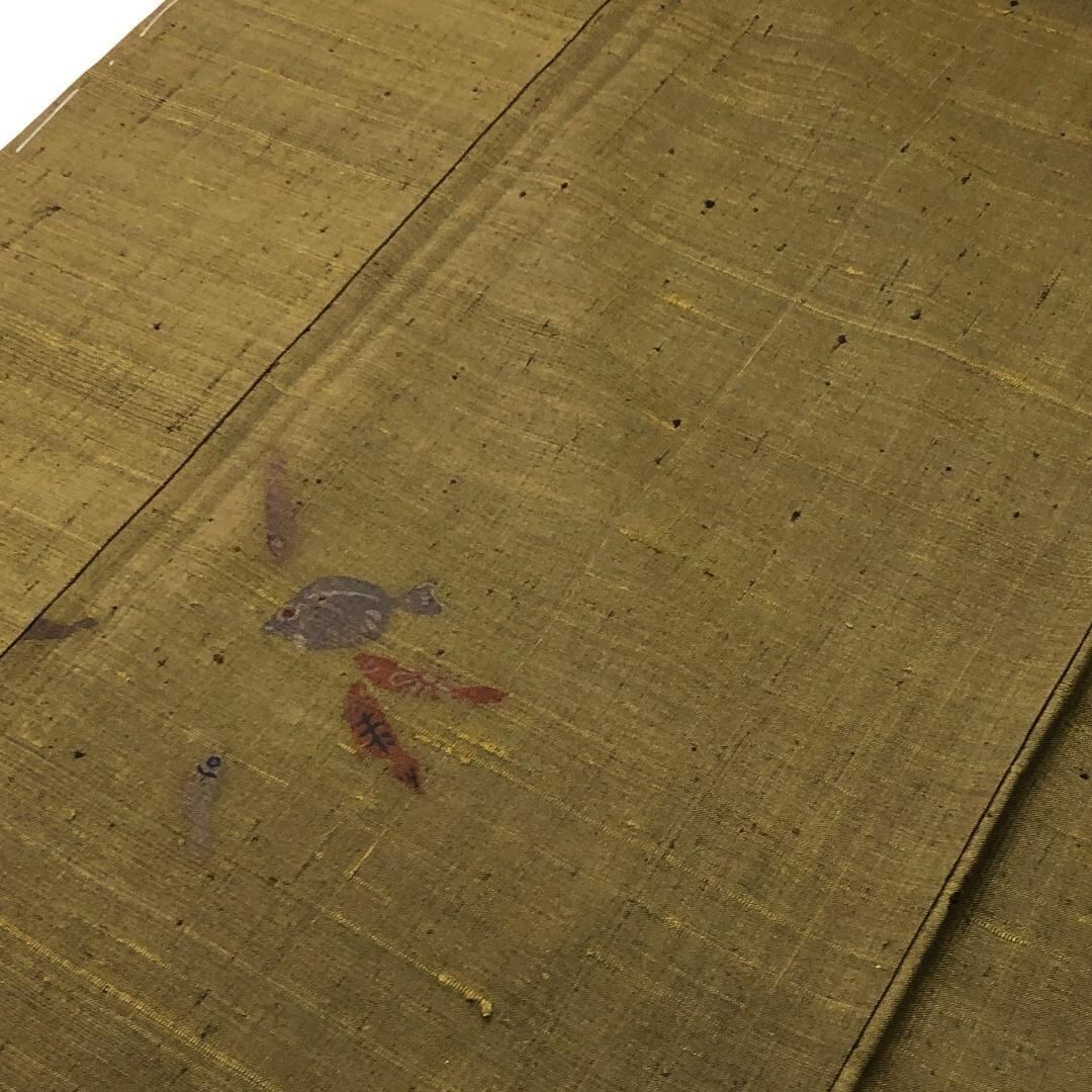 千歳茶色ベースの落ち着きあるお色味の紬地に雰囲気の良い魚の柄裄がデザインされた素敵なお品でございます。