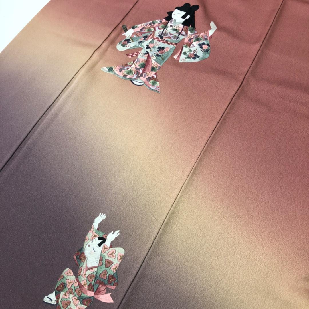 付下げ 刺繍の童子柄 暈し 蘇芳色 縮緬 K-5456 着物 きもの kimono 和服 和装 中古 リサイクル着物 【送料無料】