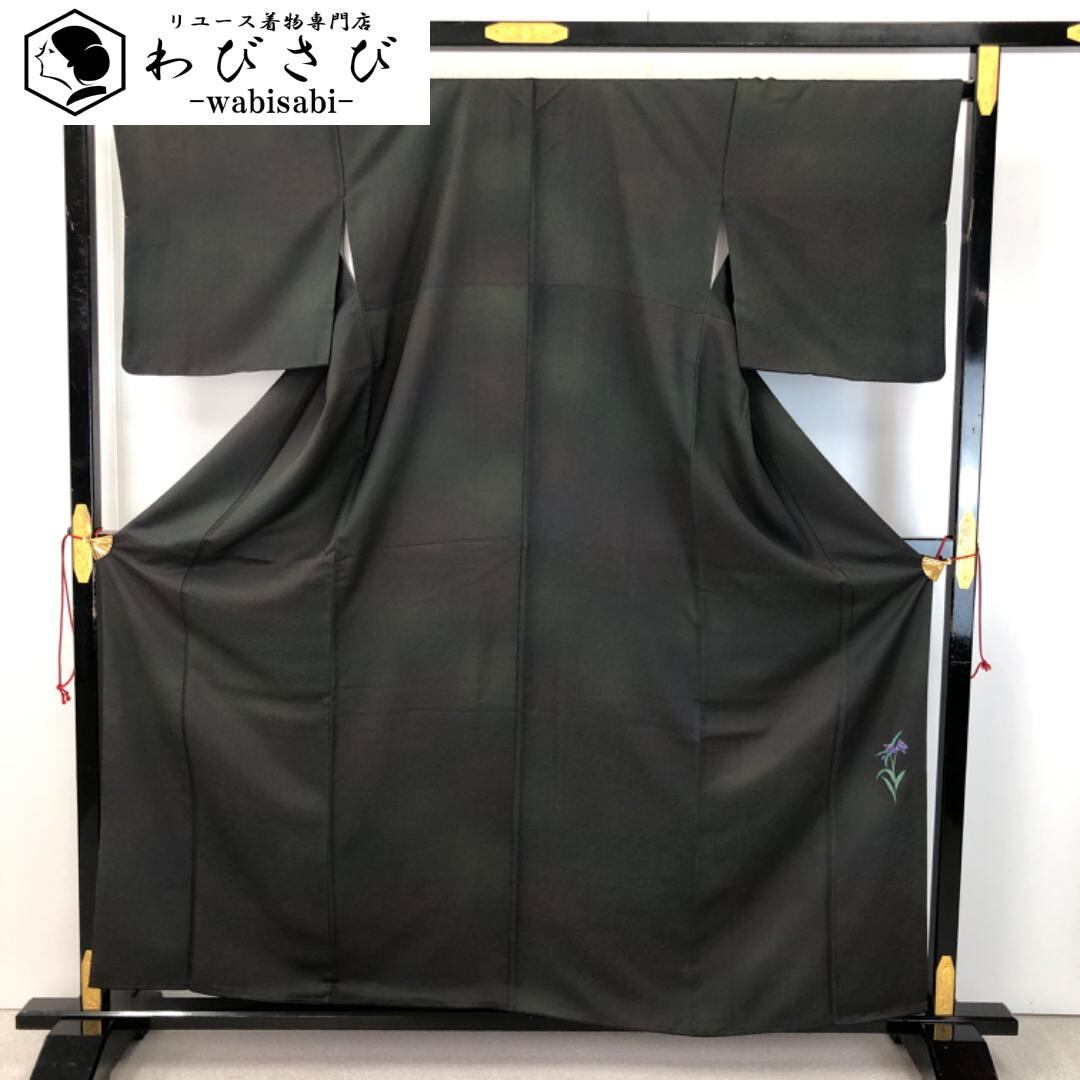 黒橡色ベースの赤味がかった暈しのお色味、右衽、八掛にさりげなく菖蒲の花模様がデザインされた素敵なお品でございます。