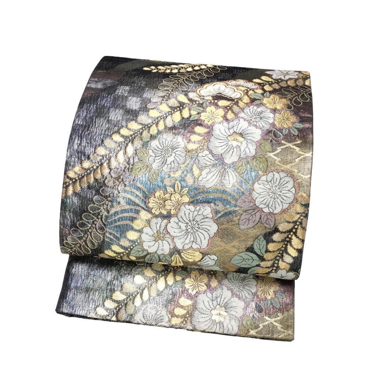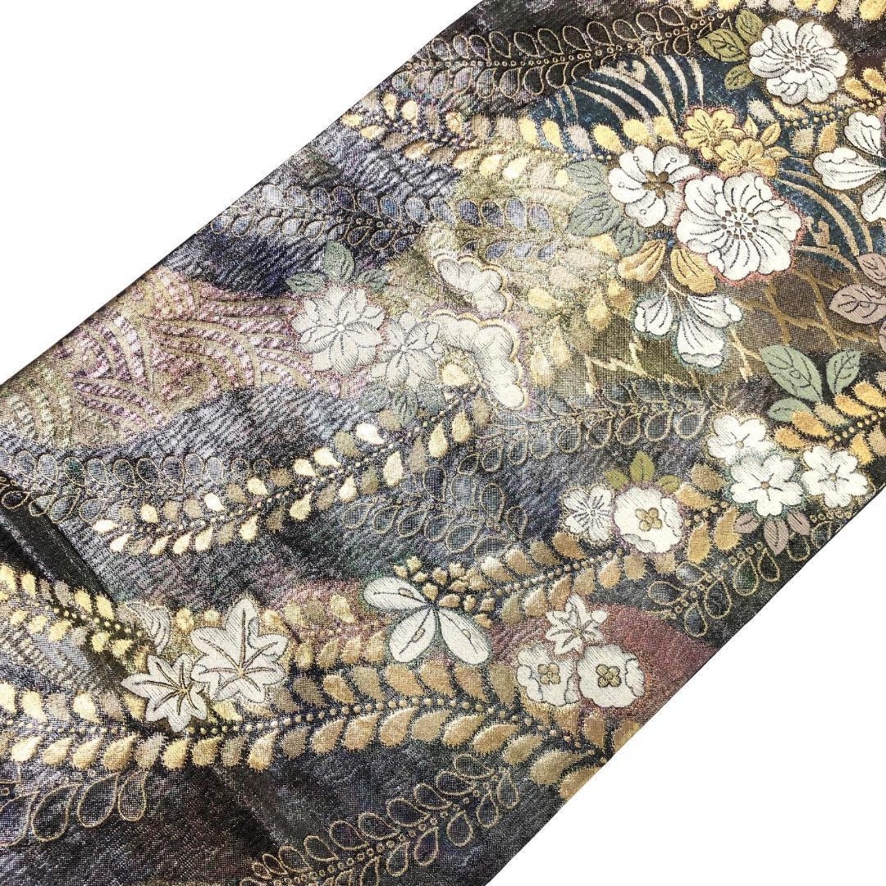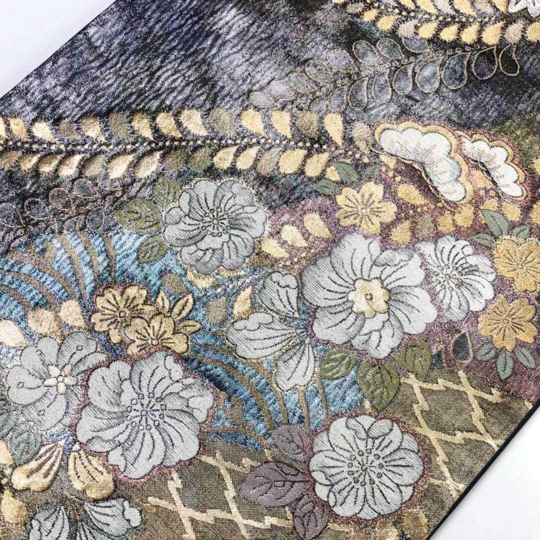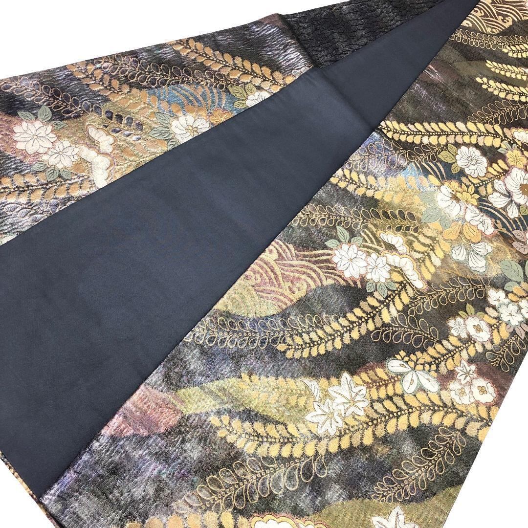 貝墨色ベースの煌びやかなお色味に辻が花、松、紅葉、楓、流水などの柄行がデザインされた素敵なお品でございます。