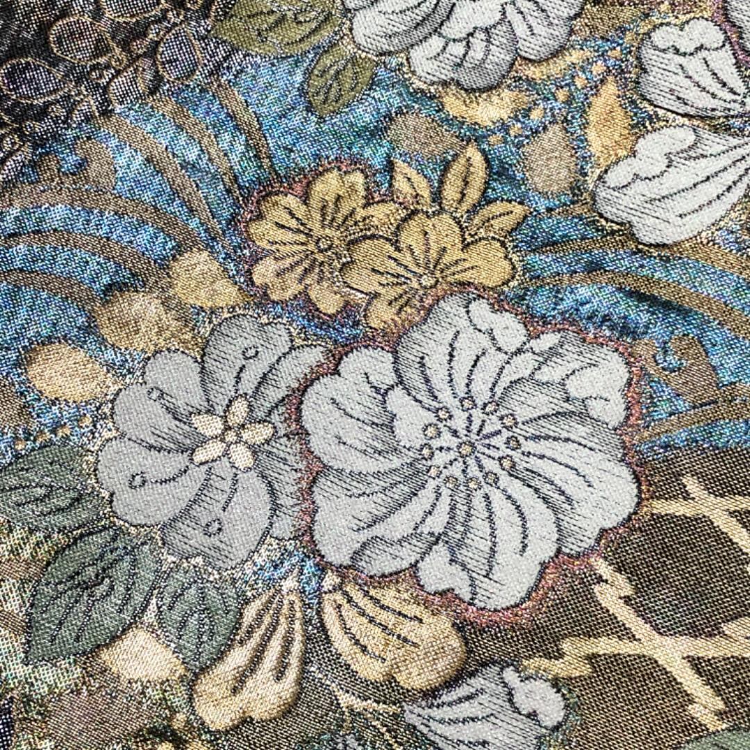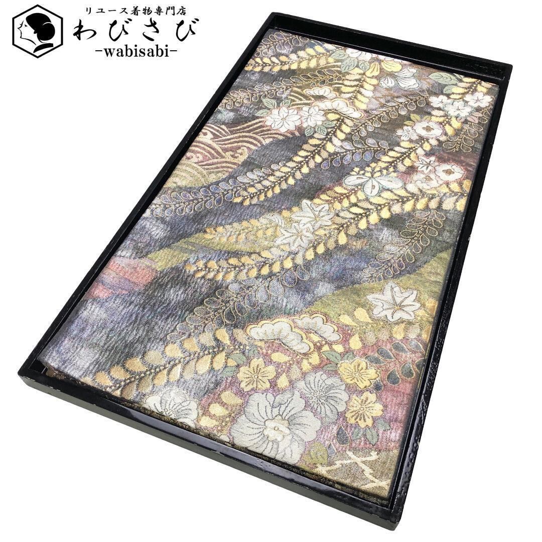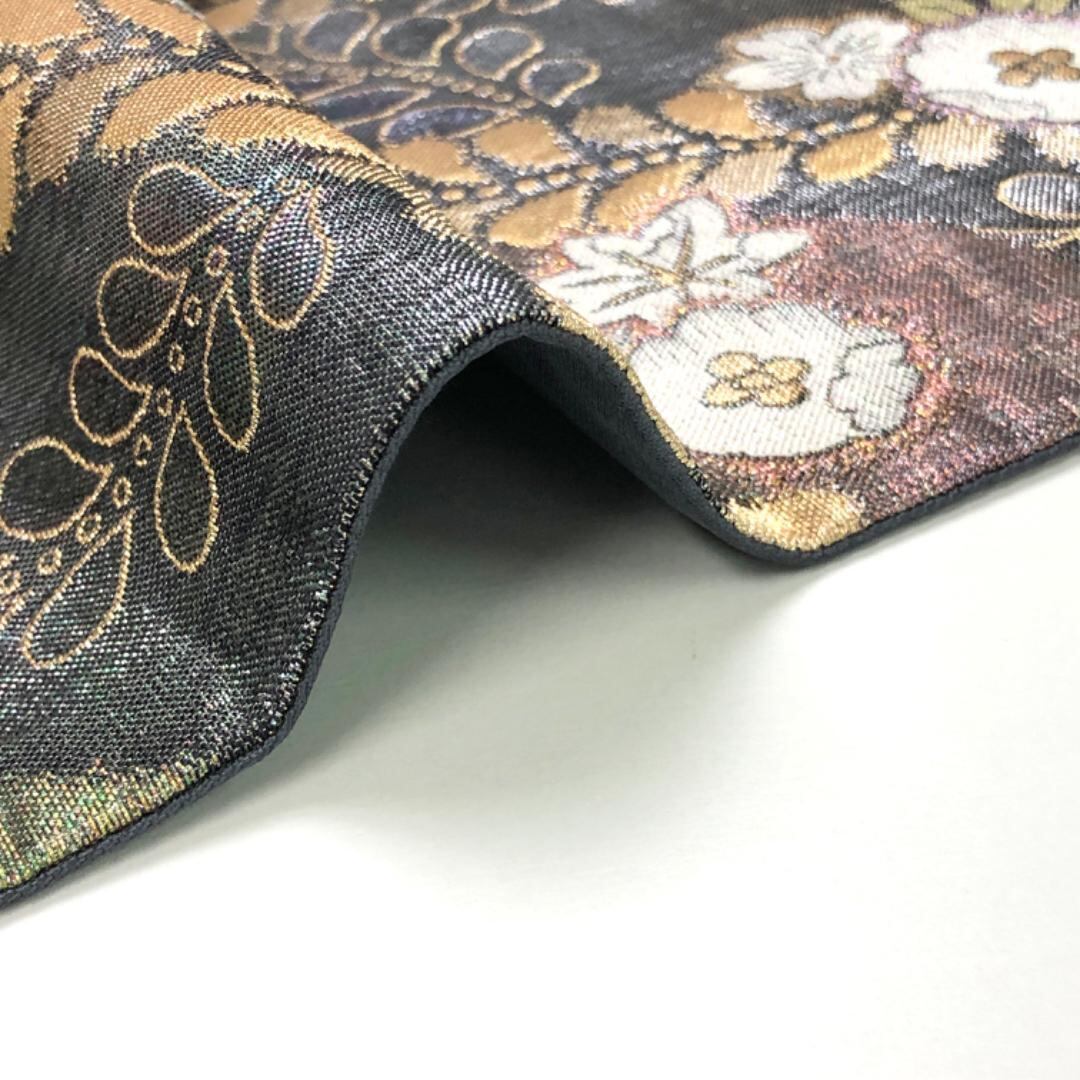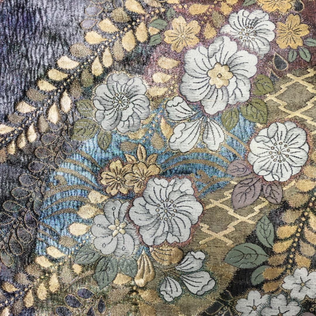 貝墨色ベースの煌びやかなお色味に辻が花、松、紅葉、楓、流水などの柄行がデザインされた素敵なお品でございます。