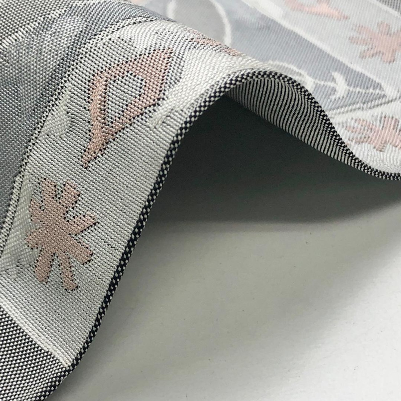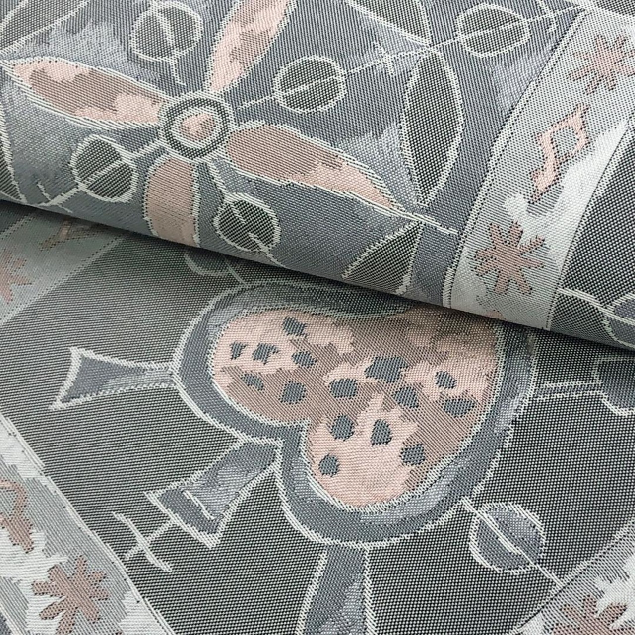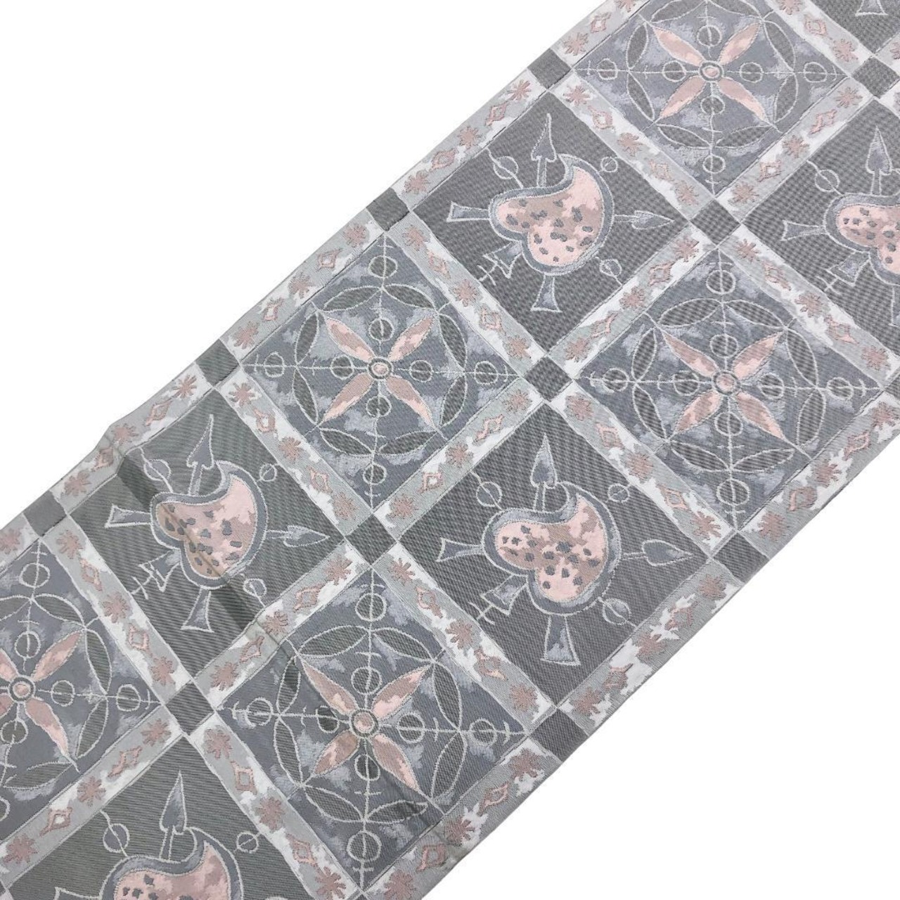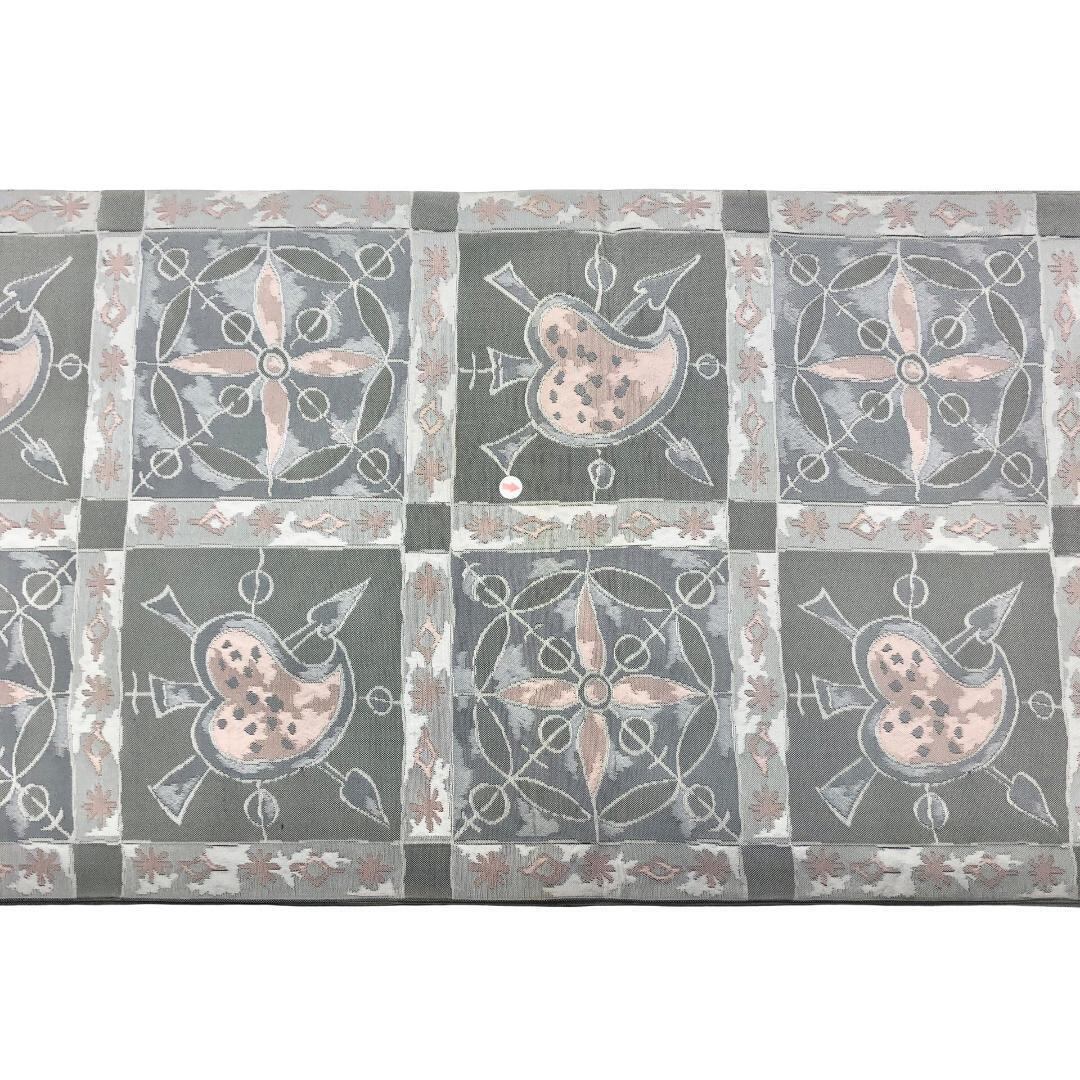 灰色ベースのお色味にスペードのような抽象柄がデザインされた素敵な柄裄のお品でございます。