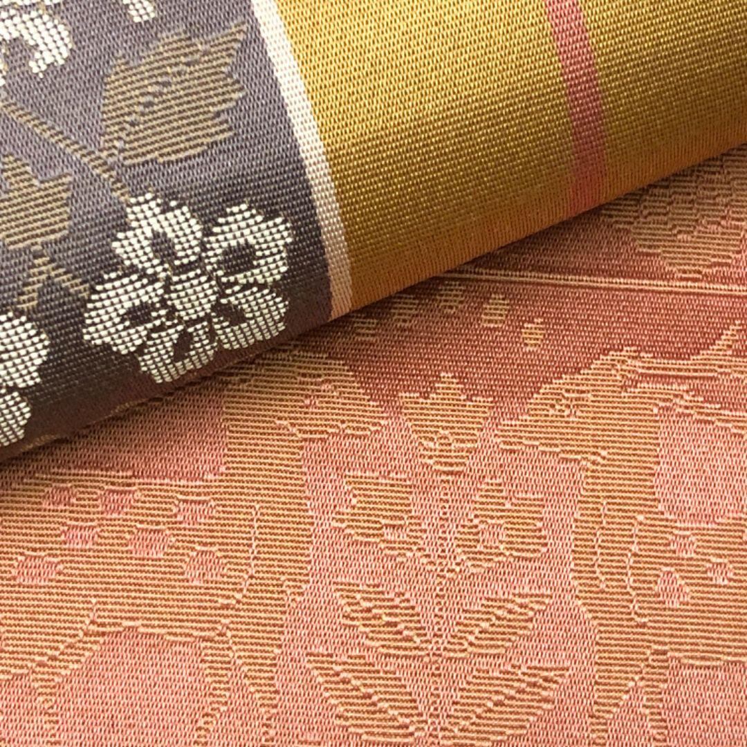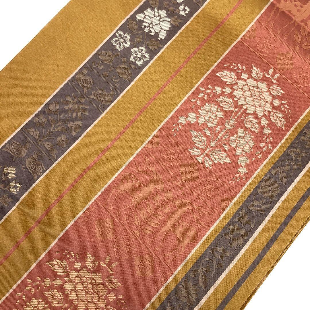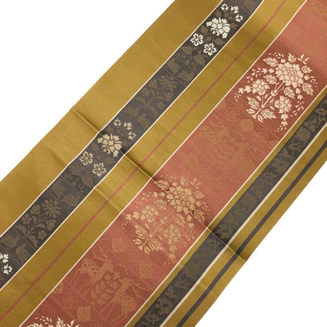 名古屋帯 縦縞模様 向かい鹿 花模様 黄土色 O-5583 着物 きもの kimono 和服 和装 中古 リサイクル着物 【送料無料】