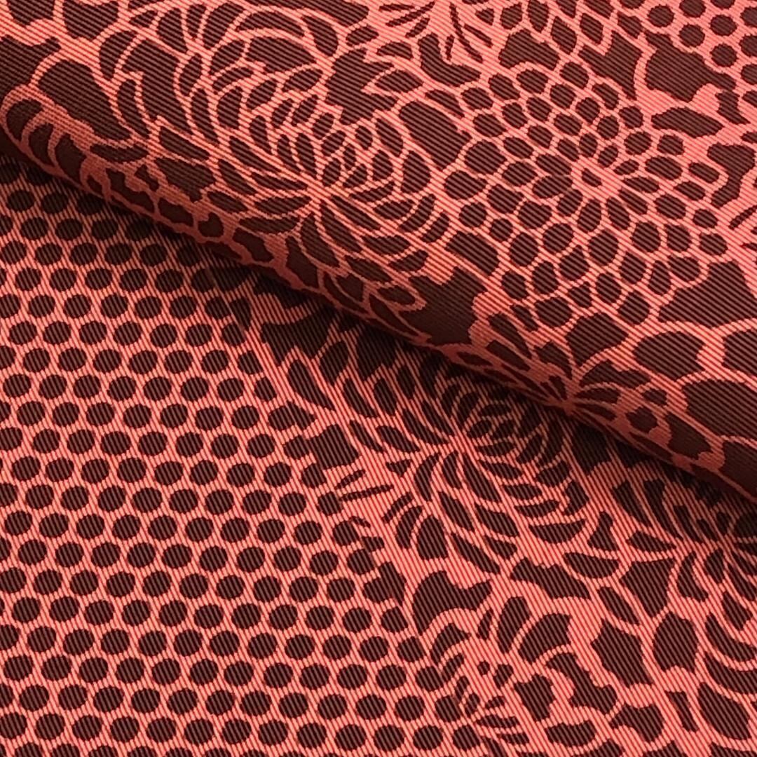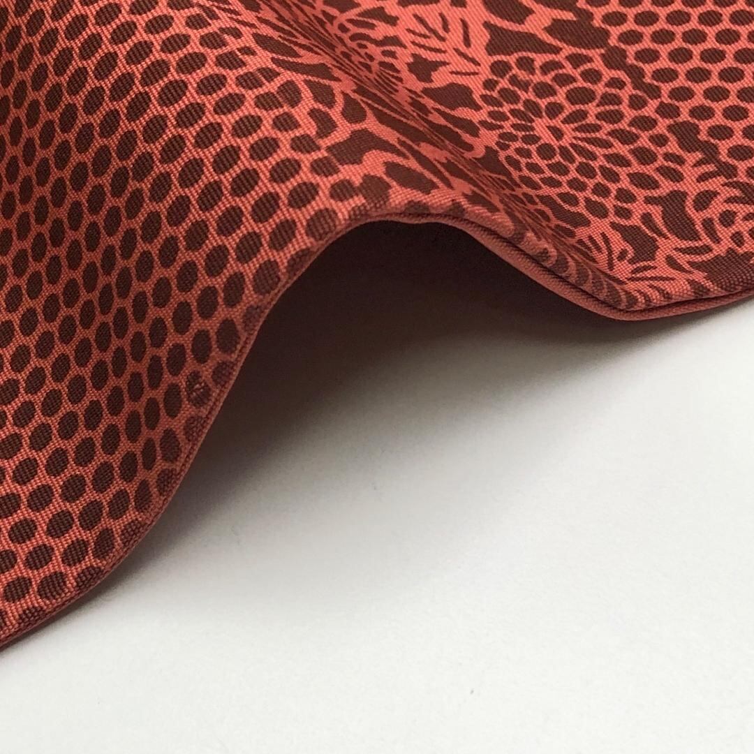 弁柄色のお色味の塩瀬に菊の花模様がデザインされた雰囲気の良い素敵な柄裄のお品でございます。