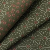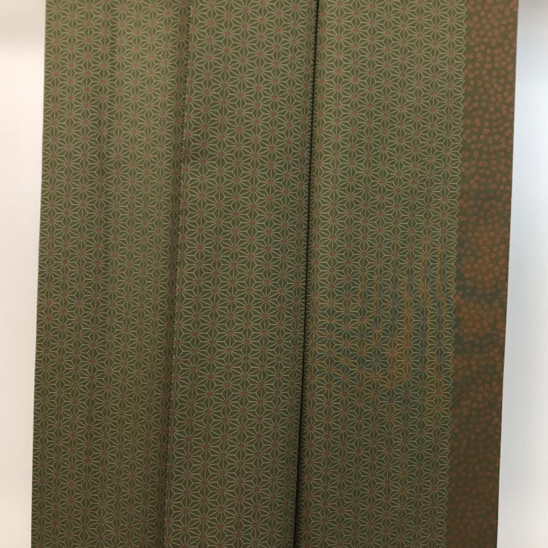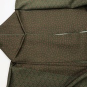 薩摩鼠色の落ち着きのあるお色味に縦縞模様に麻の葉、小花柄がデザインされた素敵なお品でございます。
