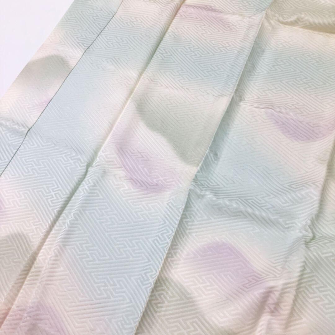 卯の花色のお色味に紗綾形地模様、遠山模様の柄裄がデザインされた素敵なお品でございます。