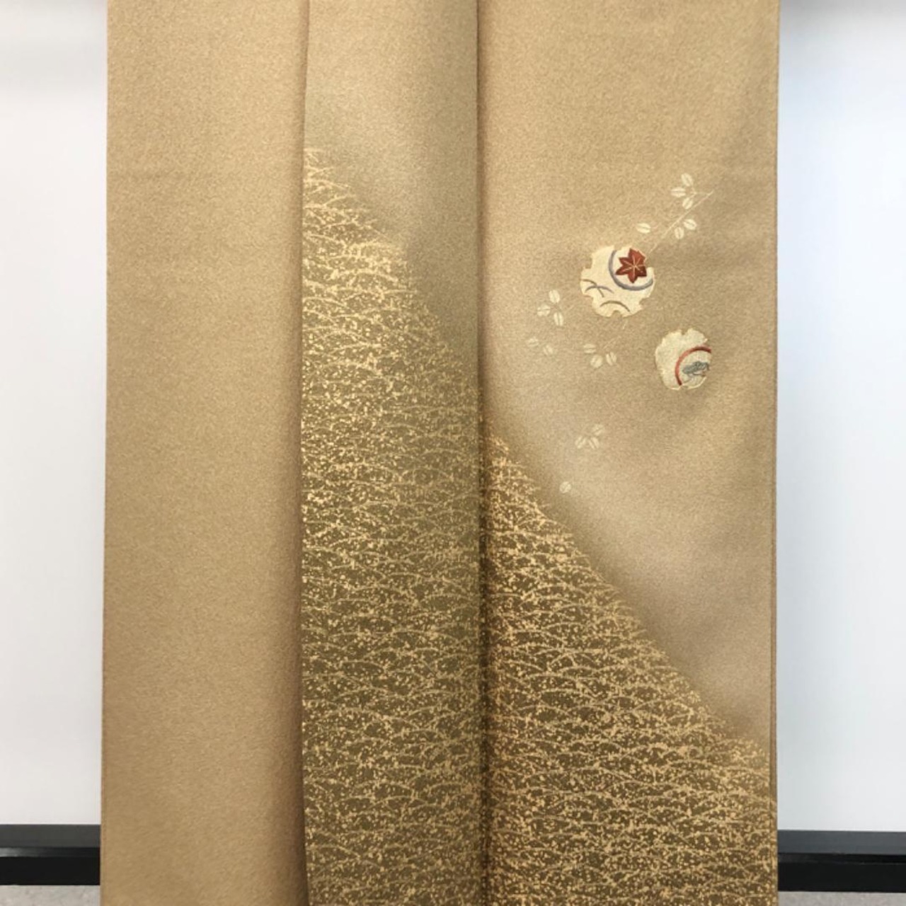 藁色の品のあるお色味に刺繍、金駒、金彩が使われた雪輪に花模様がデザインされた素敵な柄裄のお品でございます。