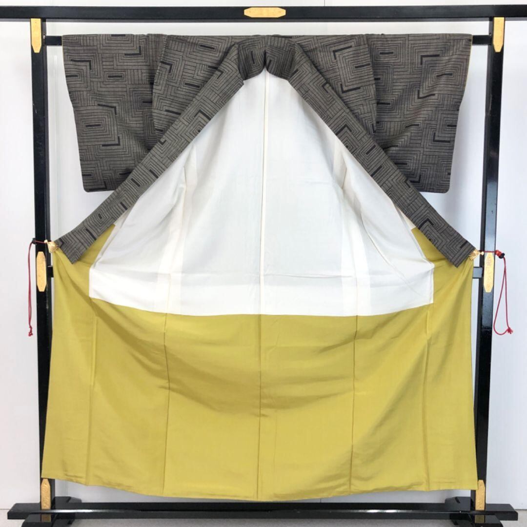 本場大島紬 茶泥染 一元5マルキ 四角模様 K-5475 着物 きもの kimono 和服 和装 中古 リサイクル着物 【送料無料】