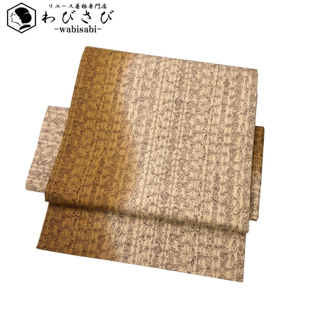 山吹鼠色ベースのグラデーションのお色味に縦縞花唐草模様がデザインされた雰囲気の良い素敵なお品でございます。
