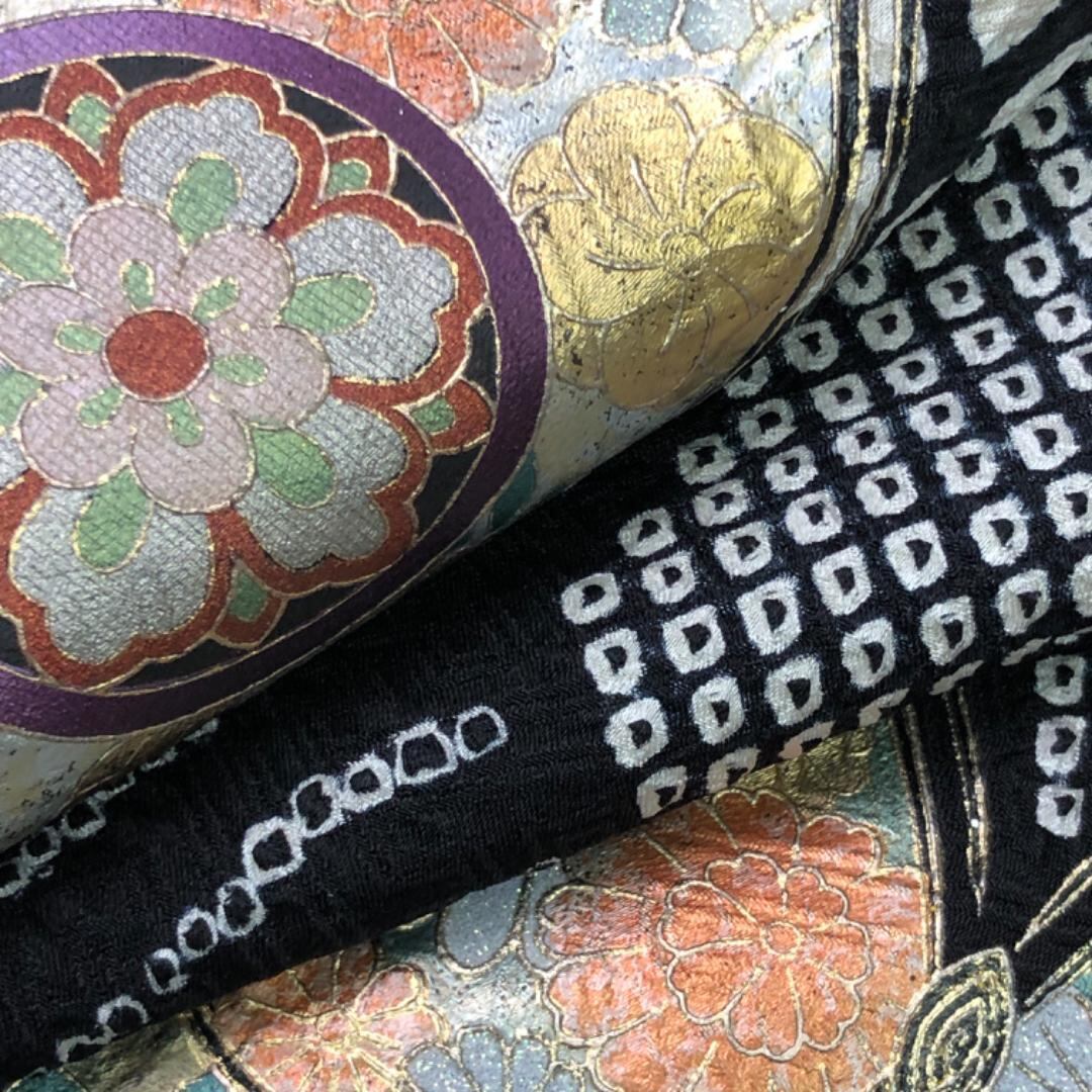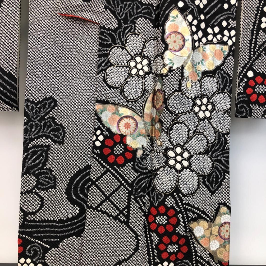黒色のモノトーンベースのお色味に、波模様、蝶々、花模様などの素敵な柄裄がデザインされた素敵なお品でございます。