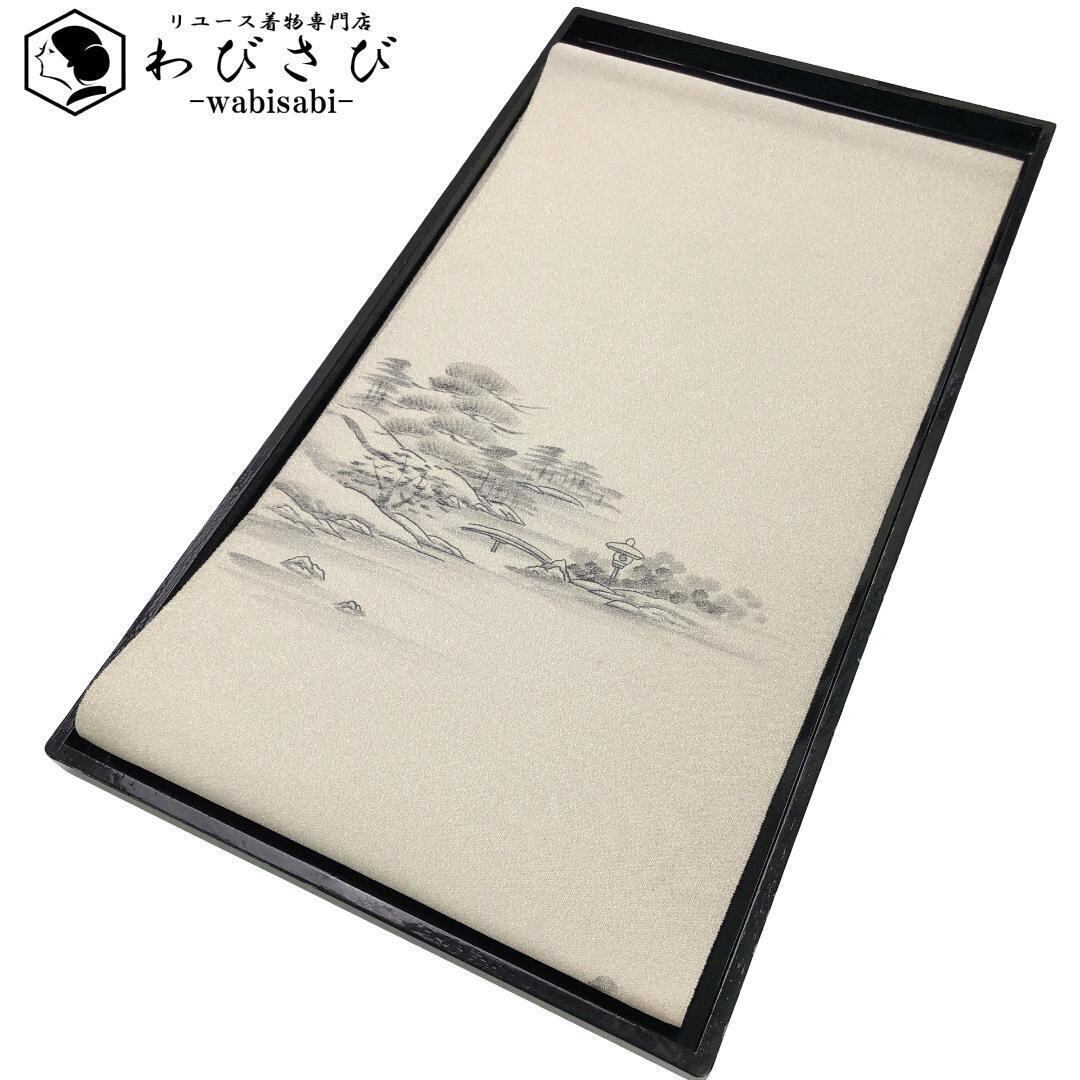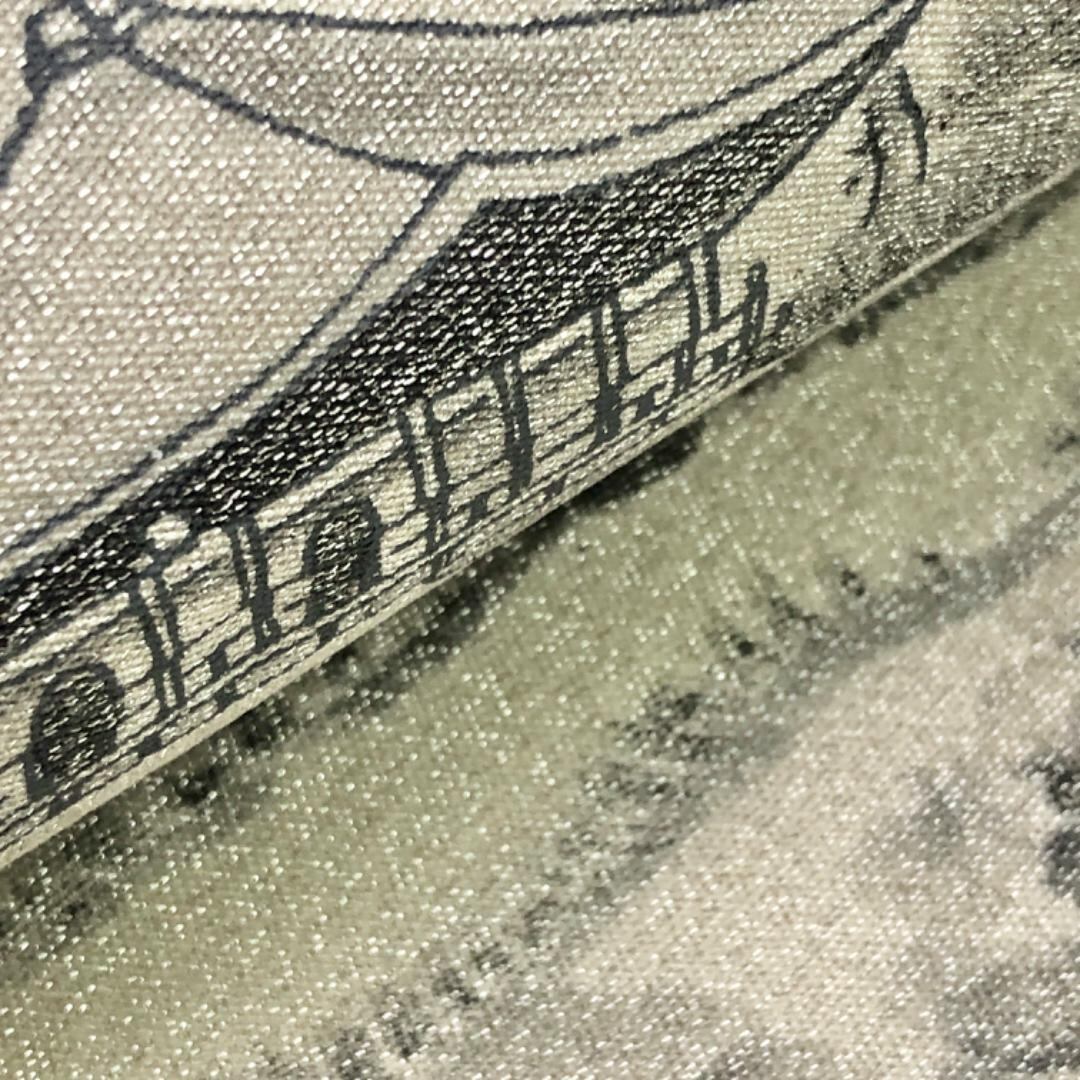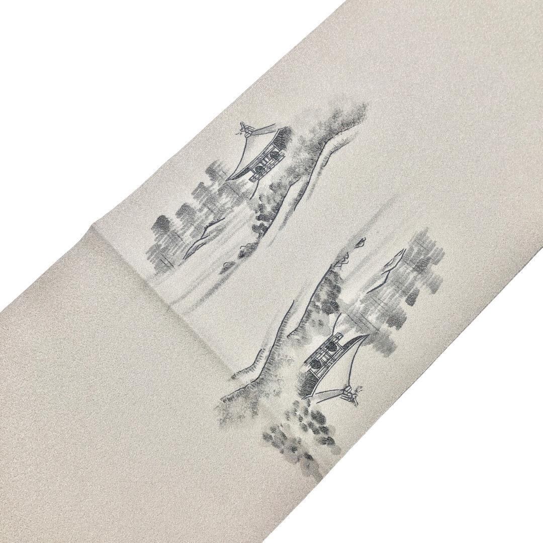 薄絹鼠色の上品なお色味に金閣寺の手描きの柄行がデザインされた素敵なお品でございます。
