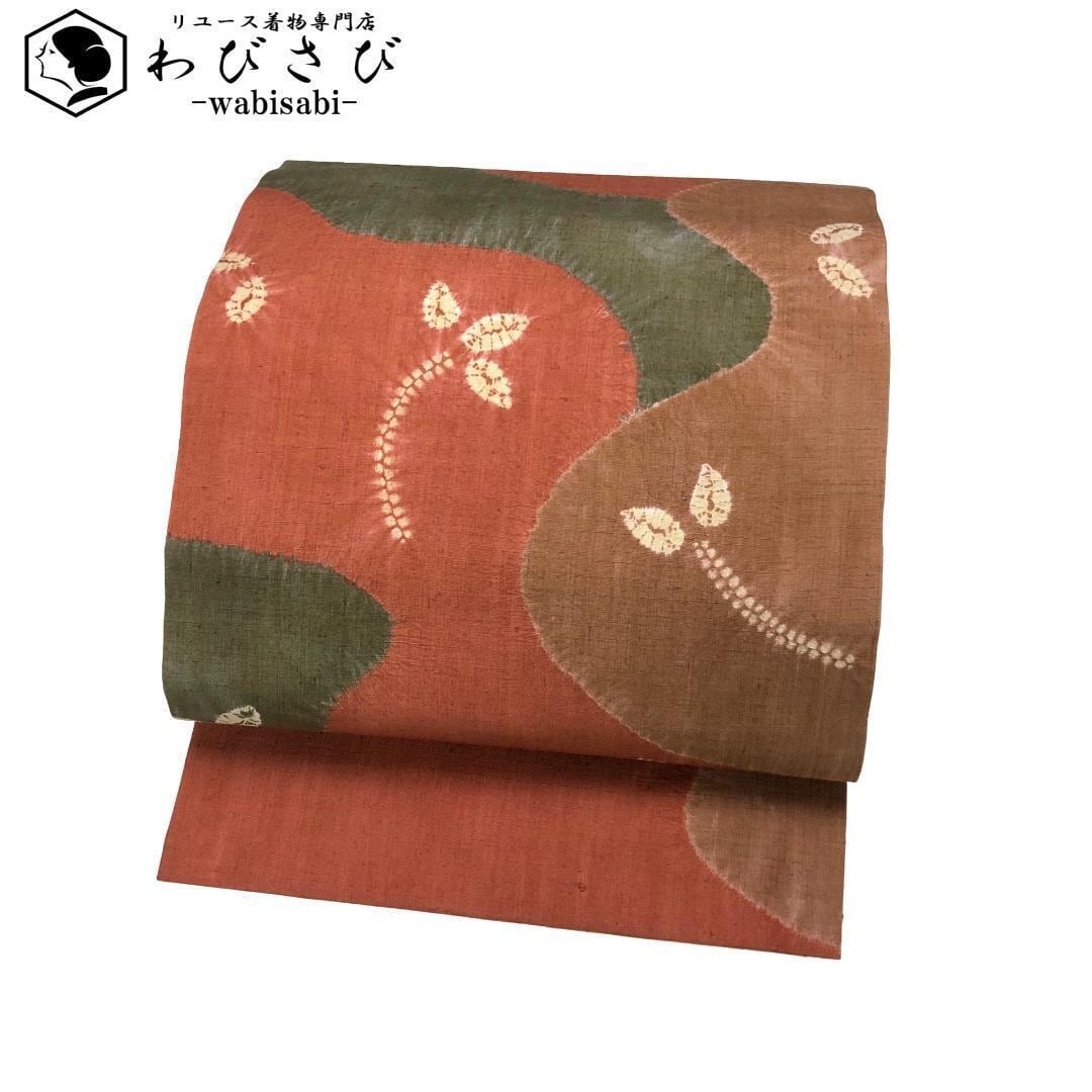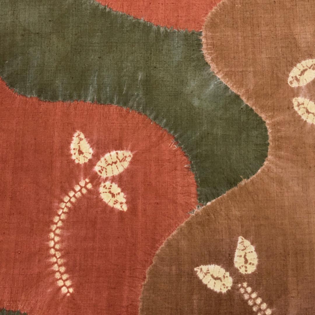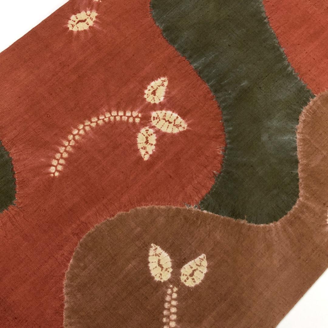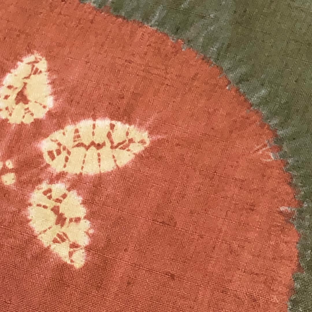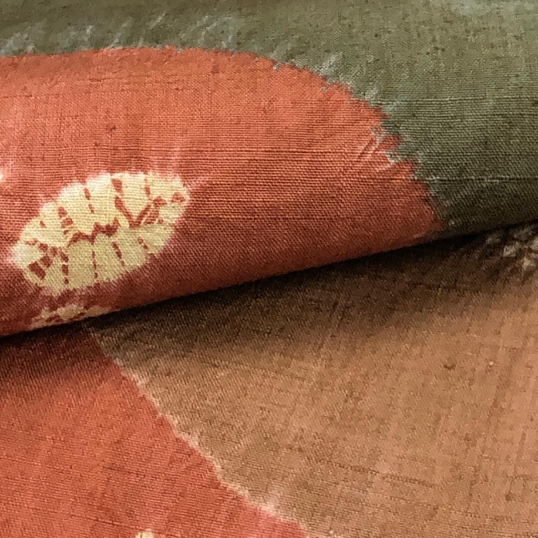 樺色ベースの落ち着きのあるお色味に絞り柄の葉模様がデザインされた素敵な柄裄のお品でございます。