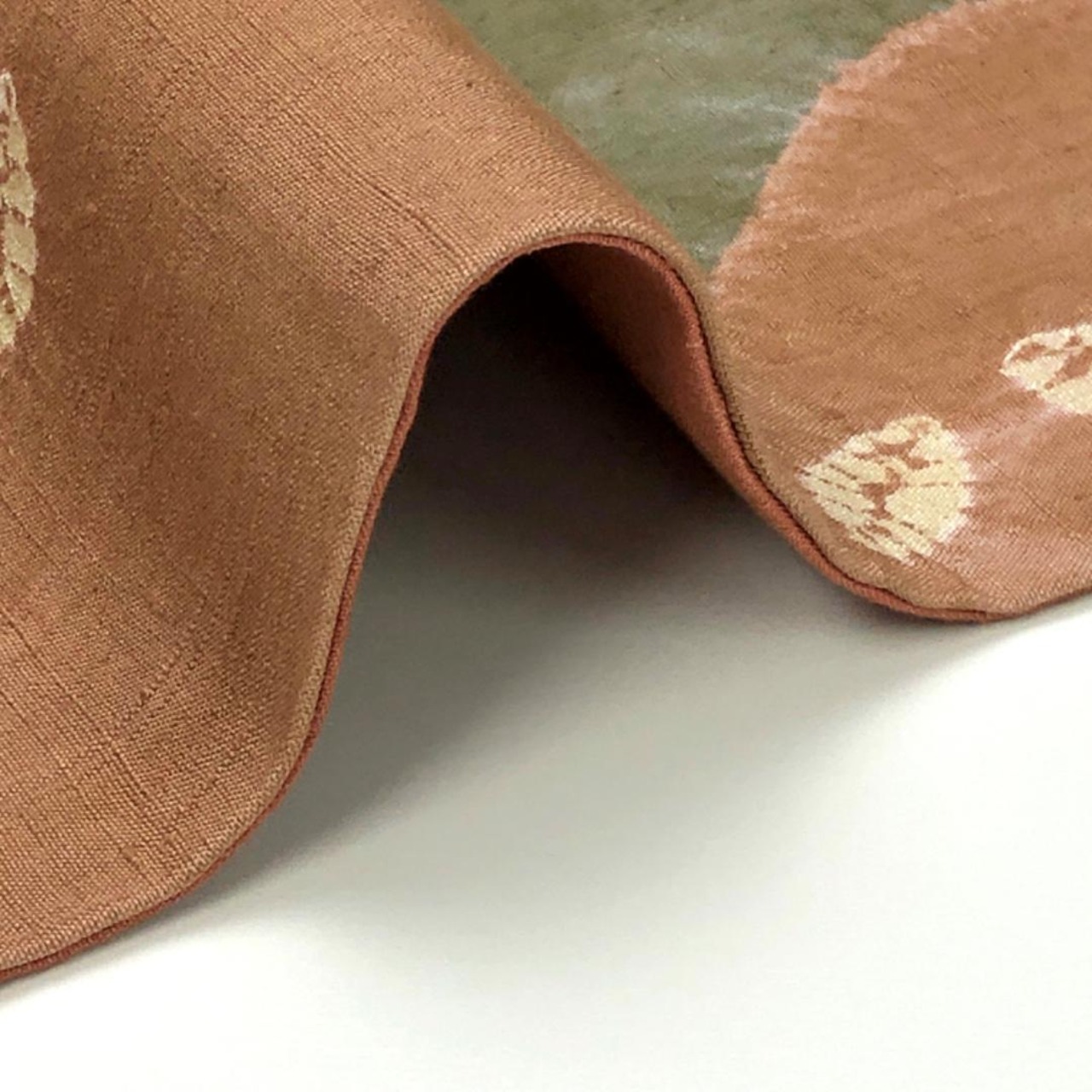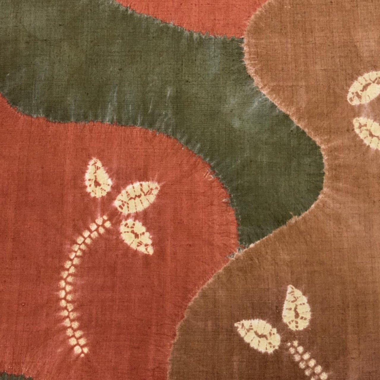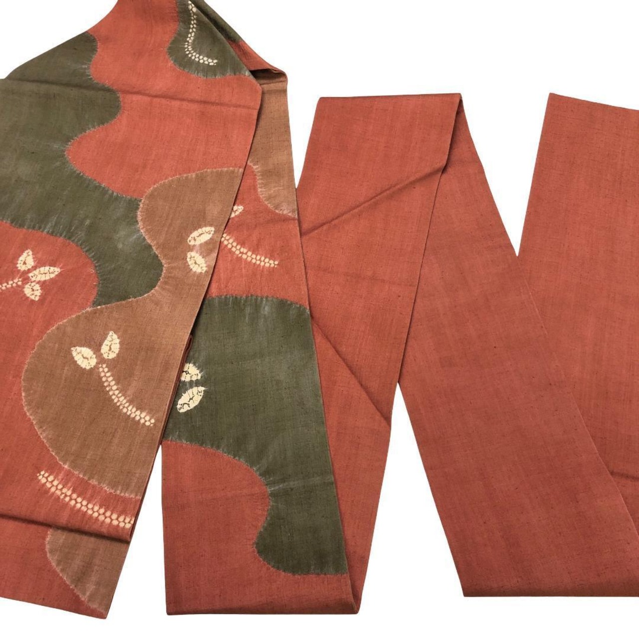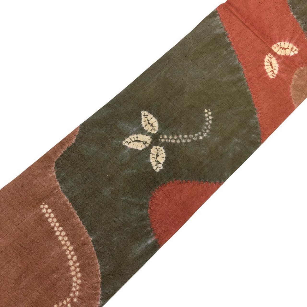 樺色ベースの落ち着きのあるお色味に絞り柄の葉模様がデザインされた素敵な柄裄のお品でございます。