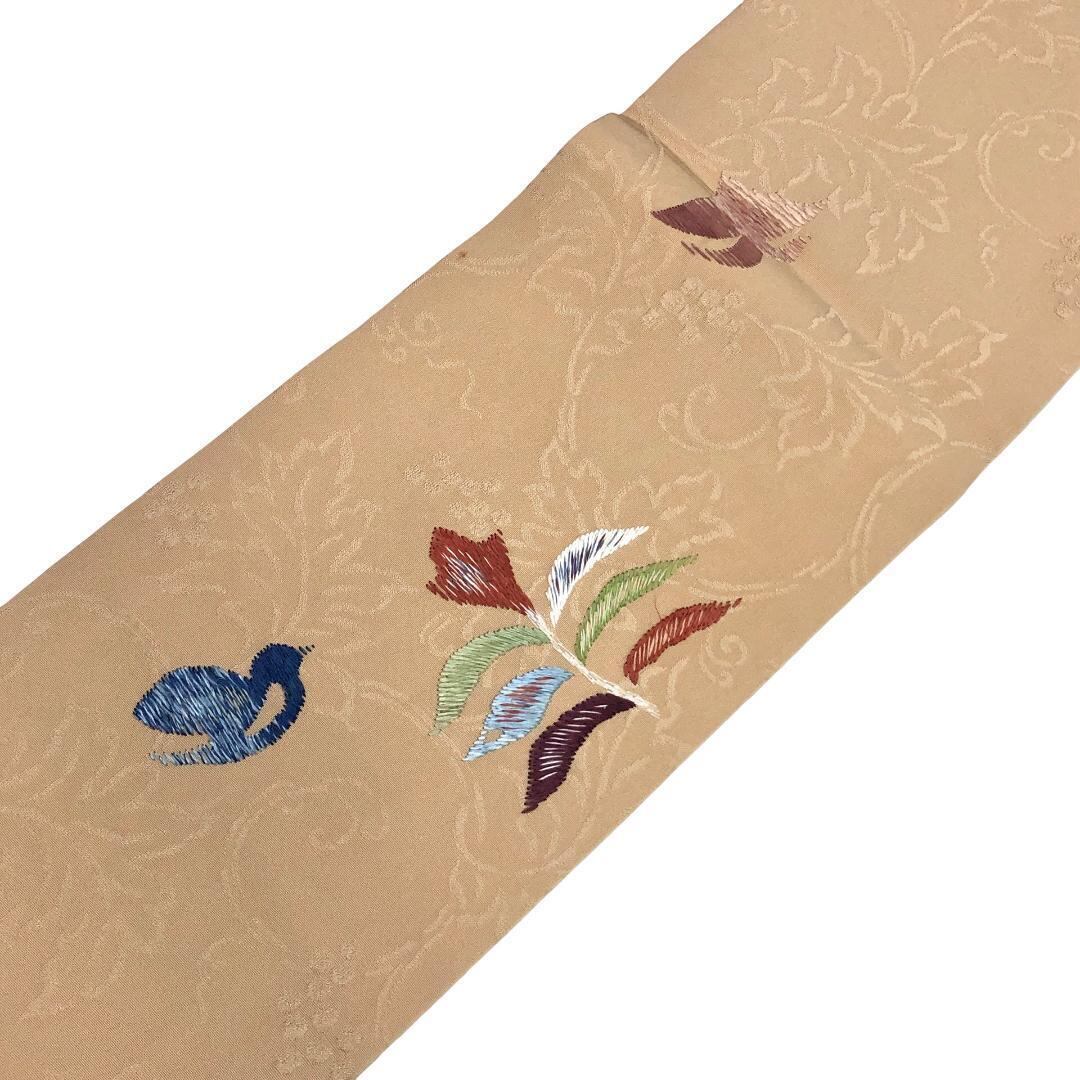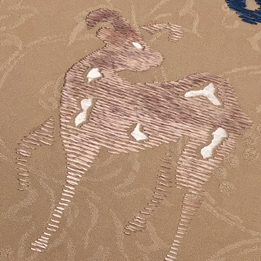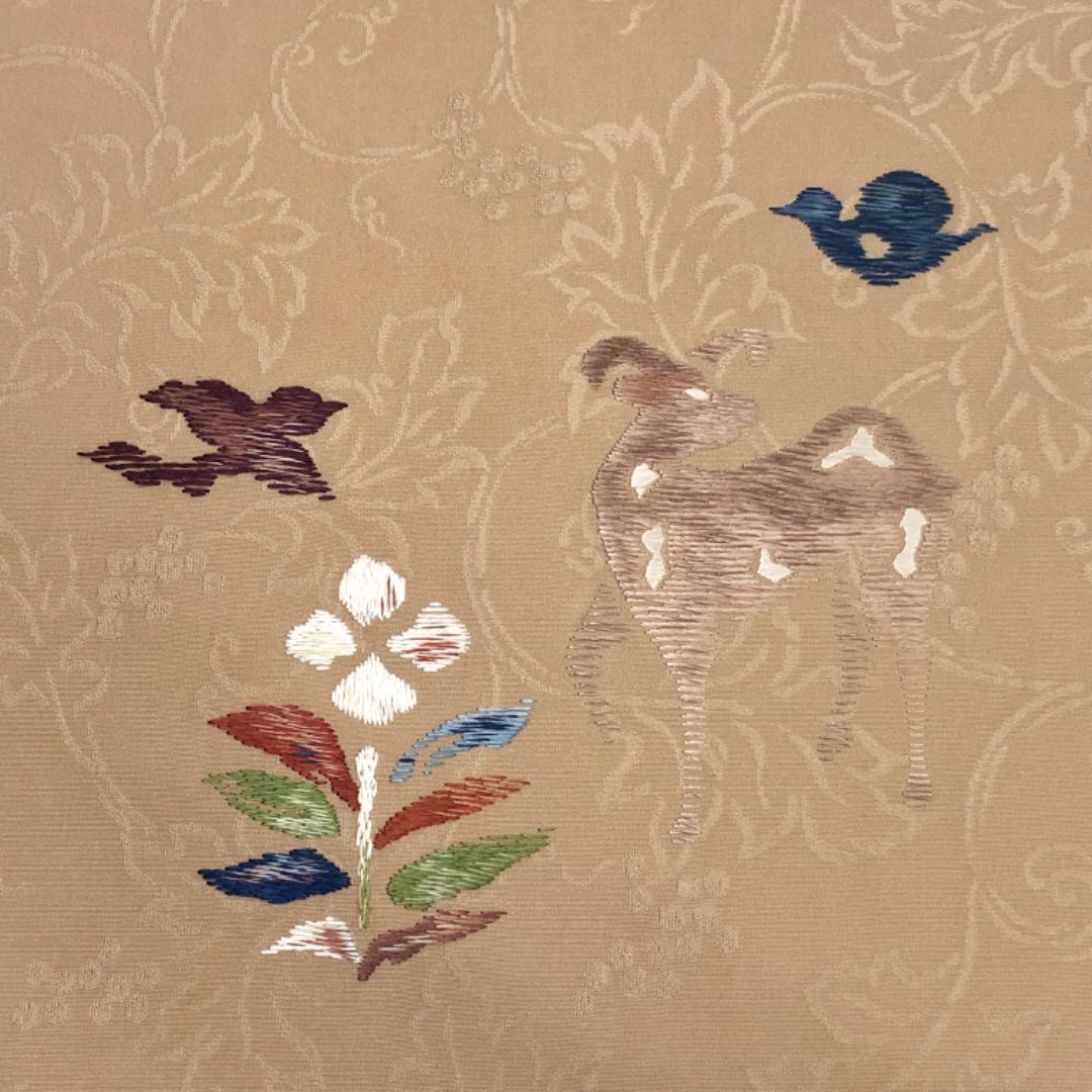 土器色のお色味に刺繍の鹿、鳥、花柄模様がデザインされた素敵な柄裄のお品でございます。