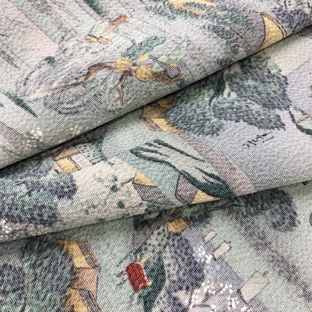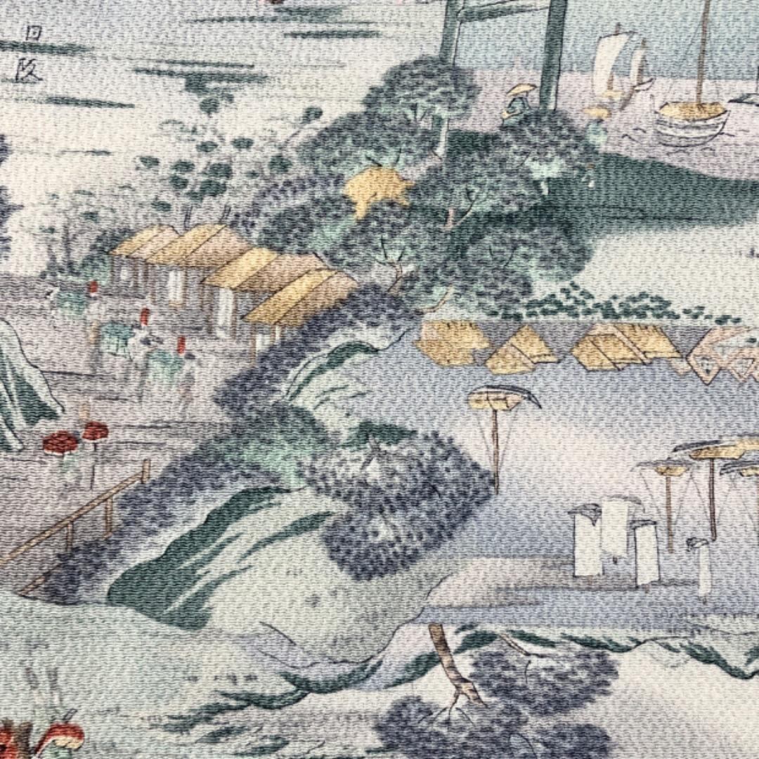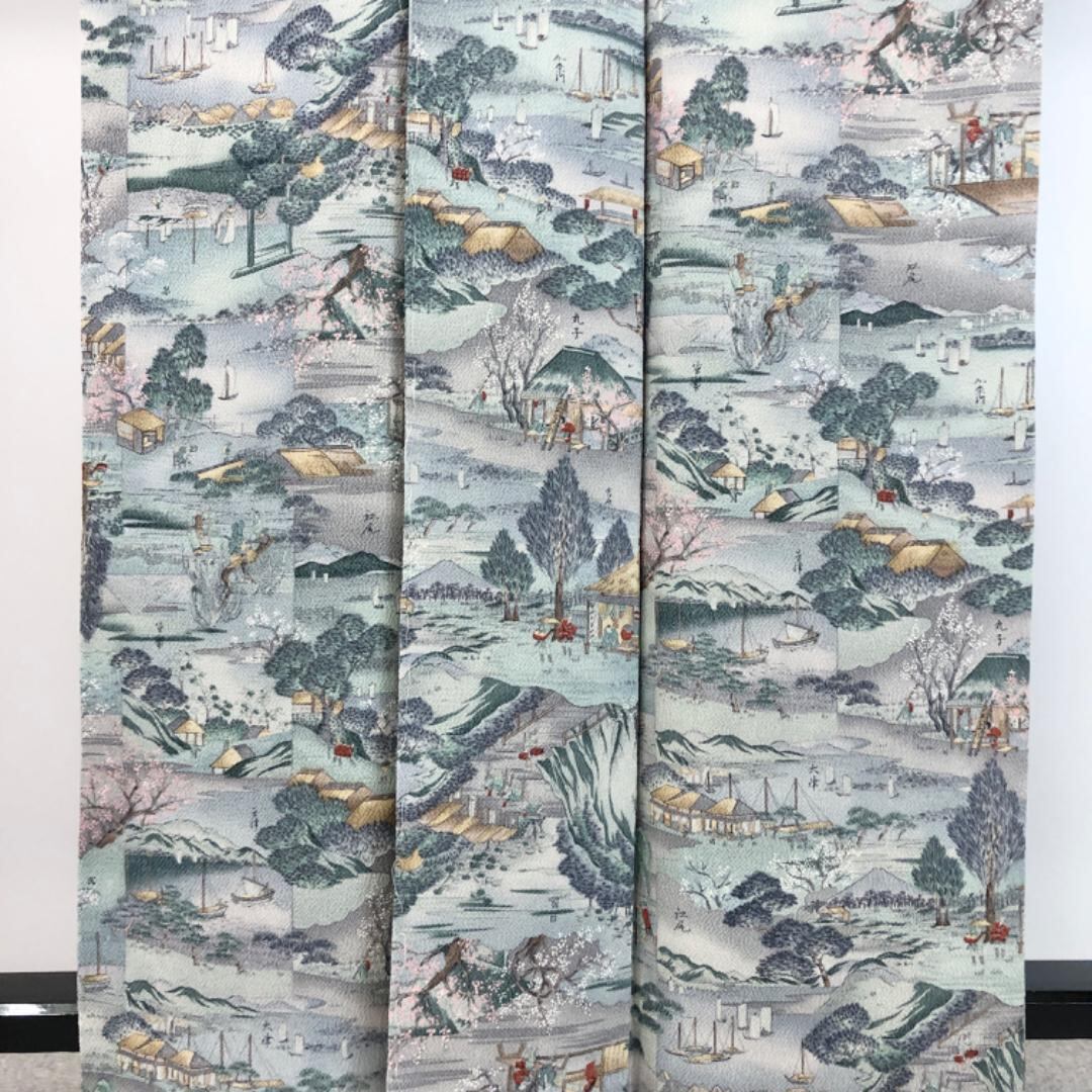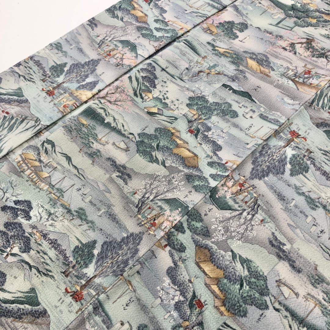 青白磁色の縮緬地に東海道五拾三次の柄裄がデザインされた雰囲気の良い素敵なお品でございます。
