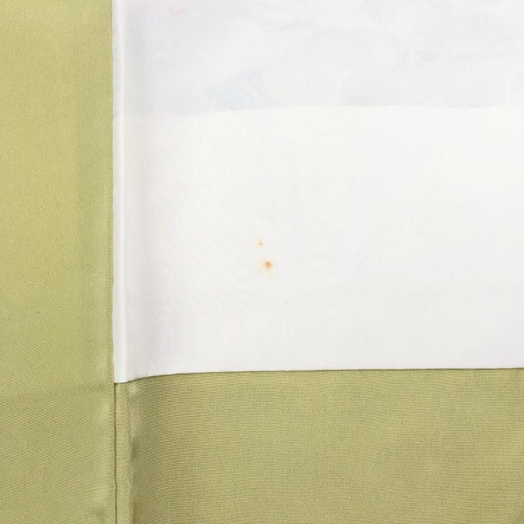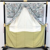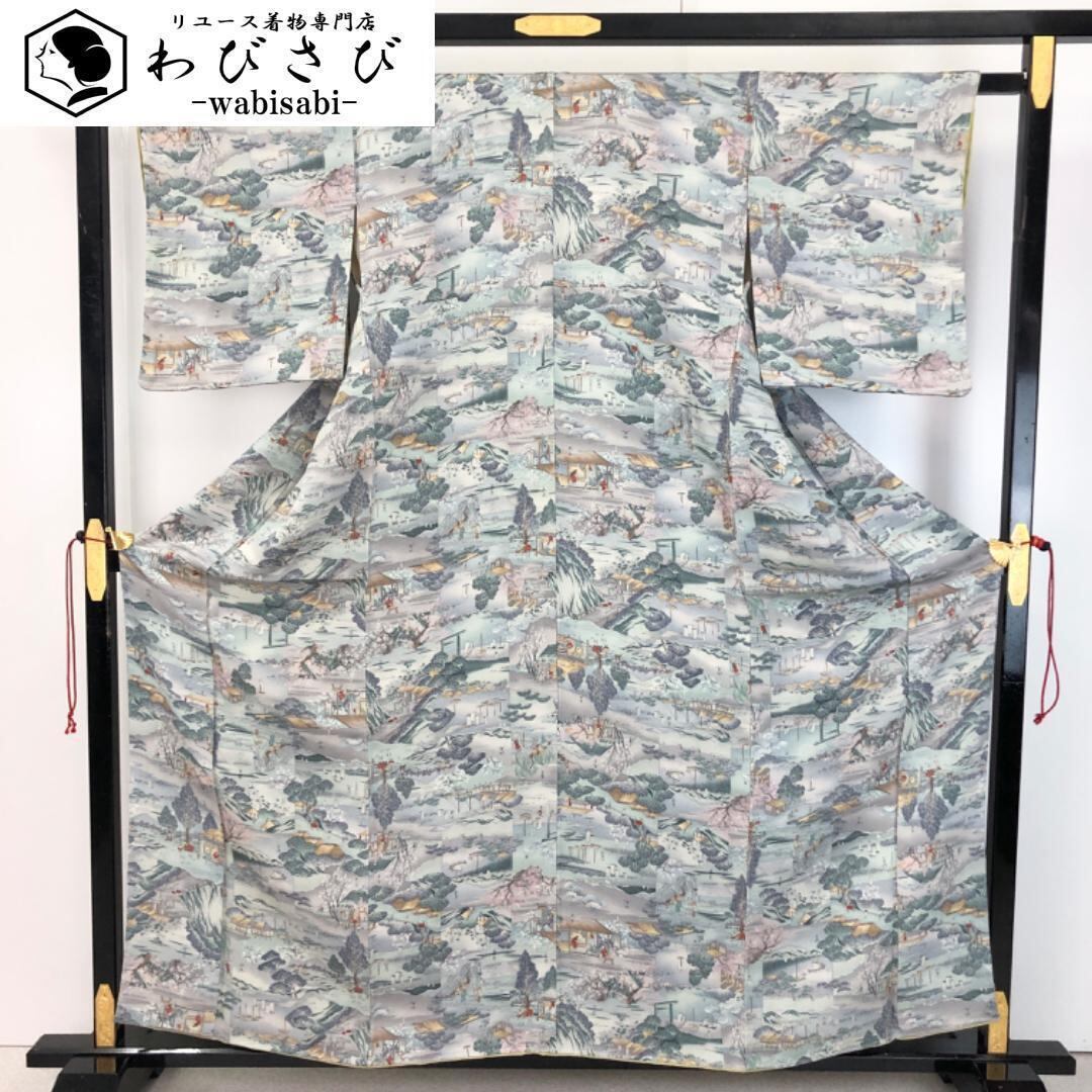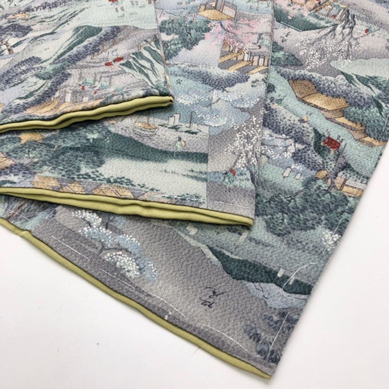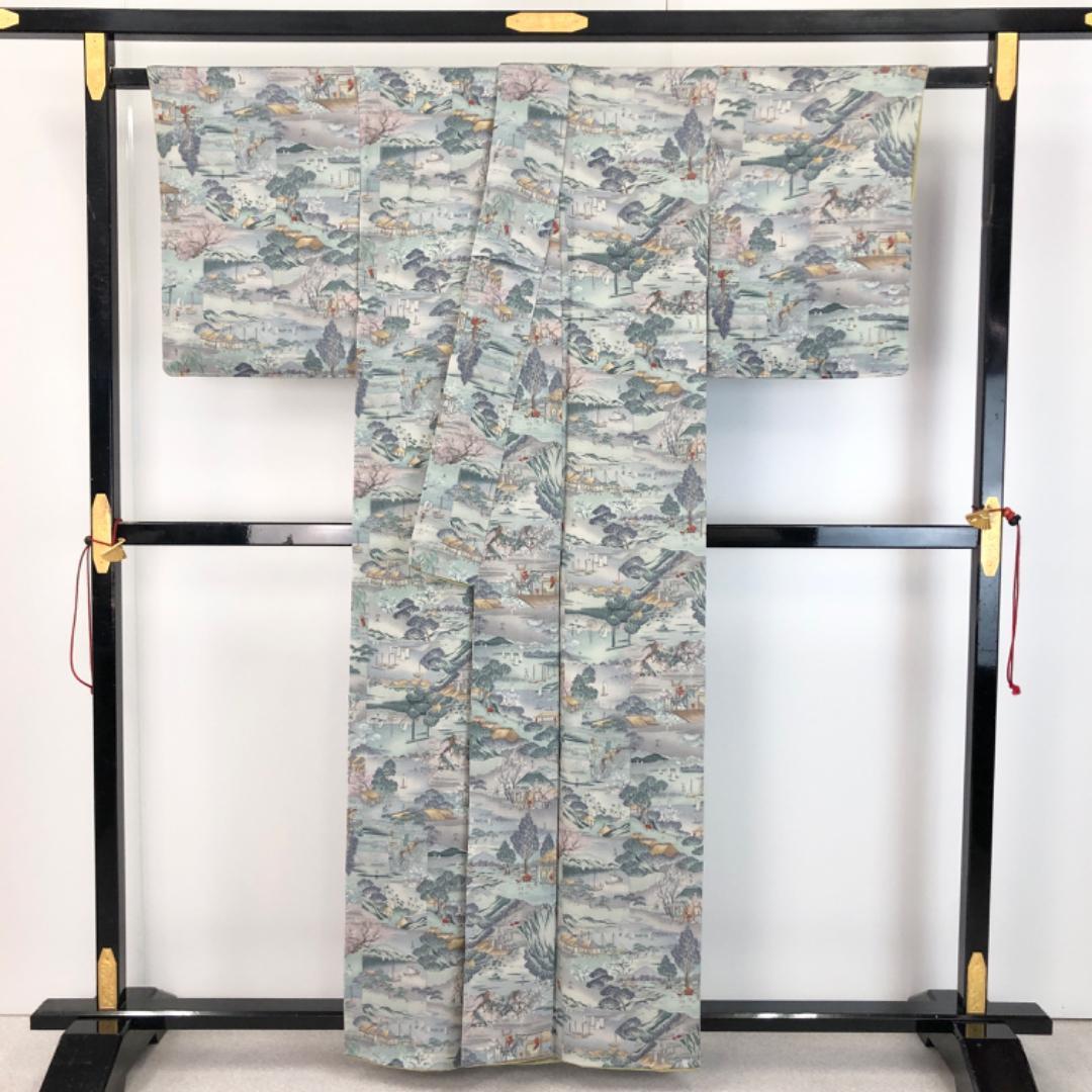 青白磁色の縮緬地に東海道五拾三次の柄裄がデザインされた雰囲気の良い素敵なお品でございます。