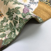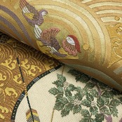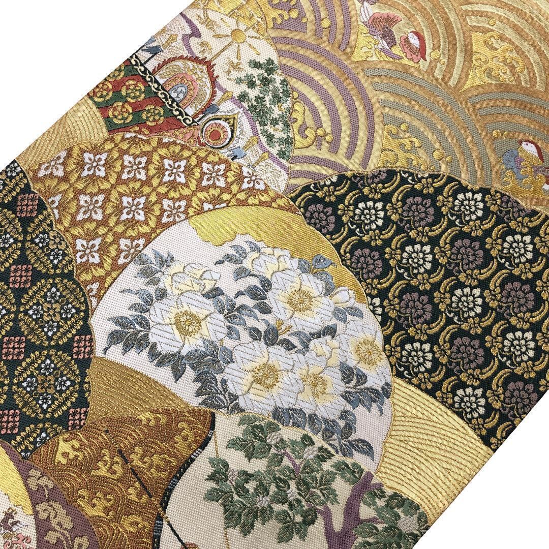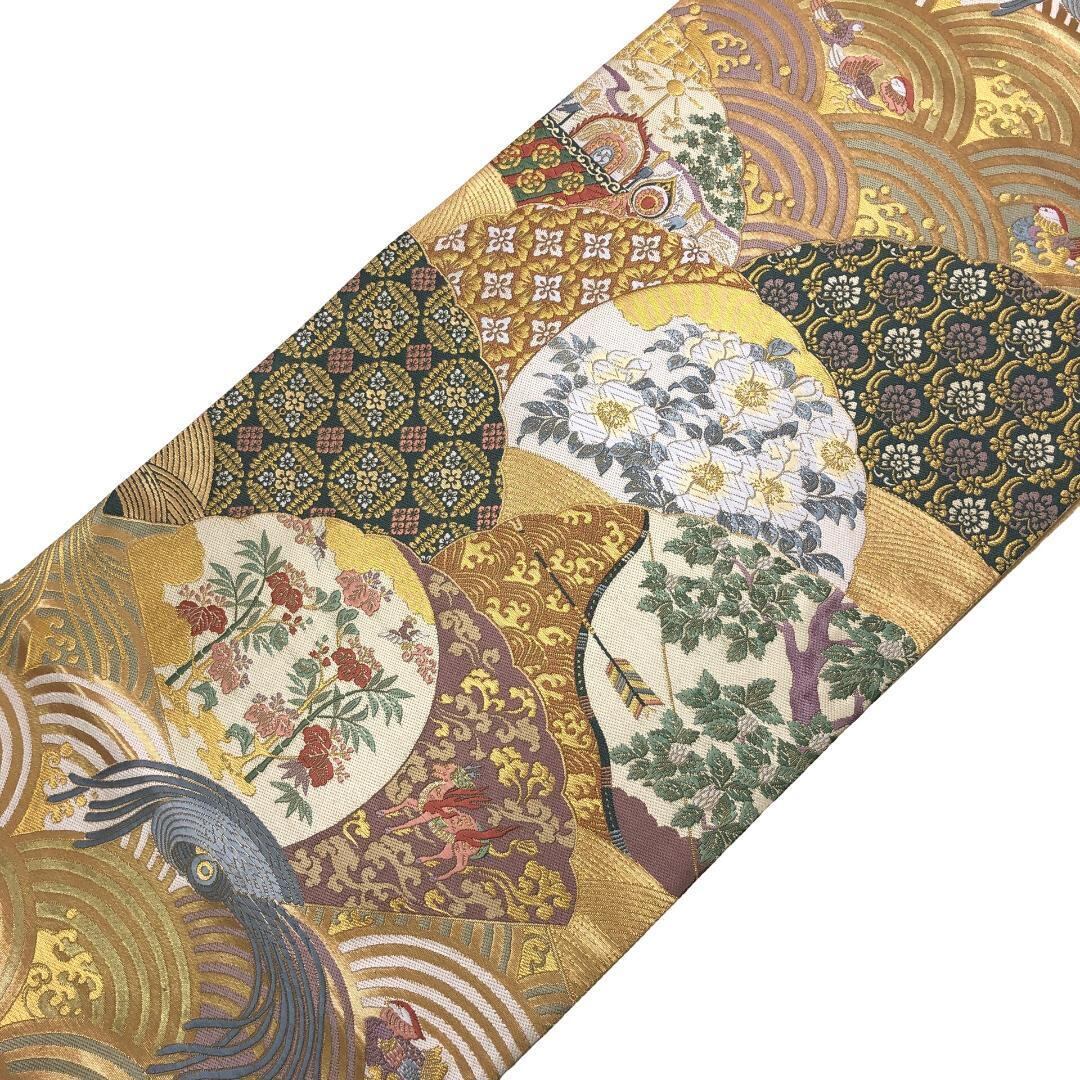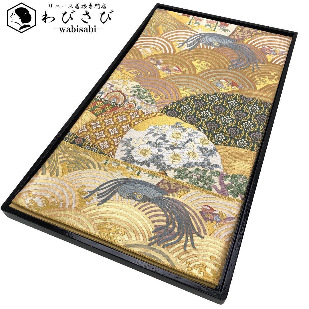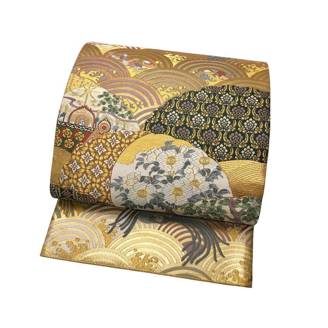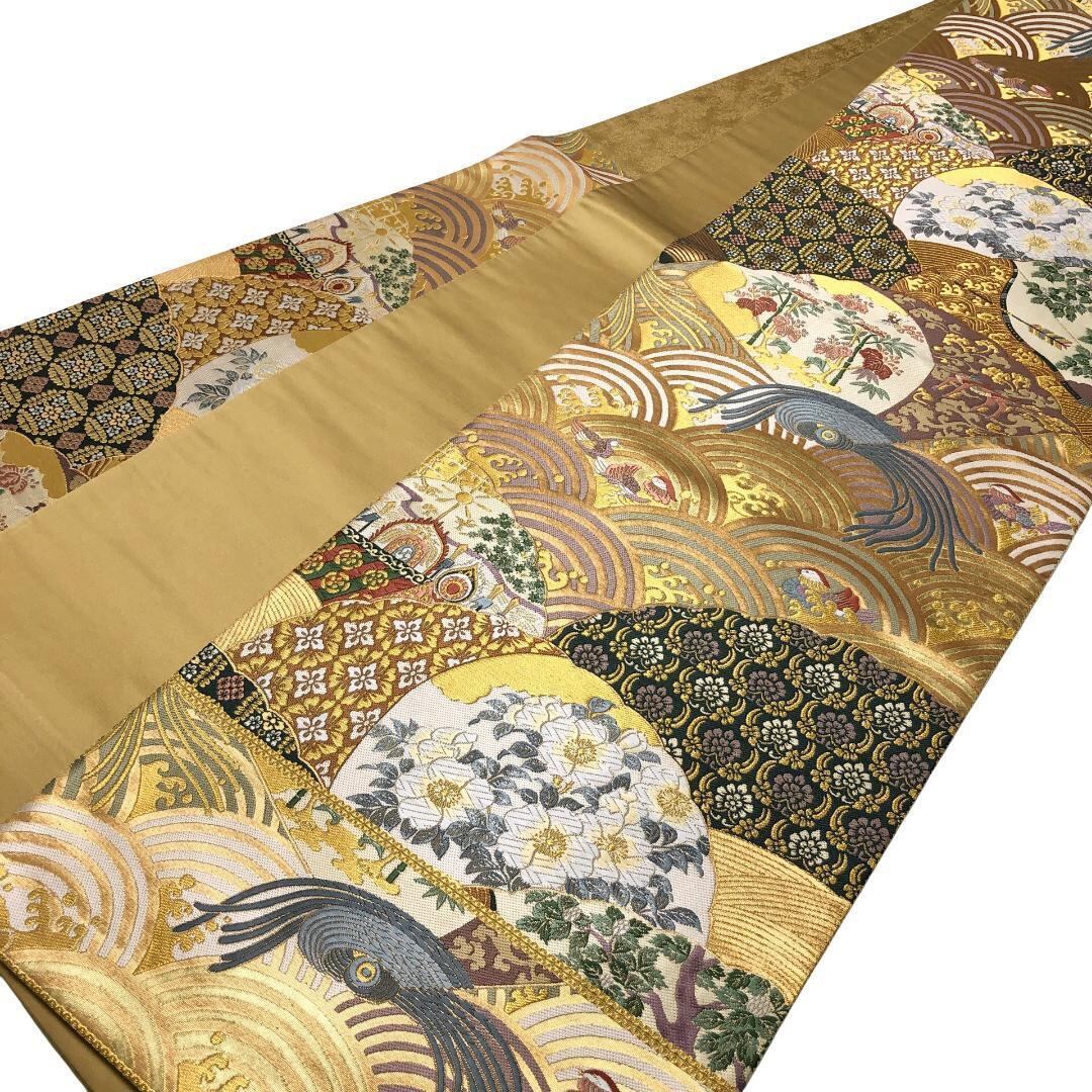 金色ベースのお色味に花模様、青海波、鴛鴦などの美しい柄裄がデザインされた素敵なお品でございます。