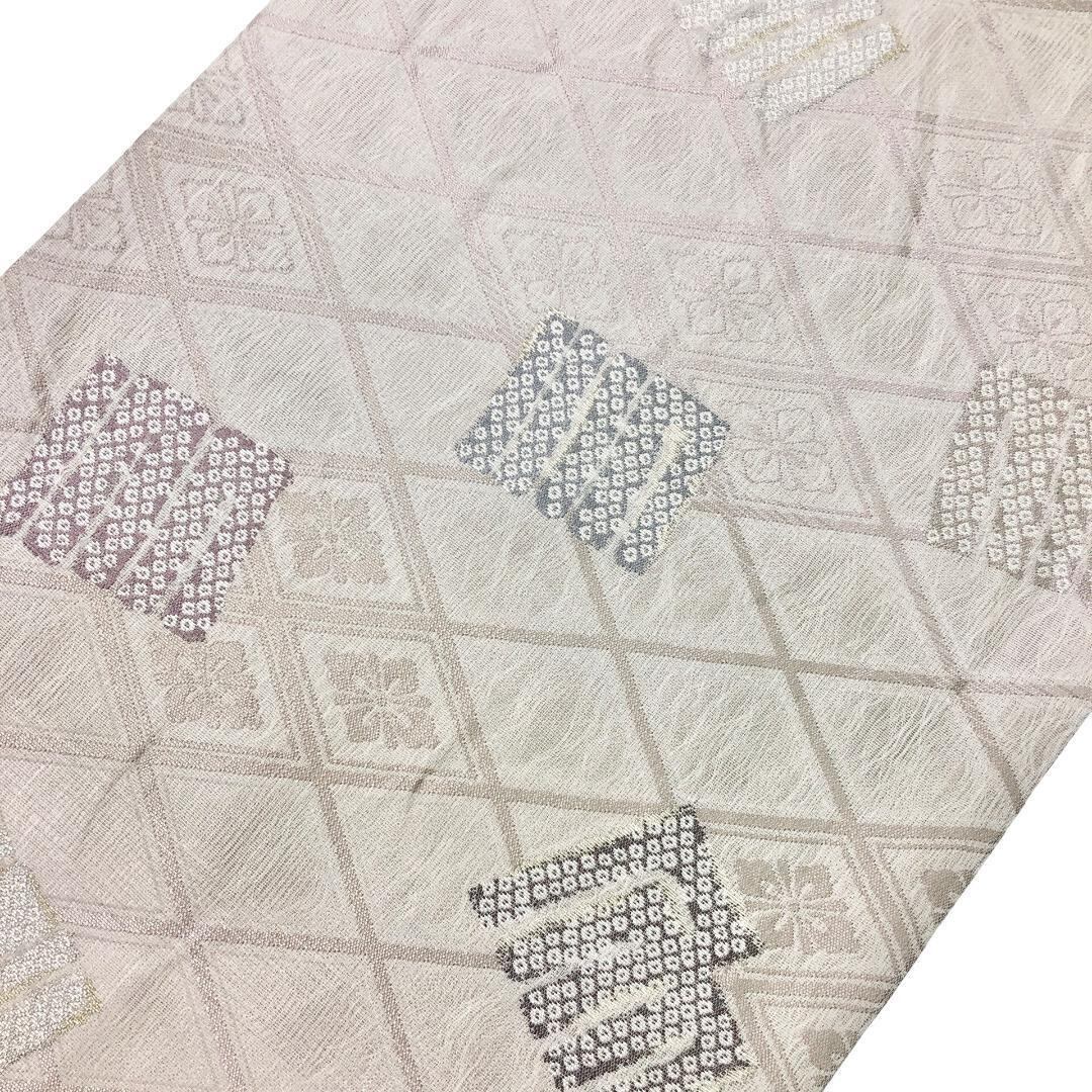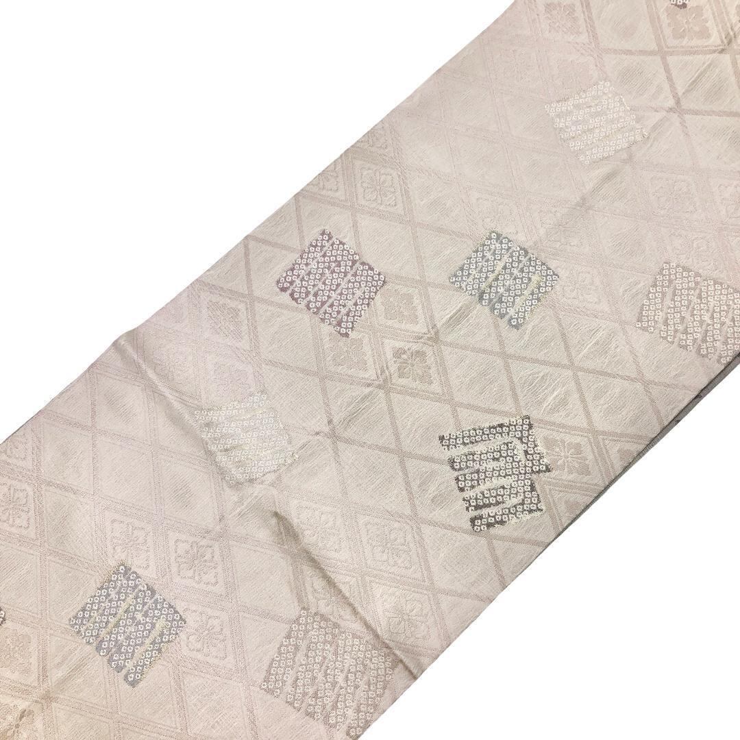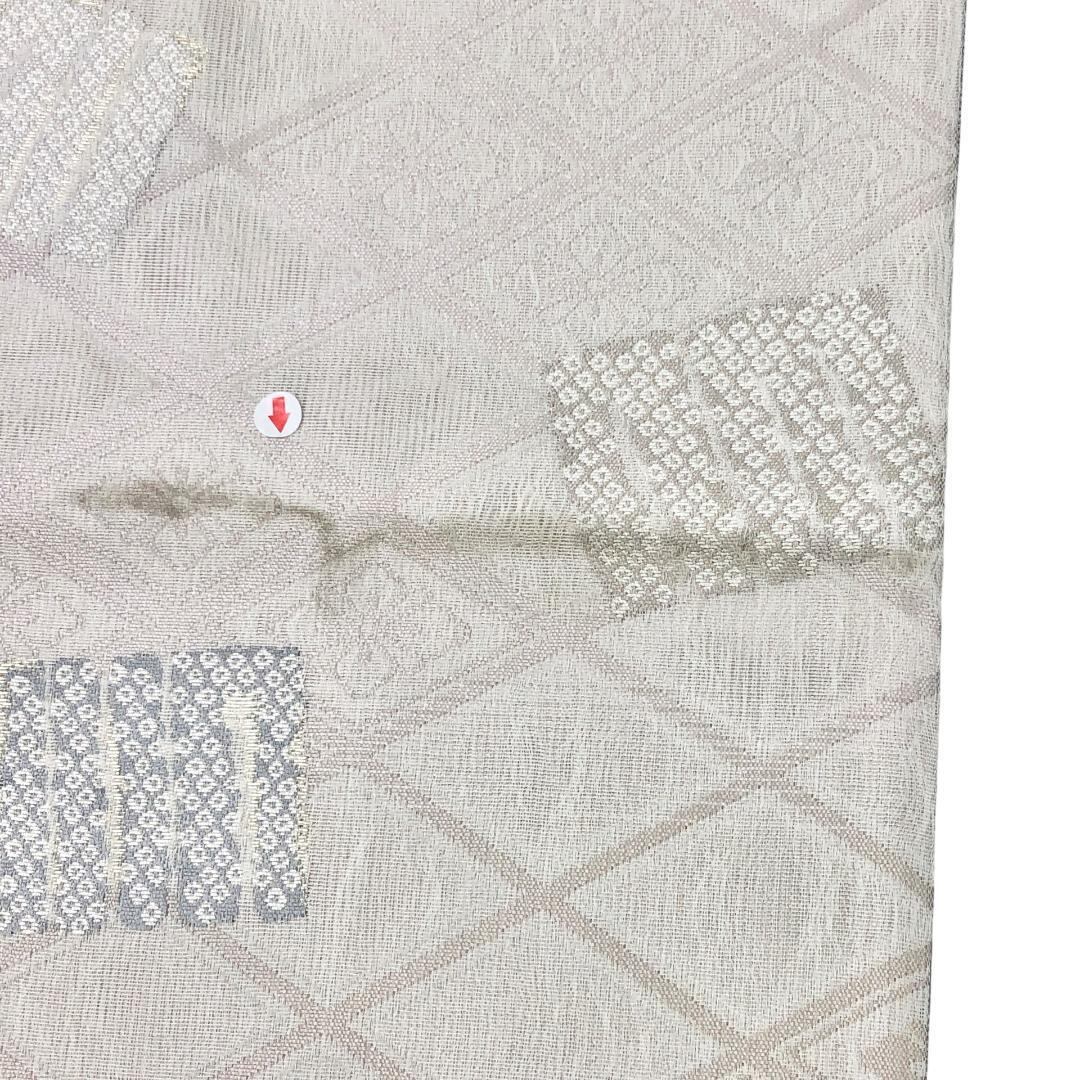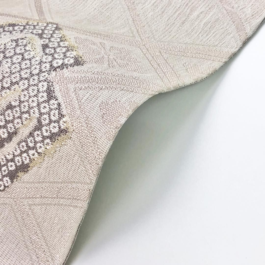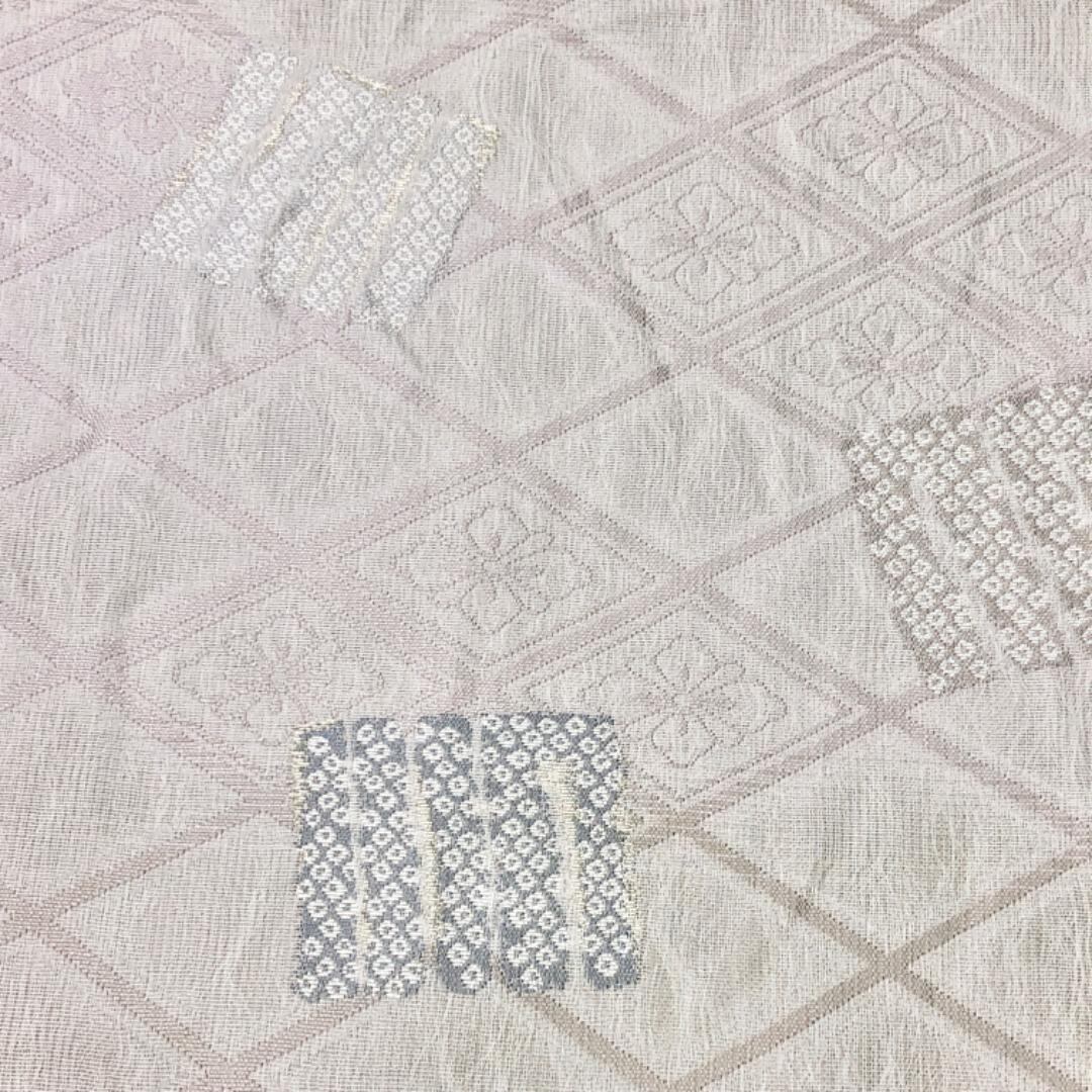 白茶色ベースの上品なお色味、花菱、源氏香の柄裄がデザインされた雰囲気の良い素敵なお品でございます。