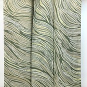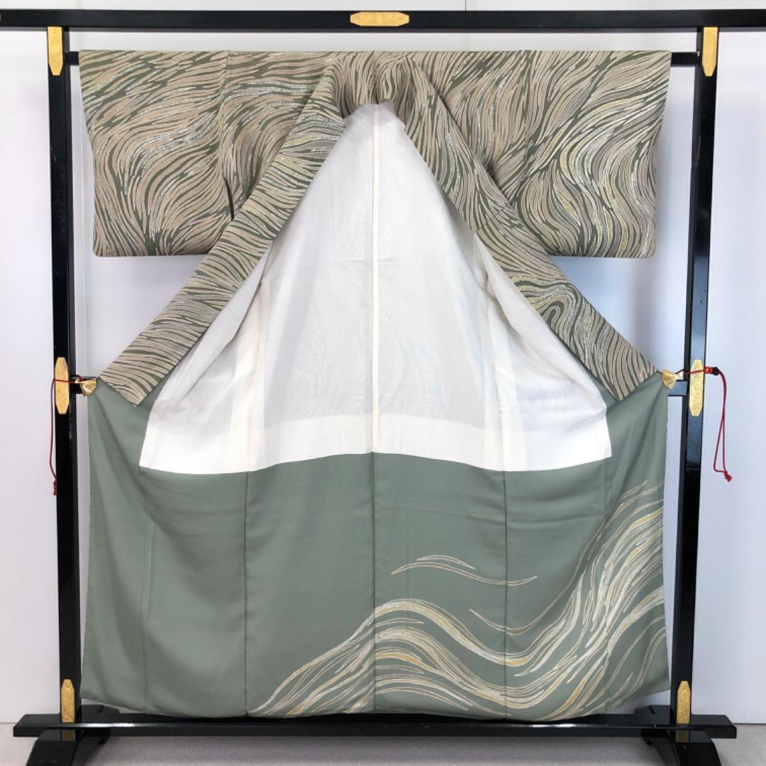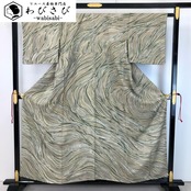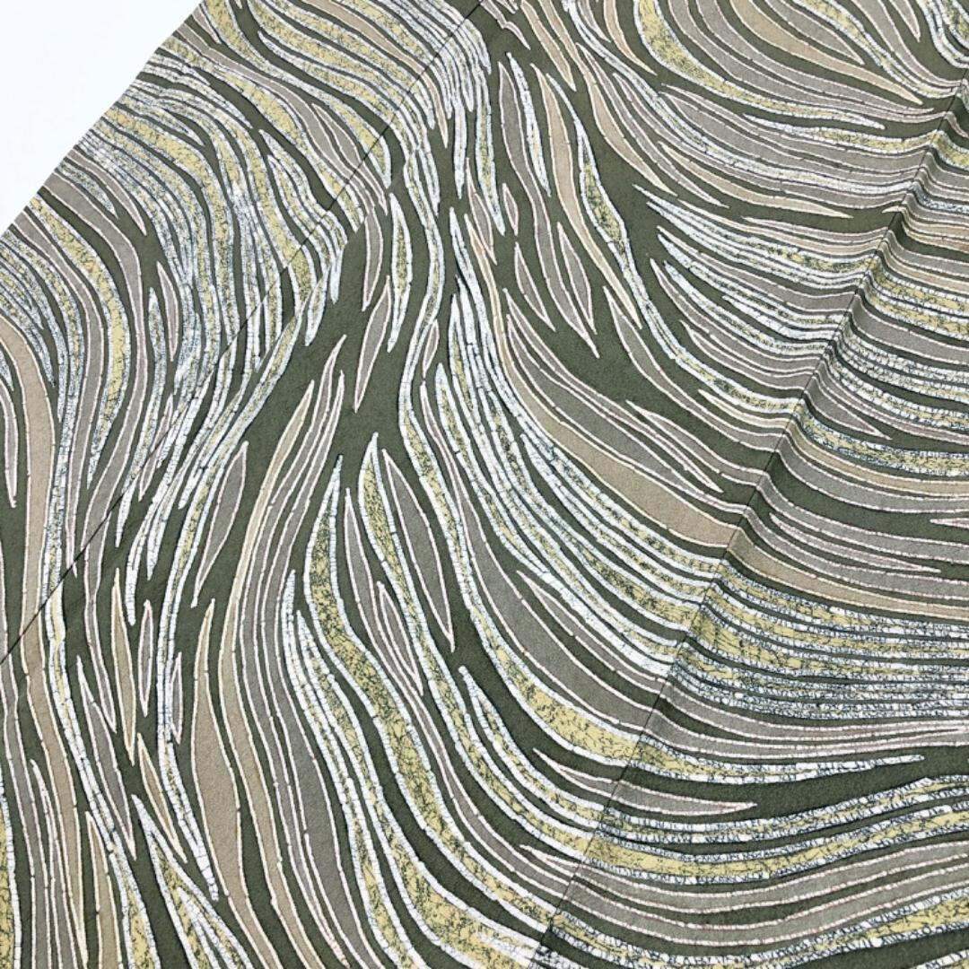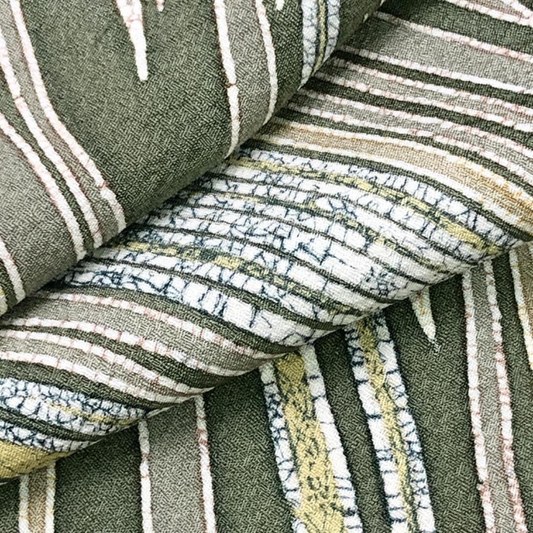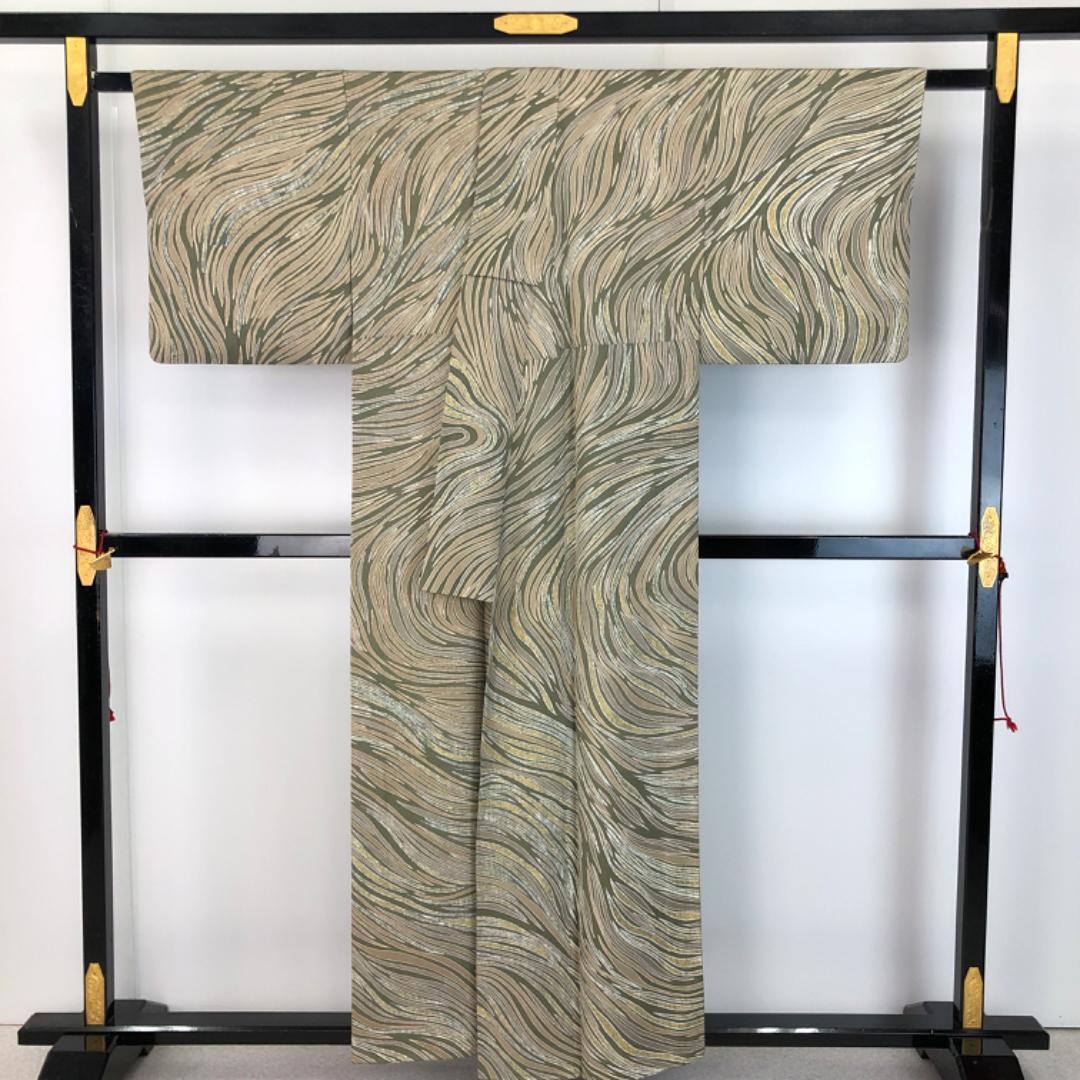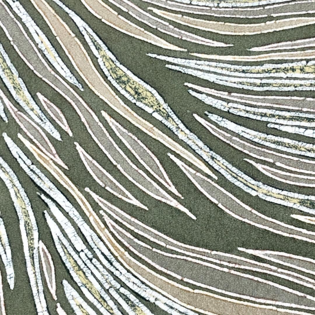 昆布茶色ベースのお色味の縮緬地に蝋纈染の流れるような美しい抽象曲線模様がデザインされた雰囲気の良い素敵なお品でございます。
