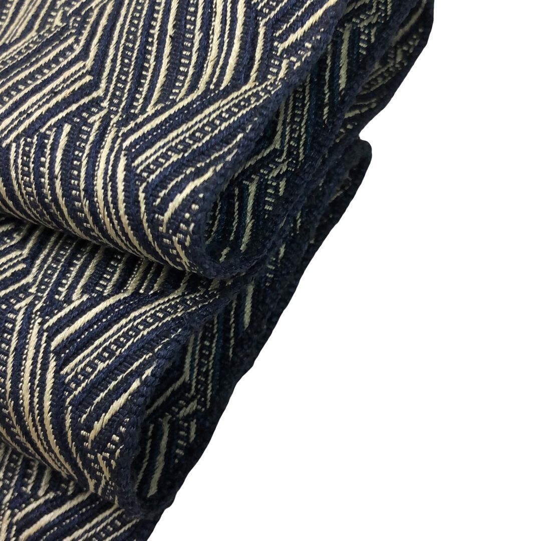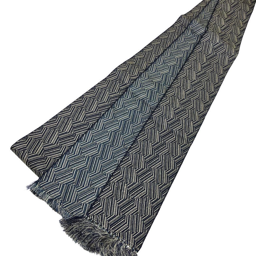 濃紺色ベースのお色味に菱形抽象模様の柄裄がデザインされた素敵なお品でございます。