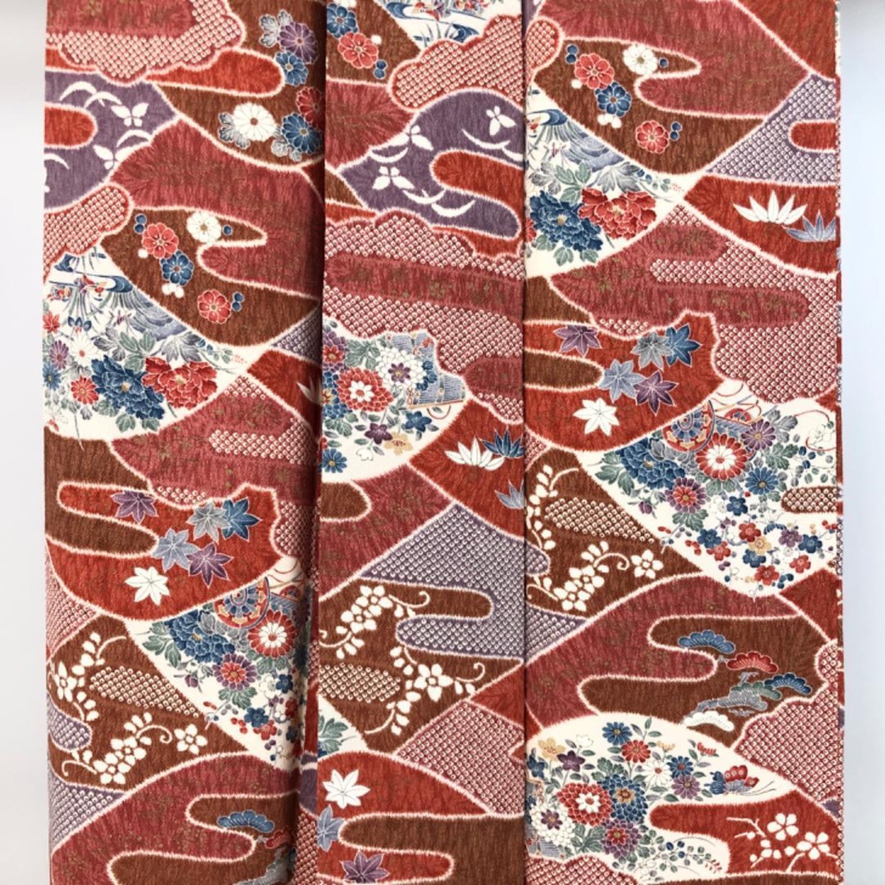 赤味ベースのお色味の縮緬地に霞に松、花模様、蝶々などの柄裄がデザインされた素敵なお品でございます。