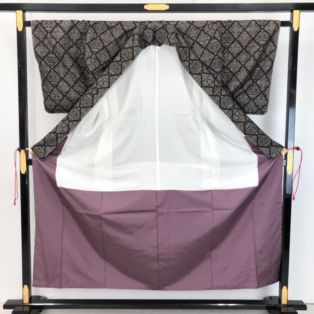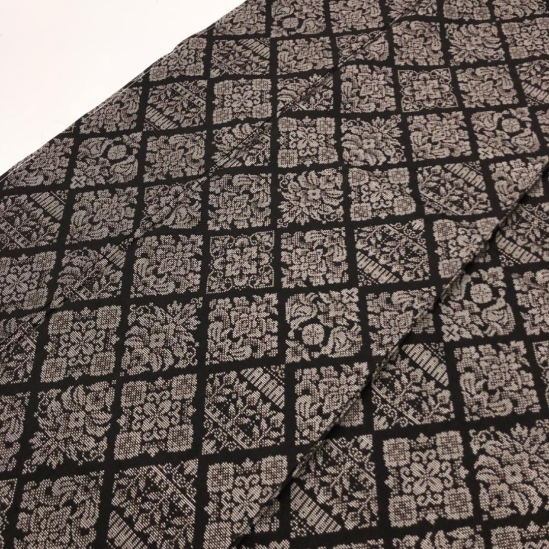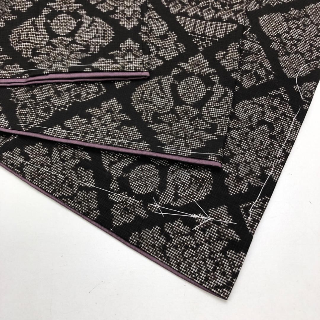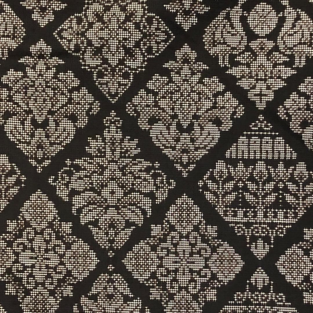 純泥染の雰囲気の良いお色味に菱形に花模様の縦横の絣柄がデザインされた素敵なお品でございます。