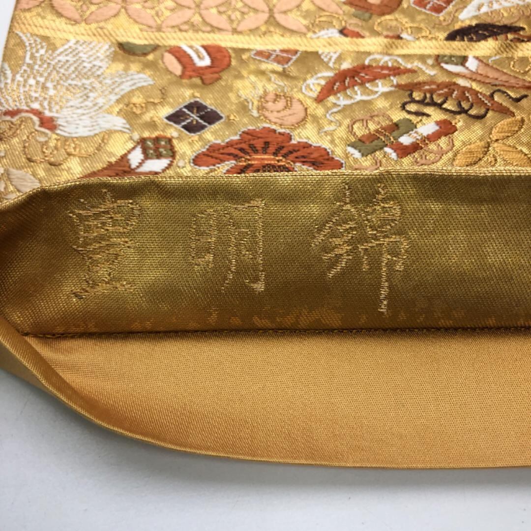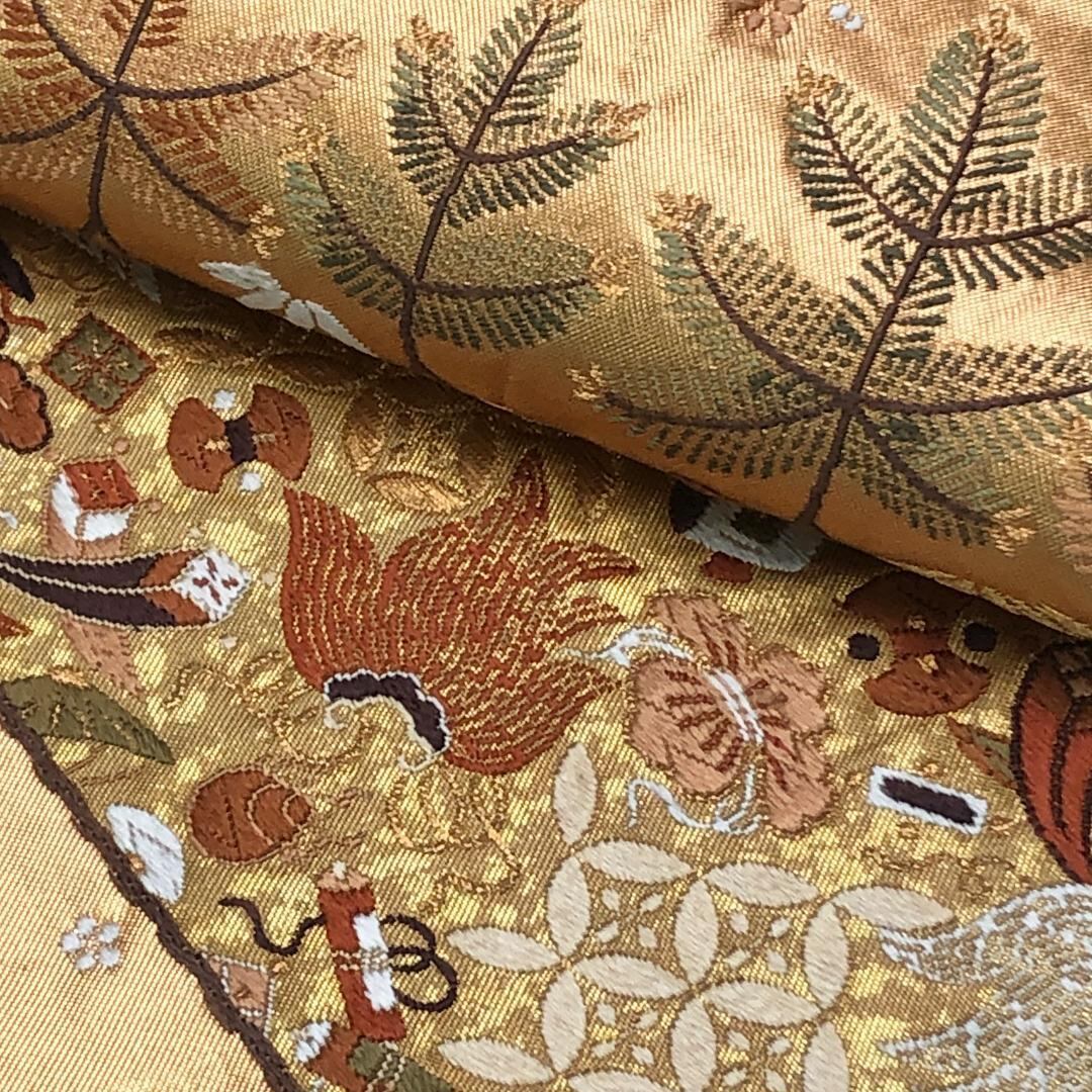 豊明錦と題された金色ベースの煌びやかなお色味に宝尽くし、松竹梅の縁起の良い柄裄がデザインされた素敵なお品でございます。