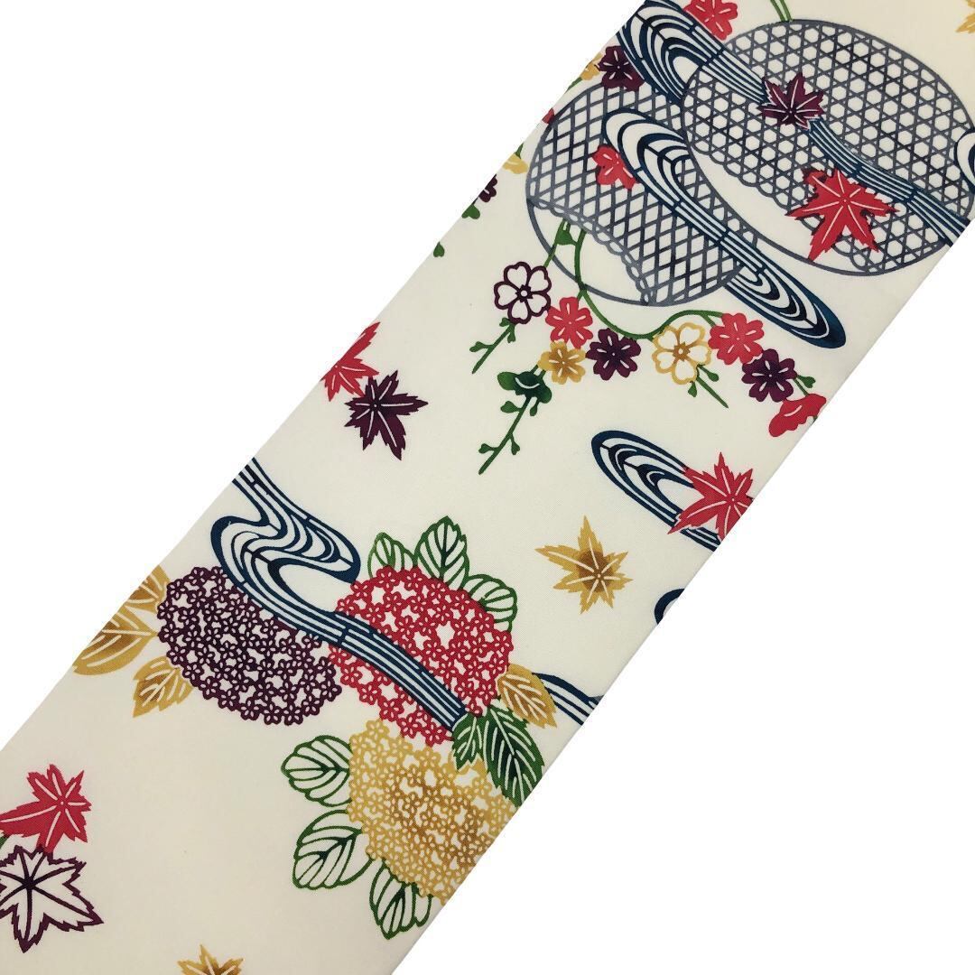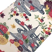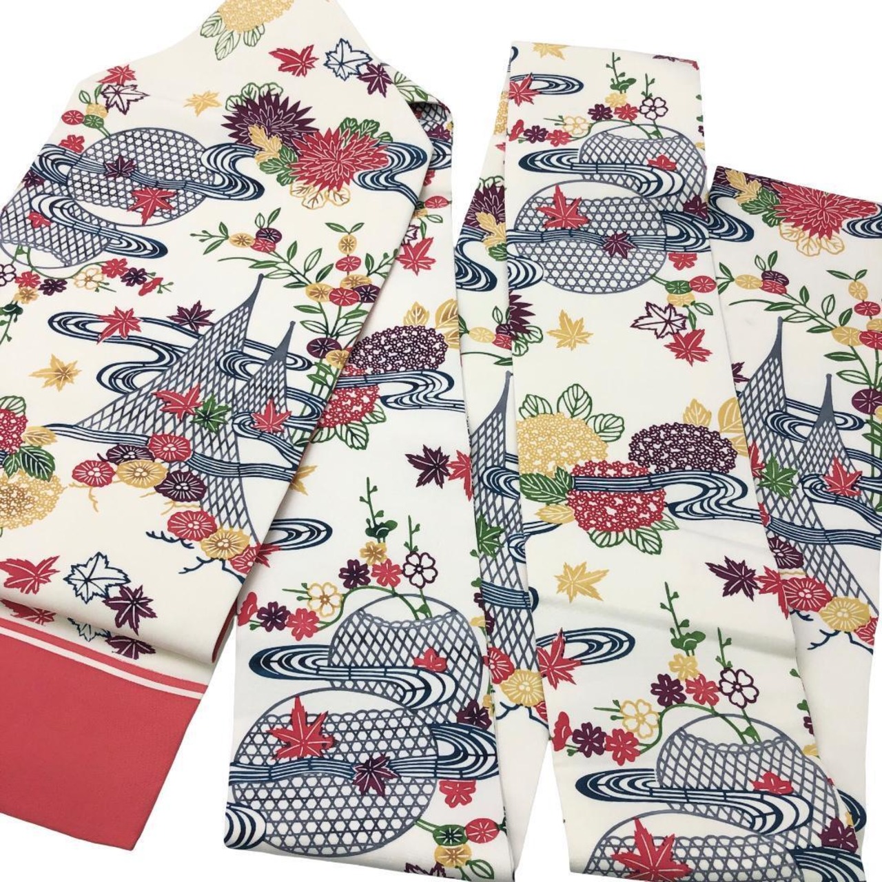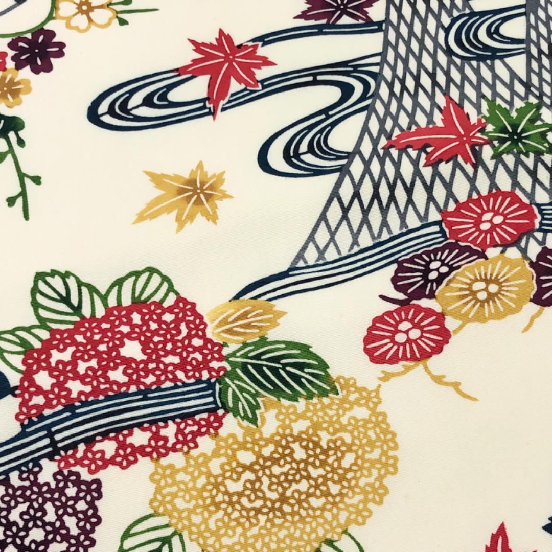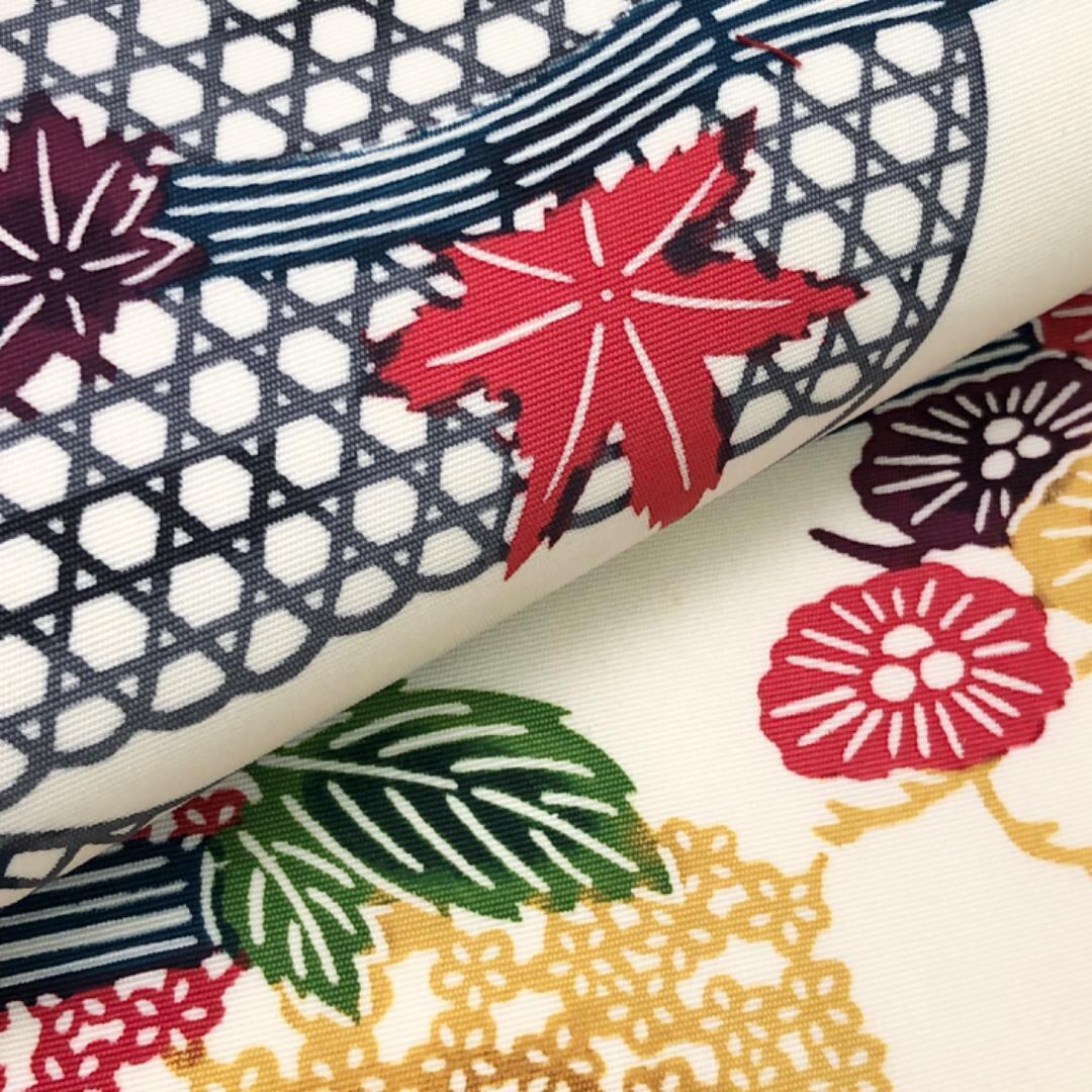 乳白色の上品なお色味に色鮮やかな型染で紅葉に花模様などがデザインされた素敵なお品でございます。