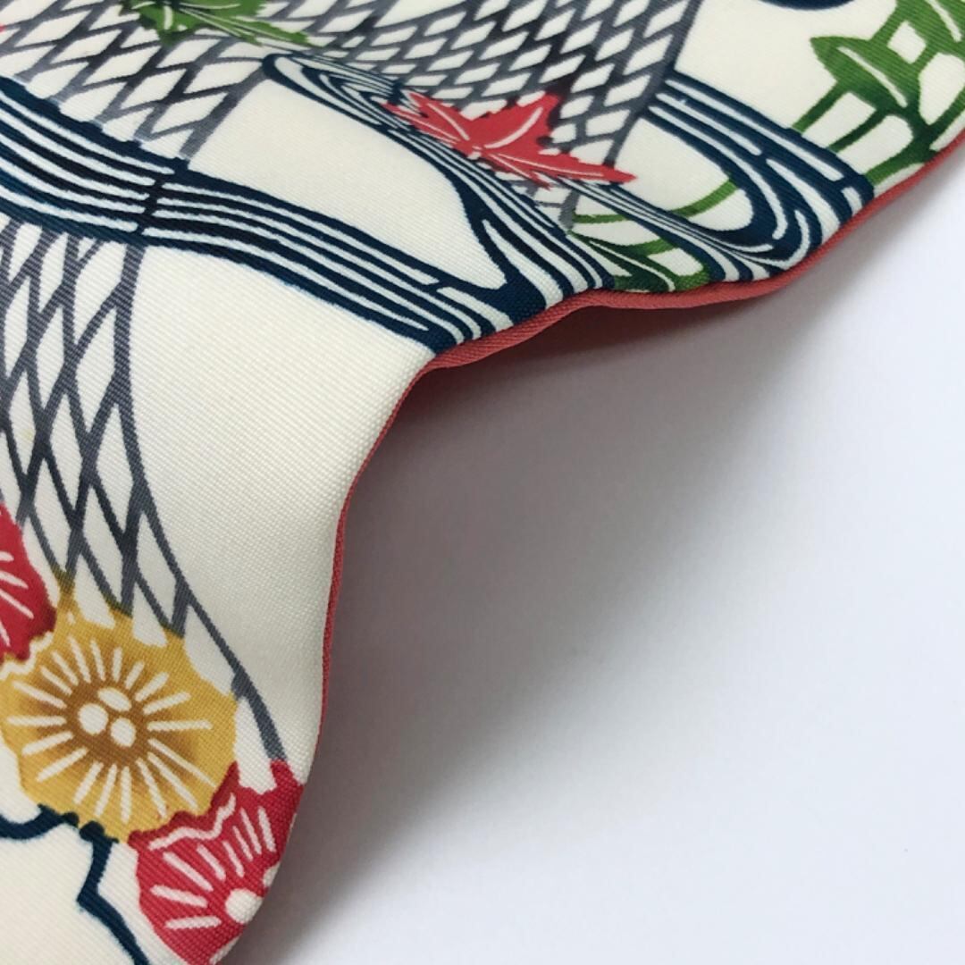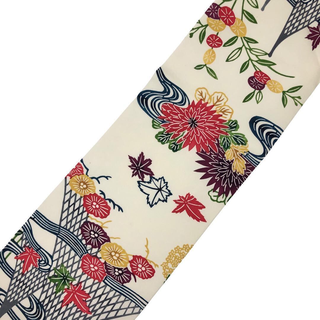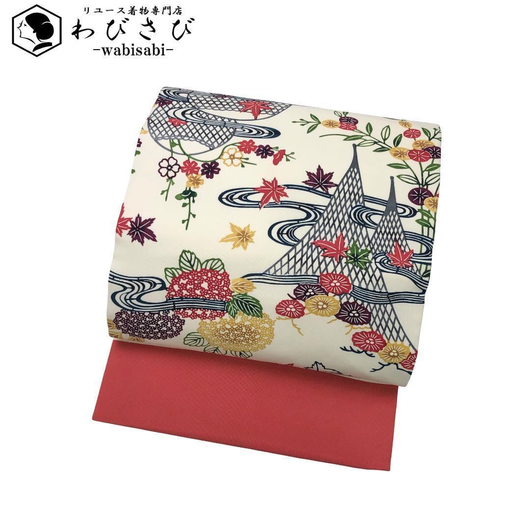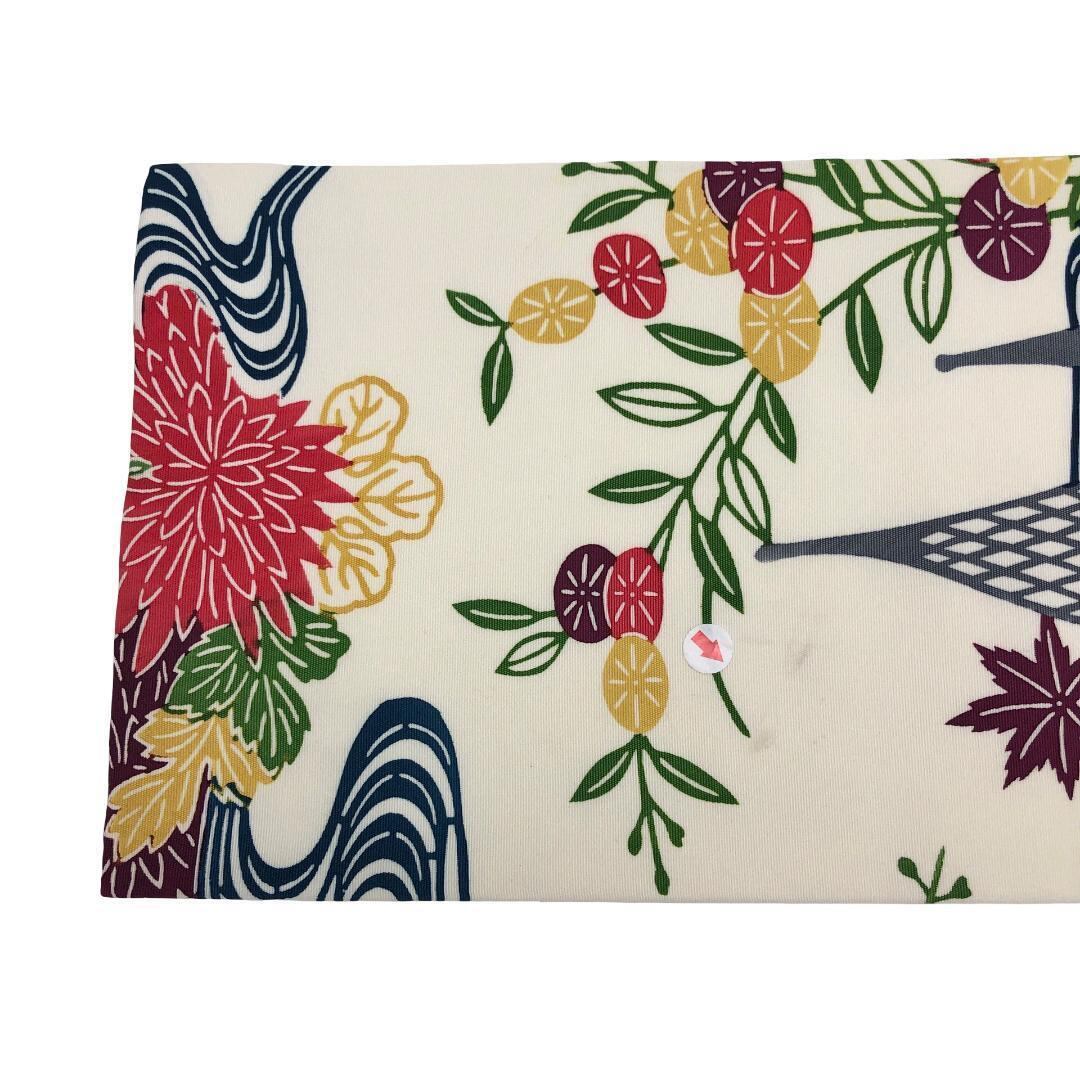 乳白色の上品なお色味に色鮮やかな型染で紅葉に花模様などがデザインされた素敵なお品でございます。