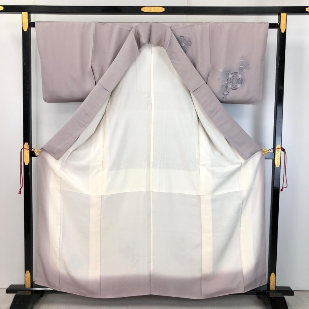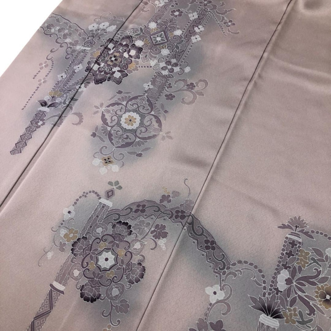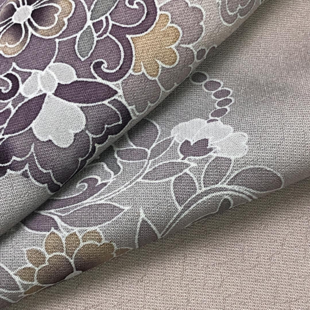 灰桜色のお色味に雰囲気の良い華柄模様、花唐草の柄裄がデザインされた素敵なお品でございます。