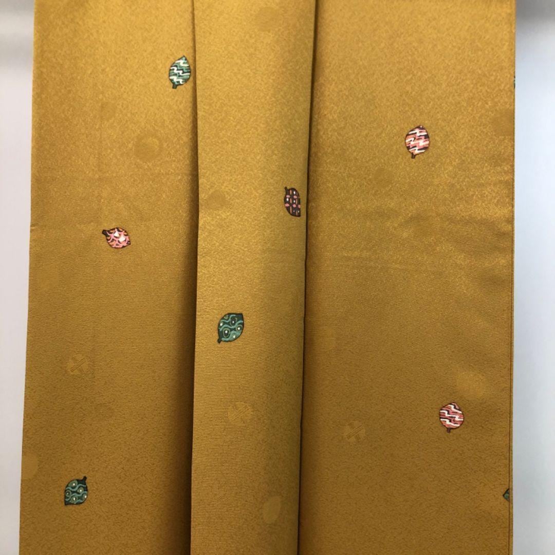 黄土色のお色味の縮緬地に飛び柄の葉っぱ模様がデザインされた素敵なお品でございます。
