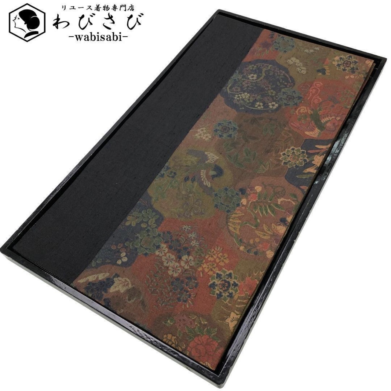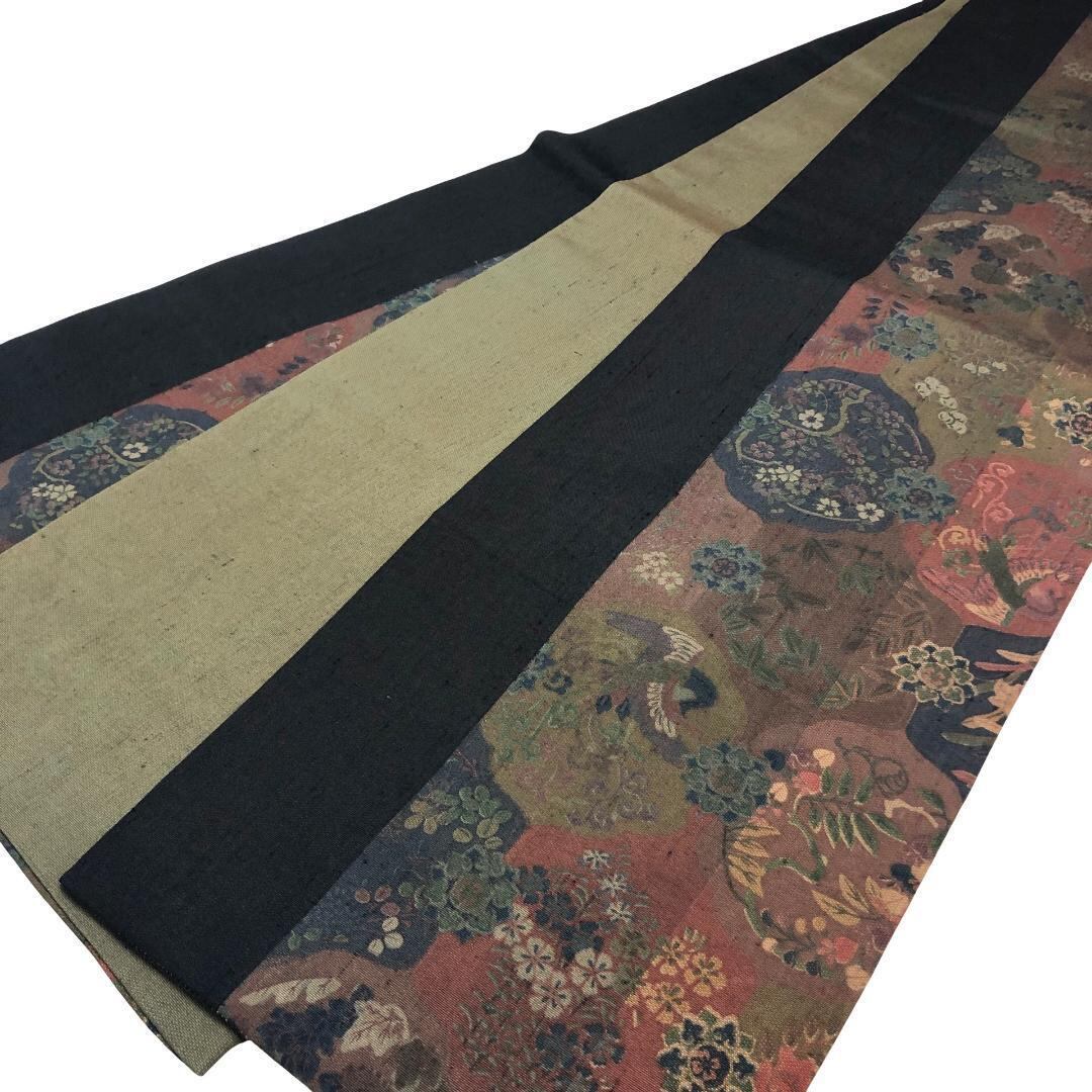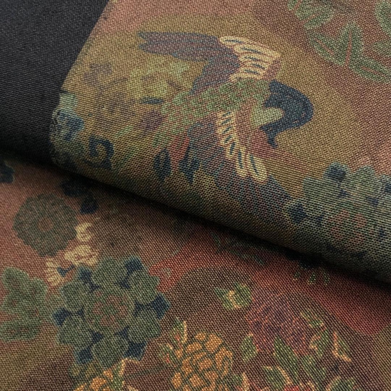 落ち着いた色彩、花柄模様に鳥などの柄裄がデザインされた雰囲気の良い素敵なお品でございます。