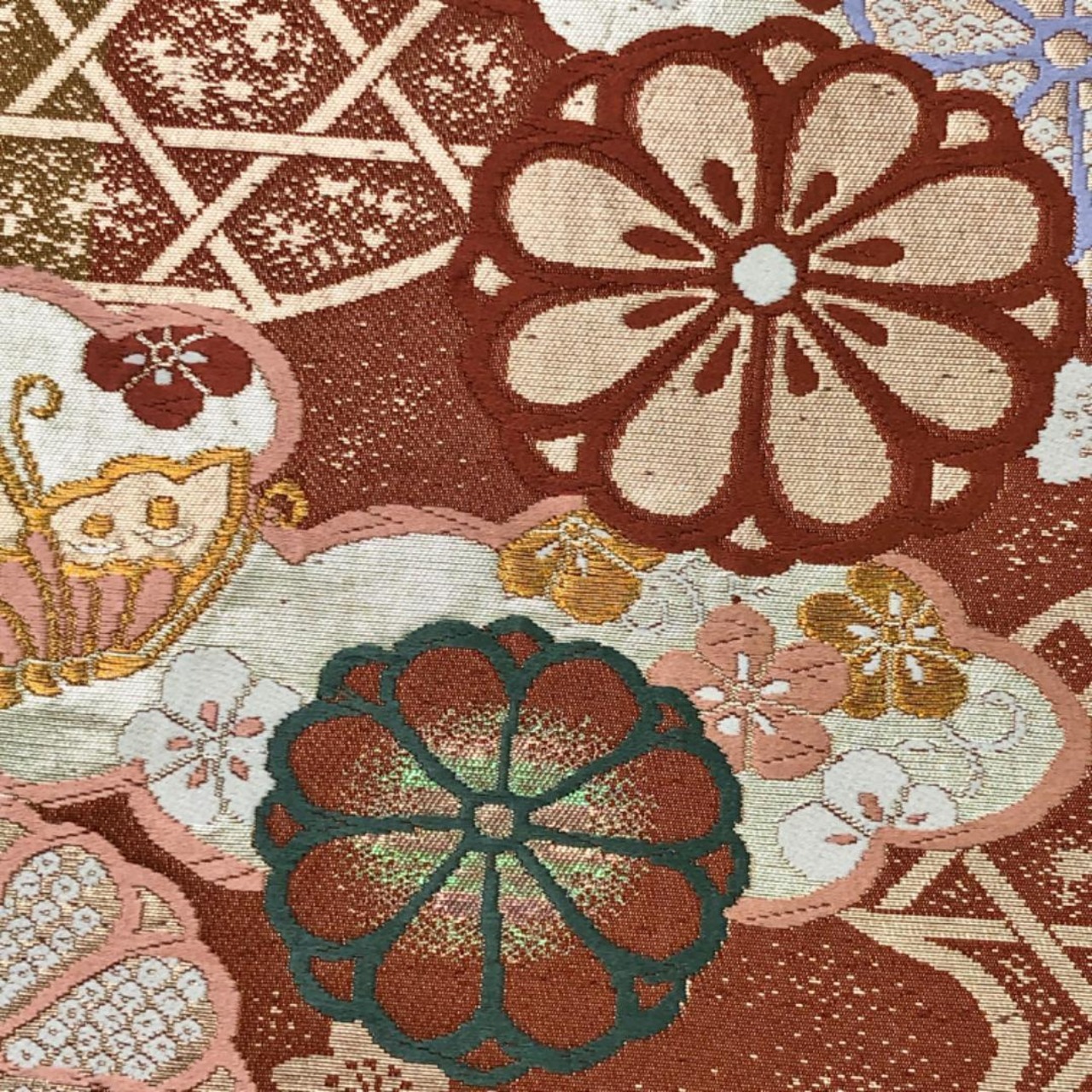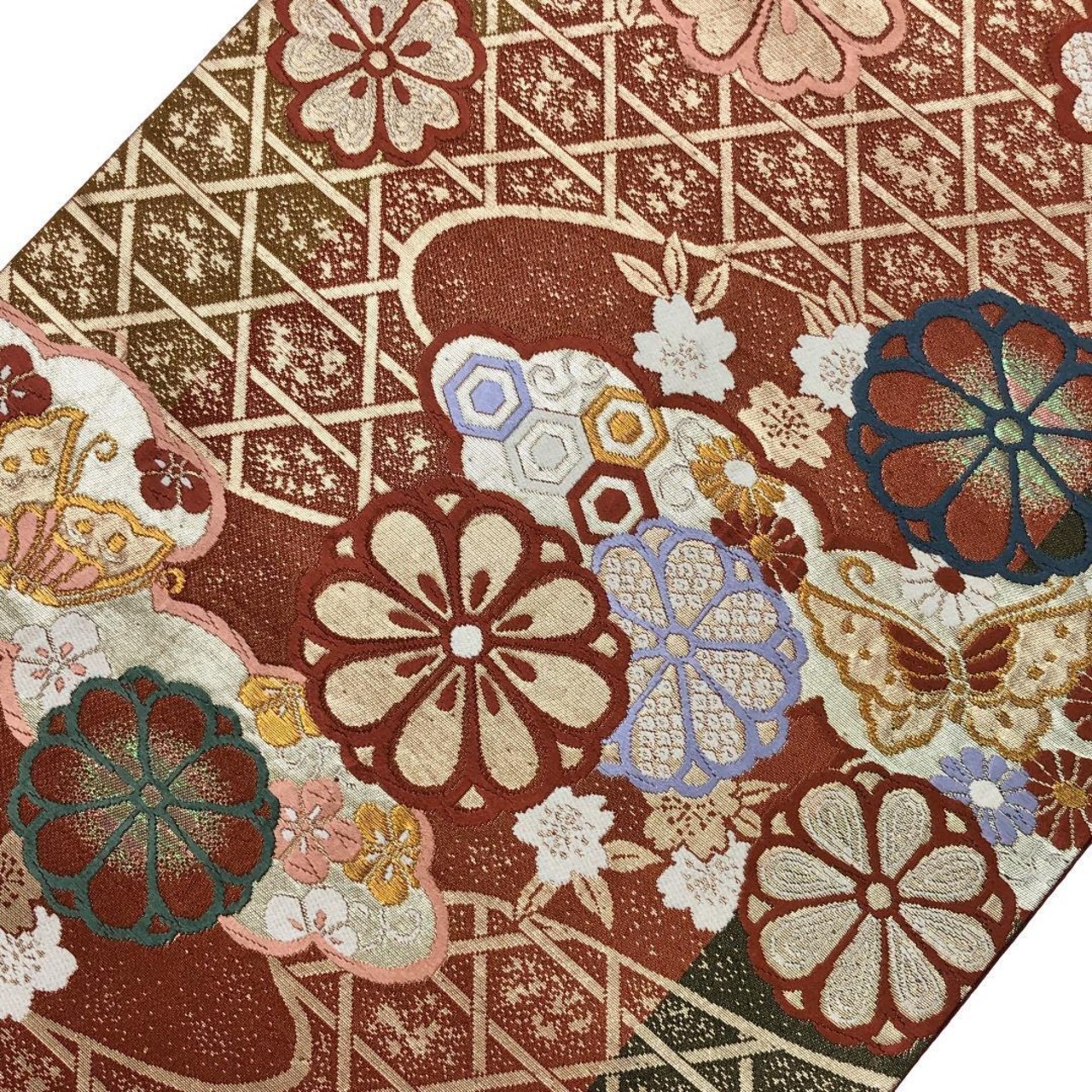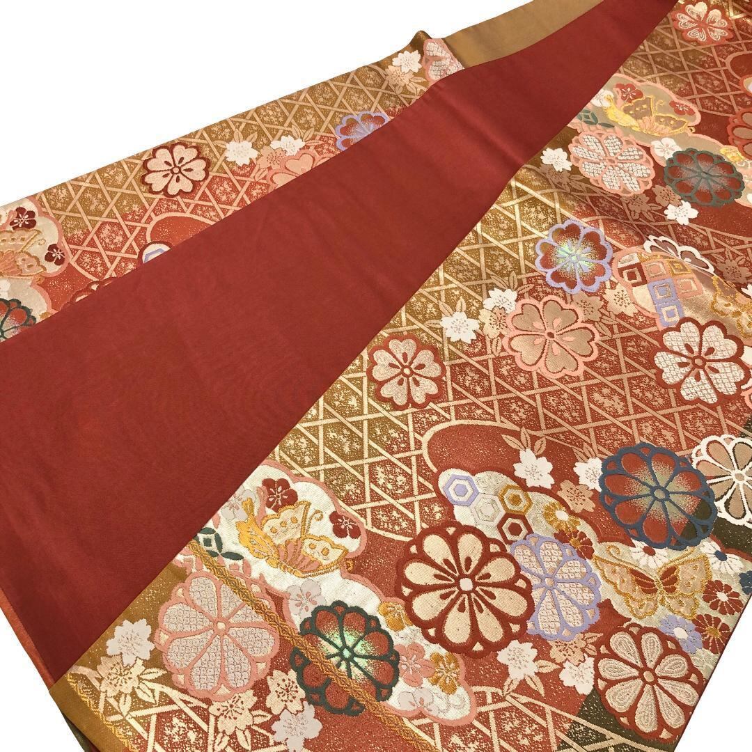 弁柄色ベースのお色味に可愛らしい蝶々、竹垣に花模様などの柄裄がデザインされた素敵なお品でございます。