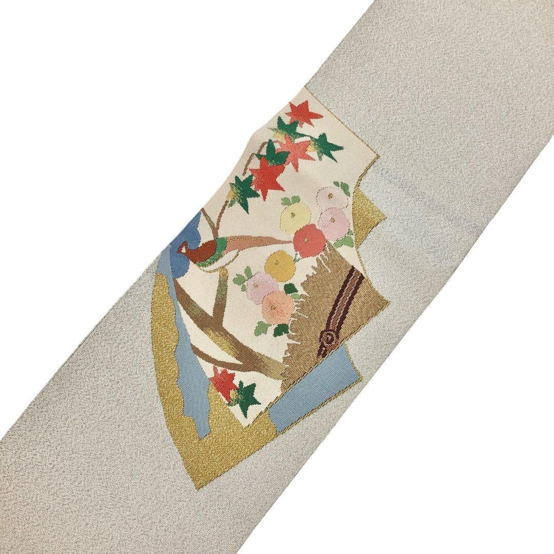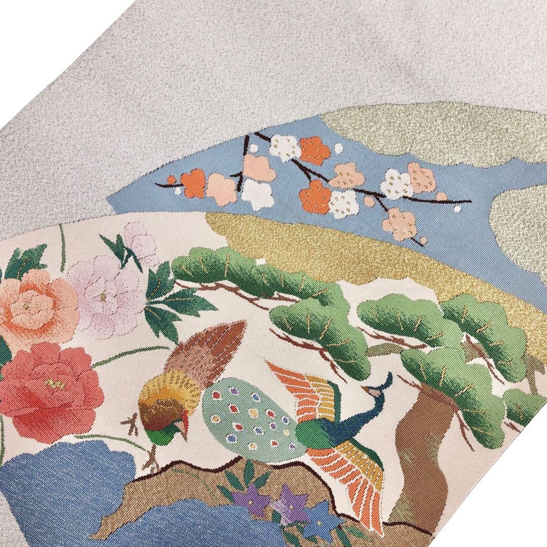 名古屋帯 綴れ 地紙に孔雀 松 梅 花模様 胡粉色 O-5666 着物 きもの kimono 和服 和装 中古 リサイクル着物 【送料無料】