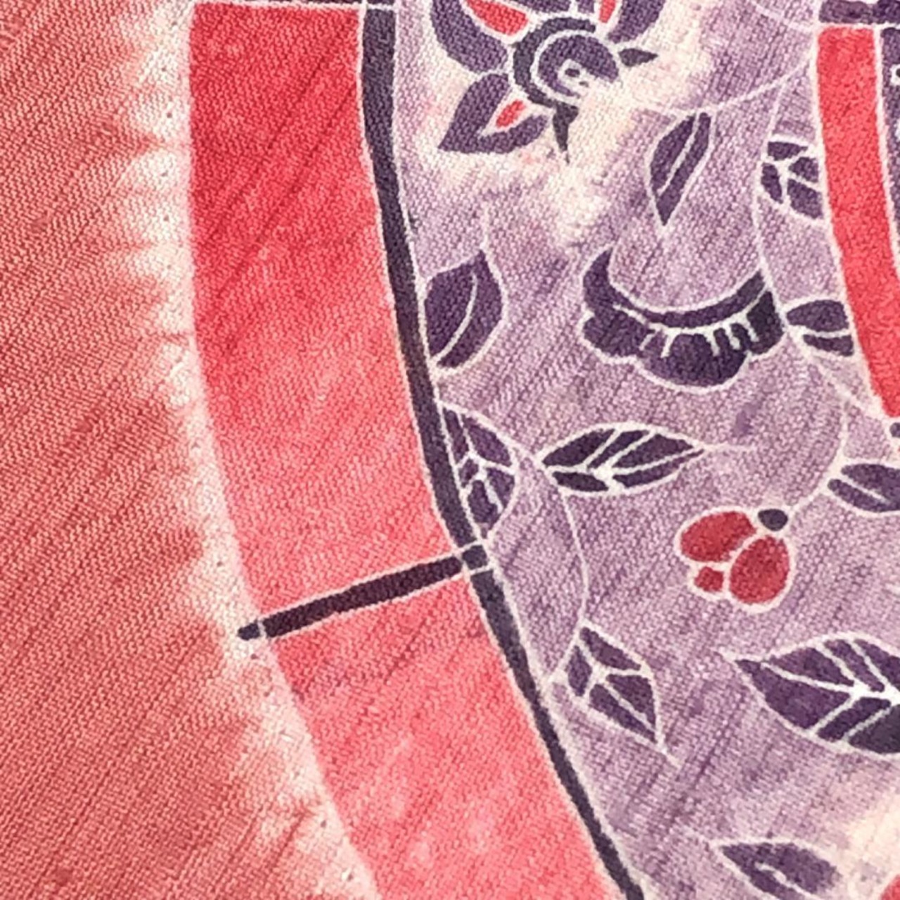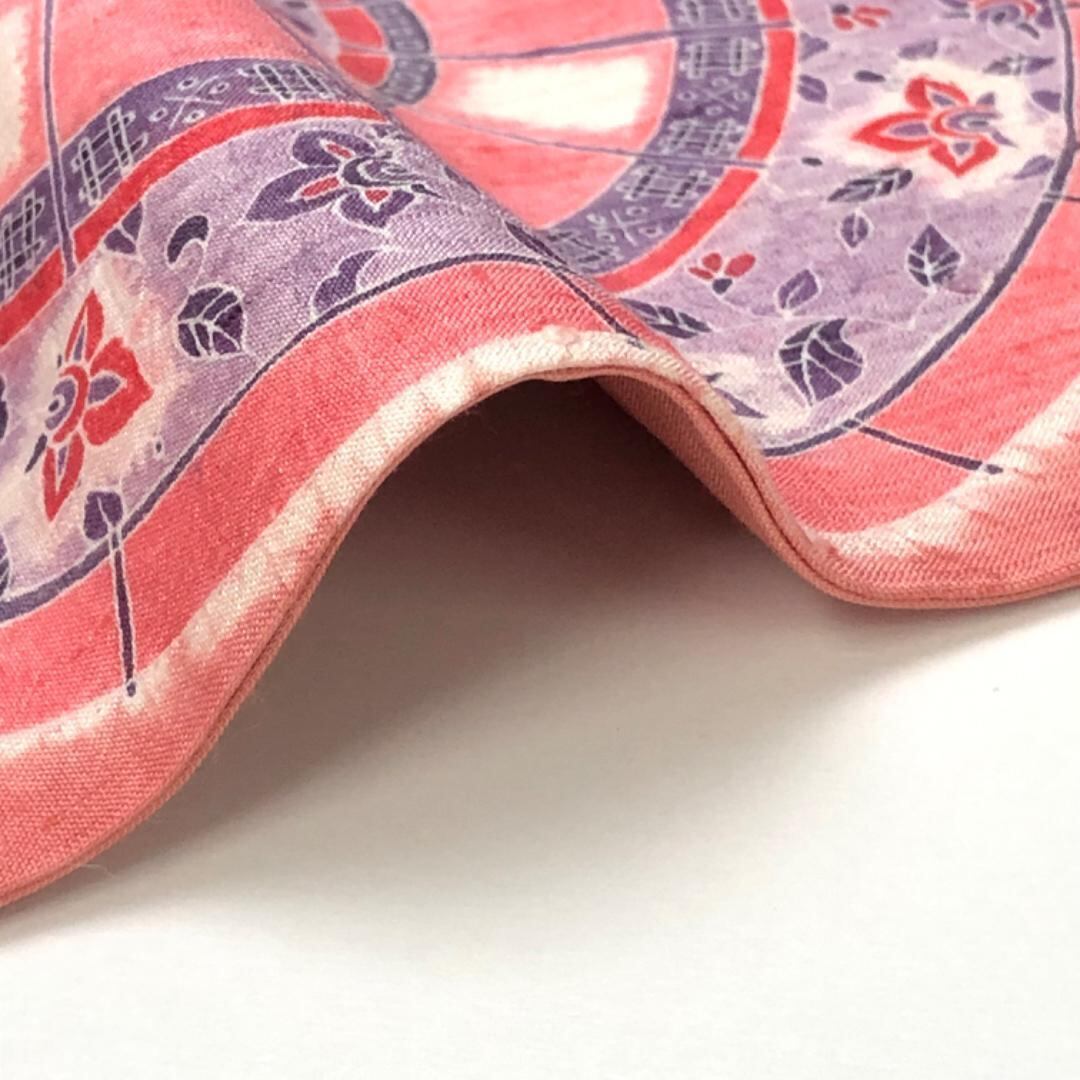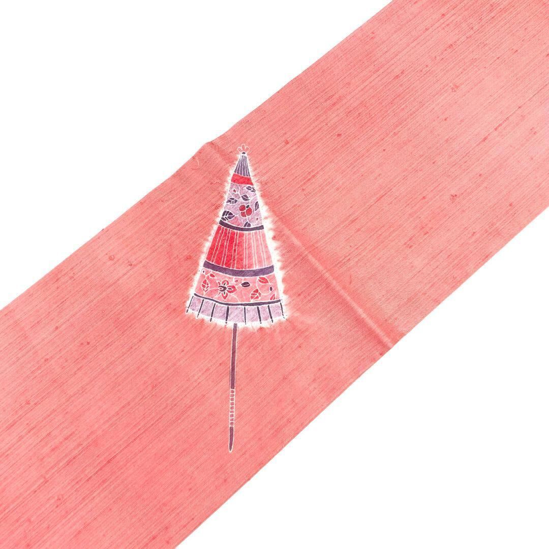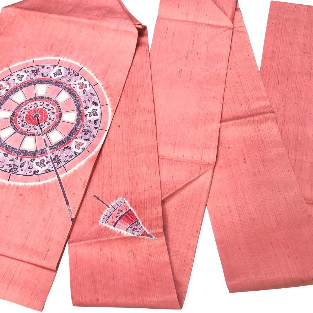 薄紅梅色のお色味に絞り柄で和傘、和傘に花唐草模様がデザインされた紬の素敵な柄裄のお品でございます。