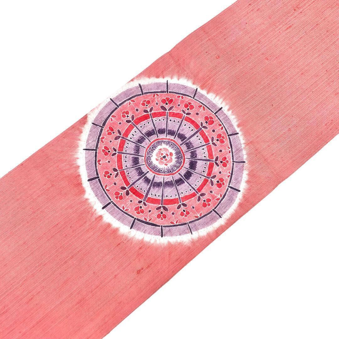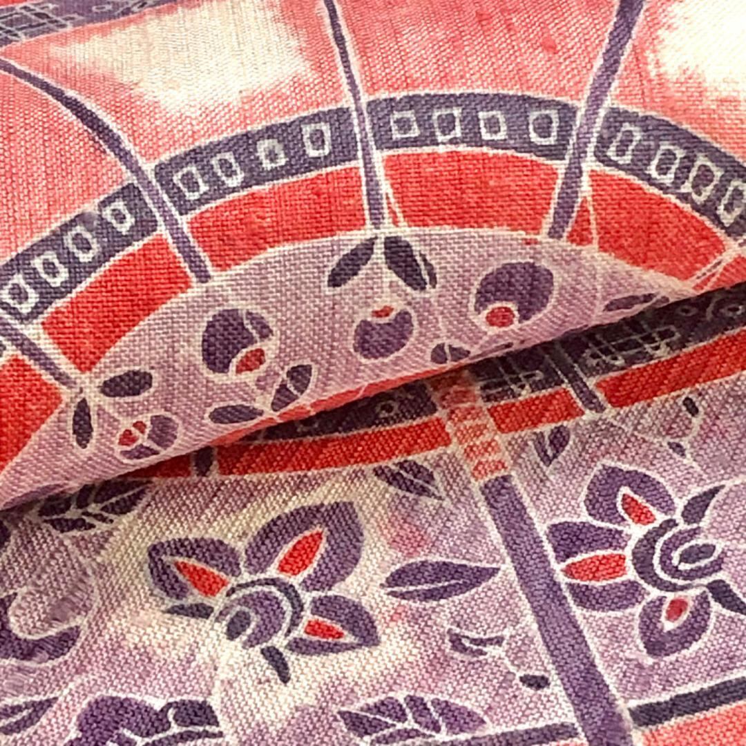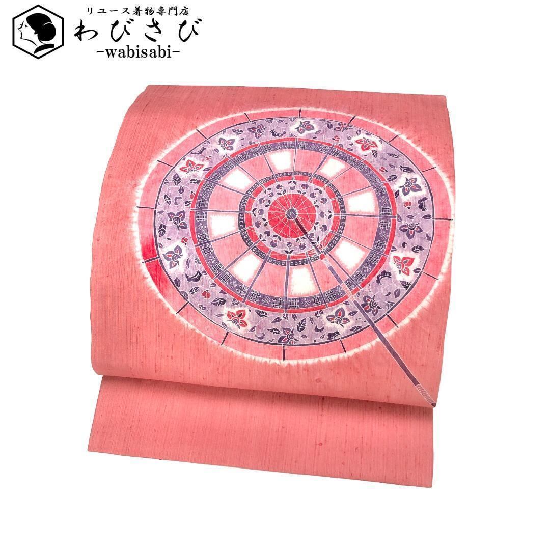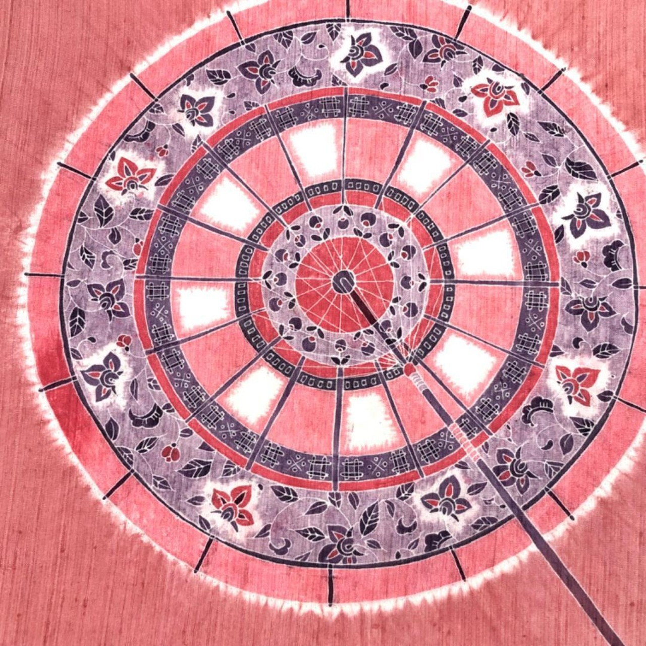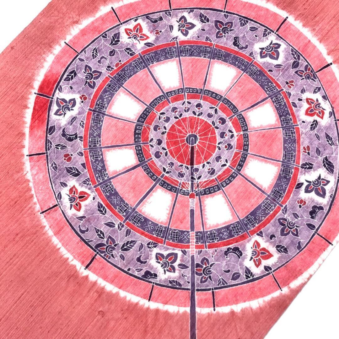 薄紅梅色のお色味に絞り柄で和傘、和傘に花唐草模様がデザインされた紬の素敵な柄裄のお品でございます。