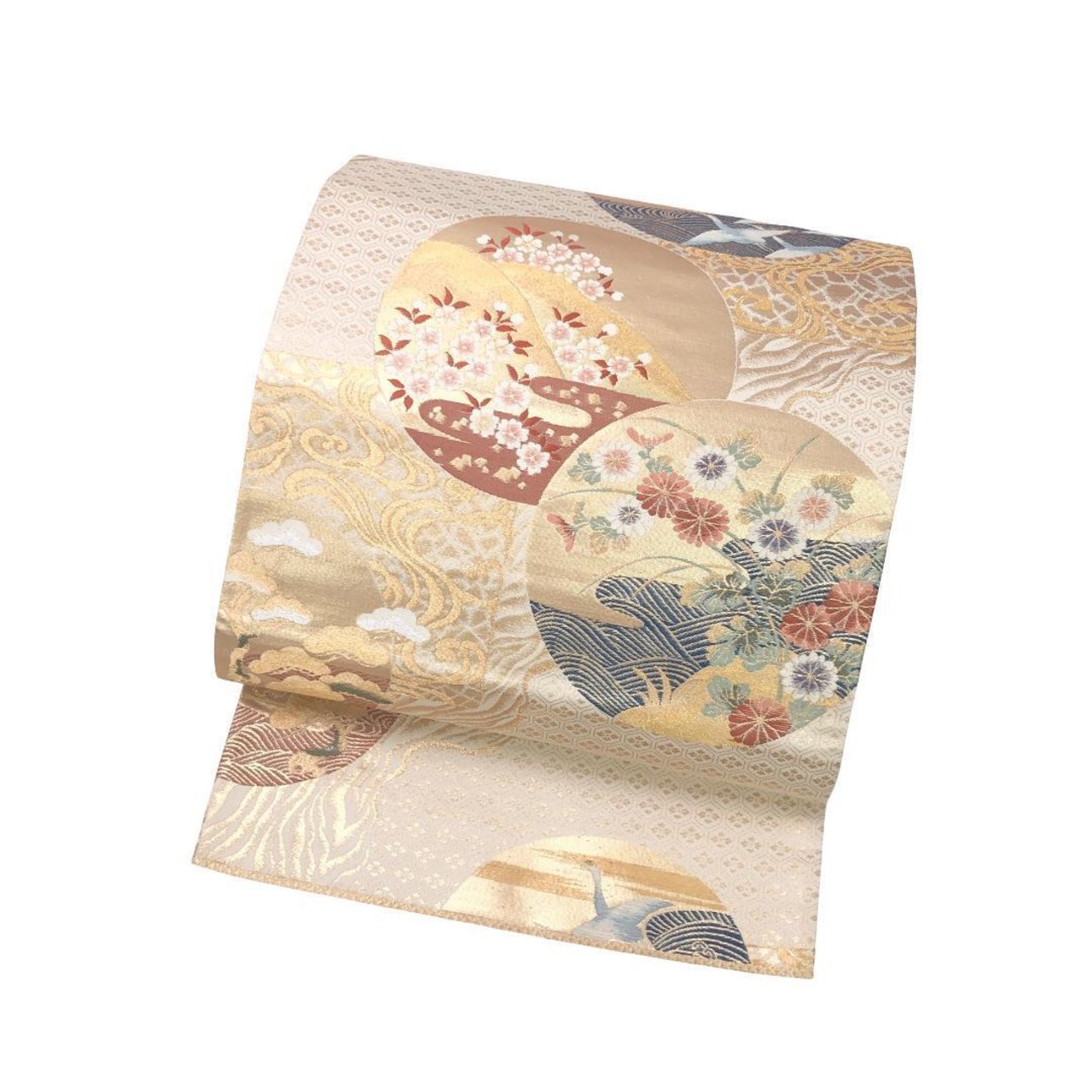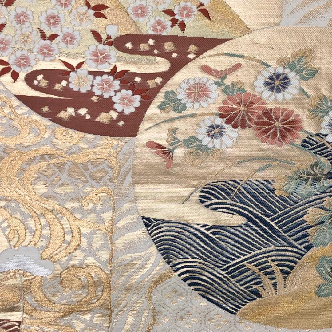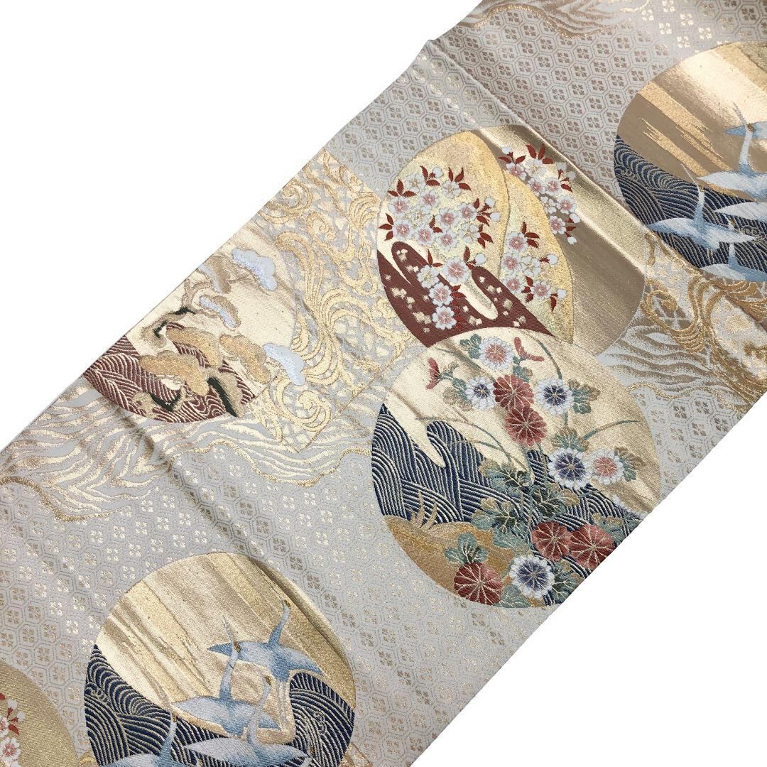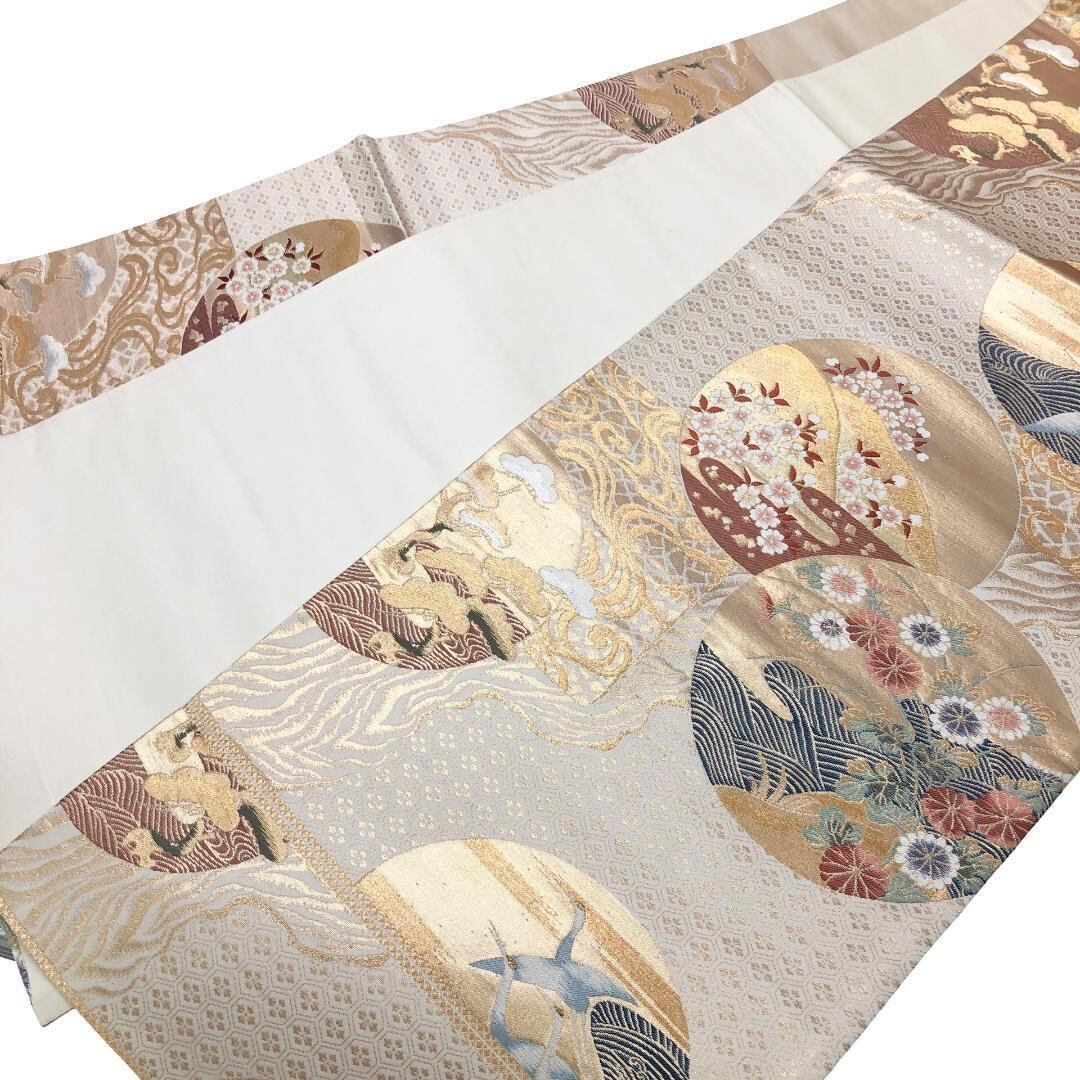 尾花色の品のあるお色味に丸に風景、花模様、鶴、松などの柄裄がデザインされた雰囲気の良い素敵なお品でございます。