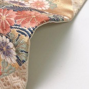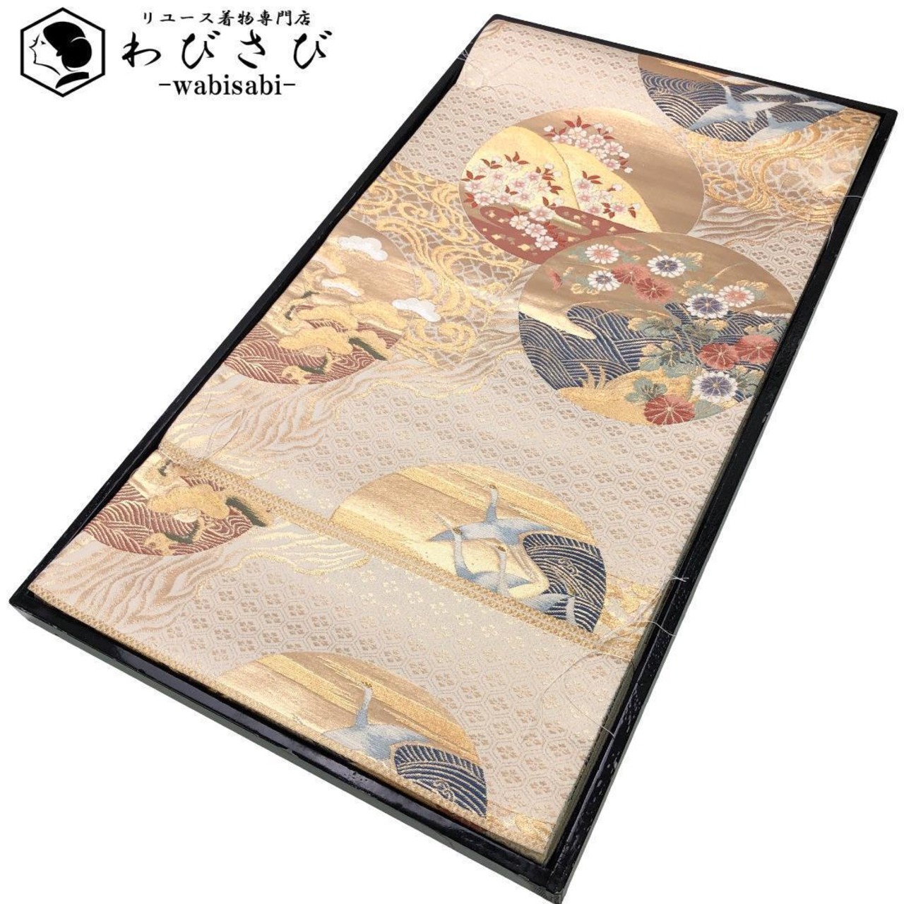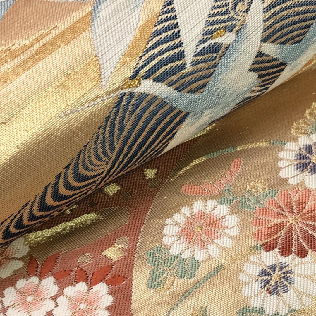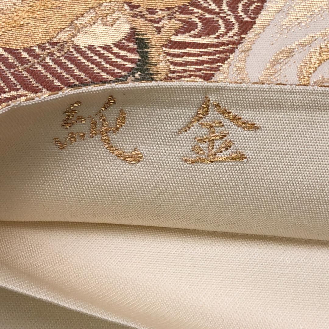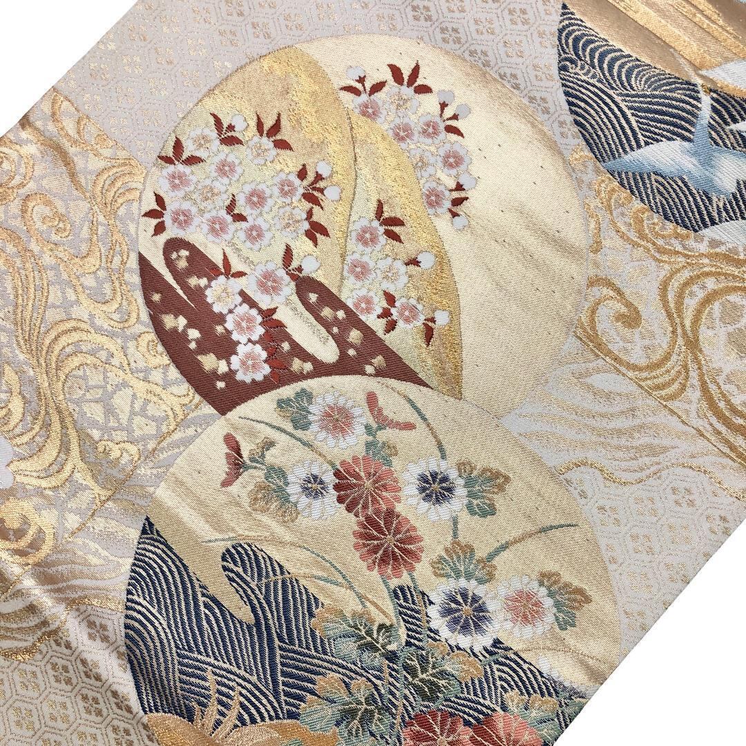 尾花色の品のあるお色味に丸に風景、花模様、鶴、松などの柄裄がデザインされた雰囲気の良い素敵なお品でございます。