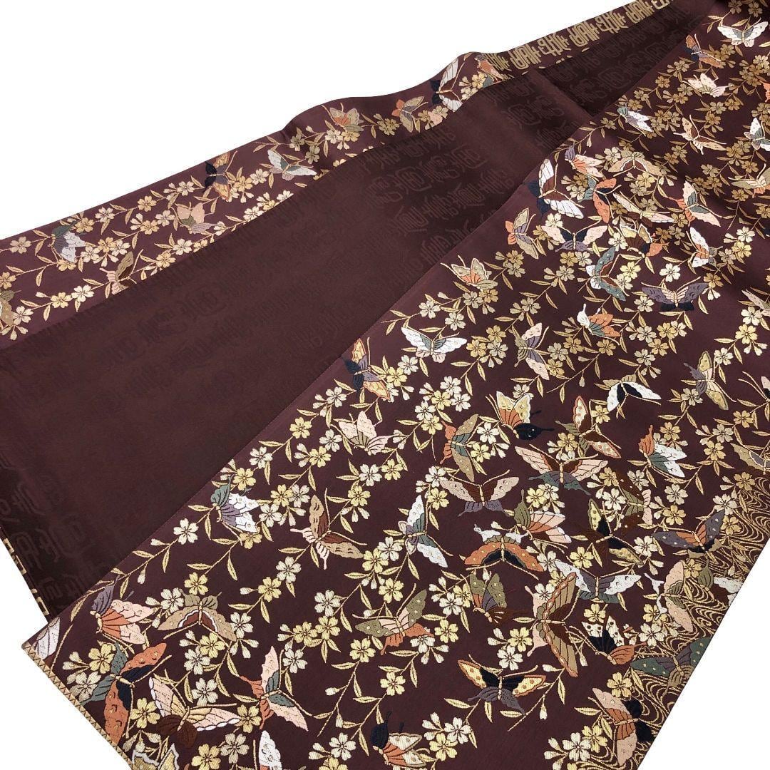 黒紅梅色の落ち着いたお色味に枝垂桜に蝶々、流水の柄行がデザインされた素敵なお品でございます。
