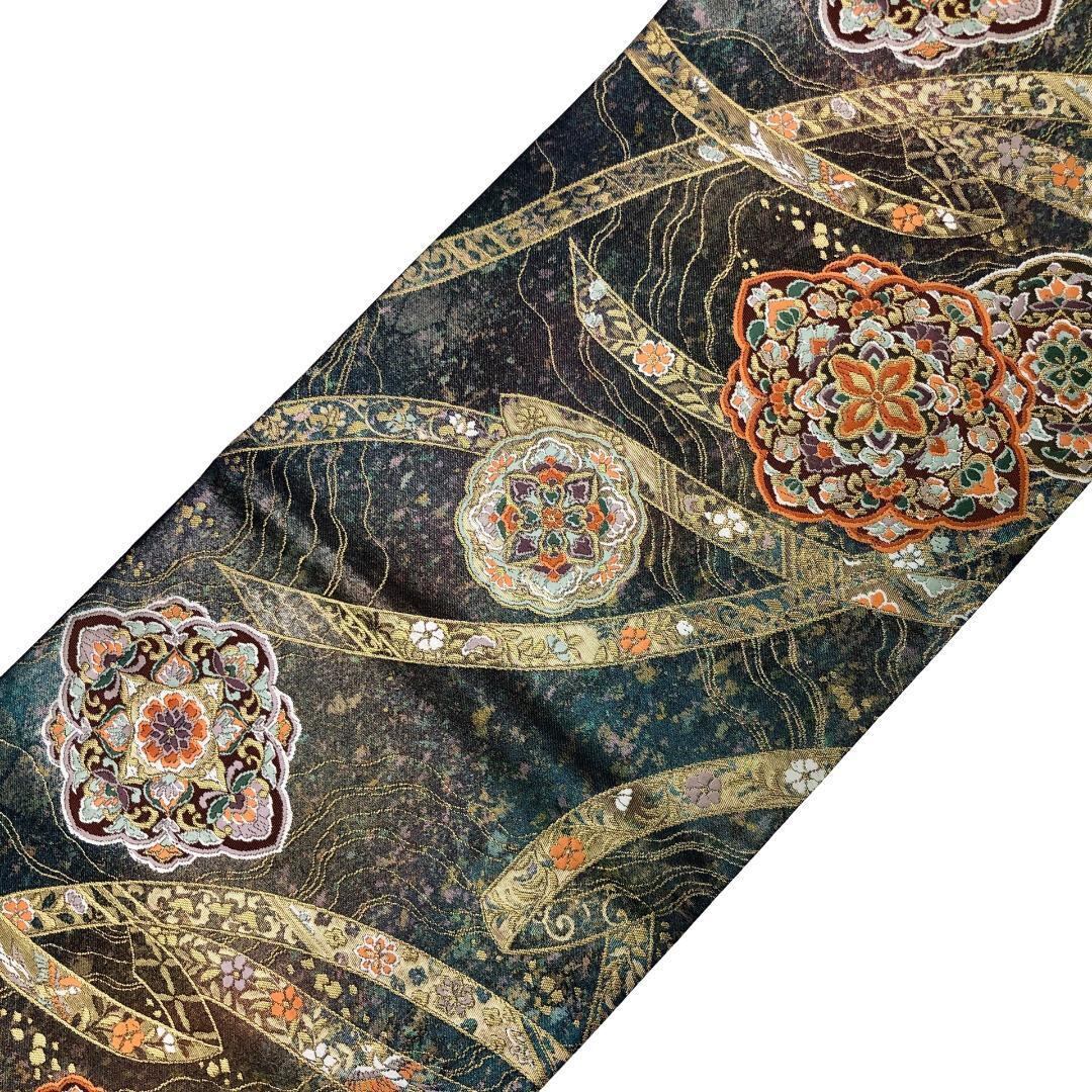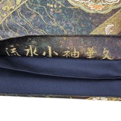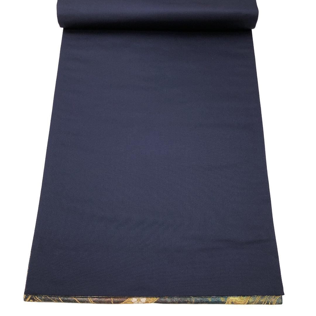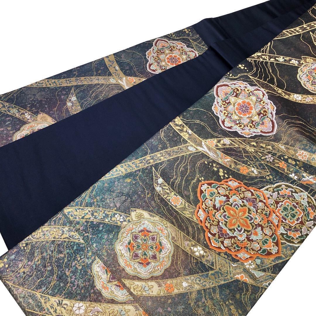 濃深藍色ベースの落ち着きあるお色味に熨斗に華柄模様の柄行がデザインされた素敵なお品でございます。