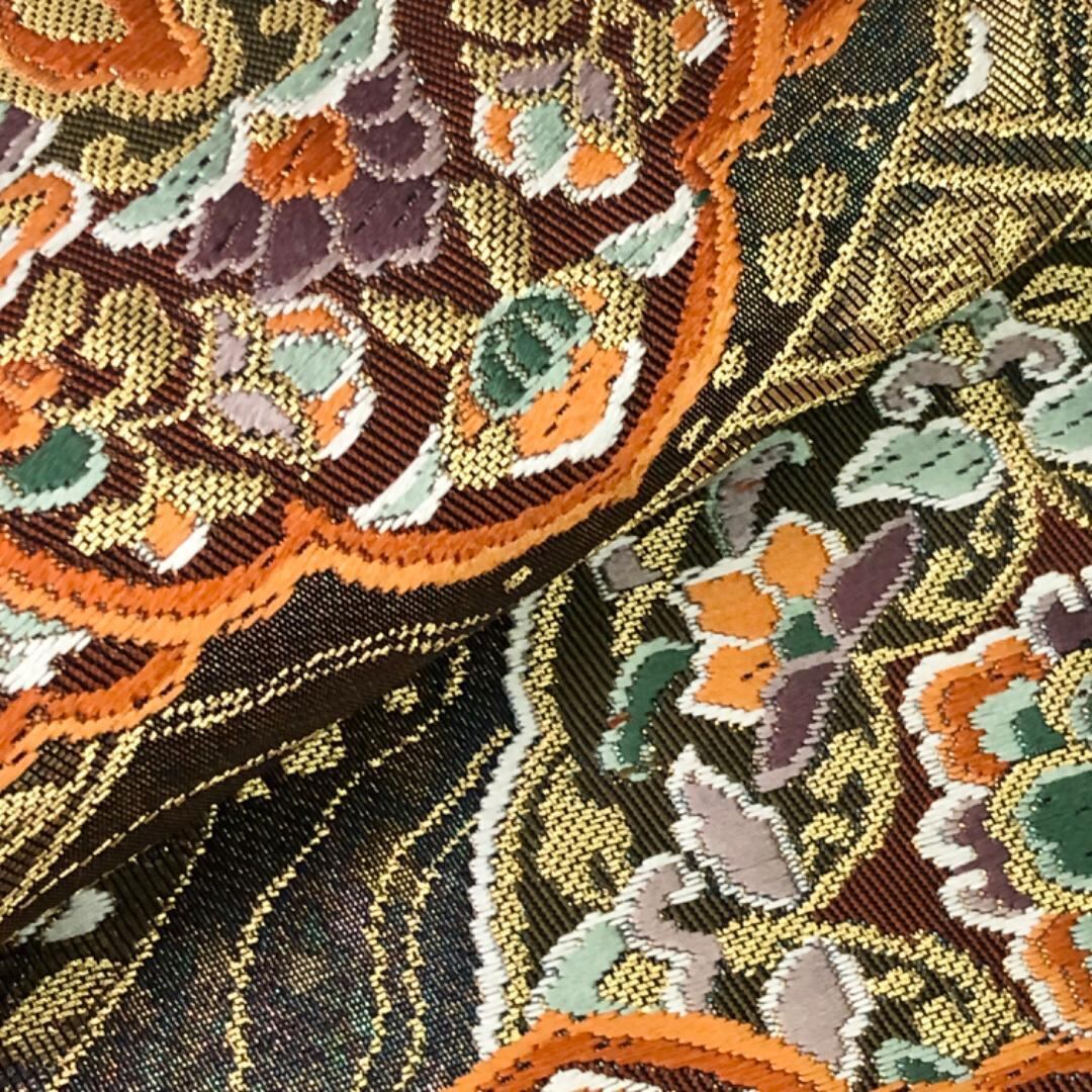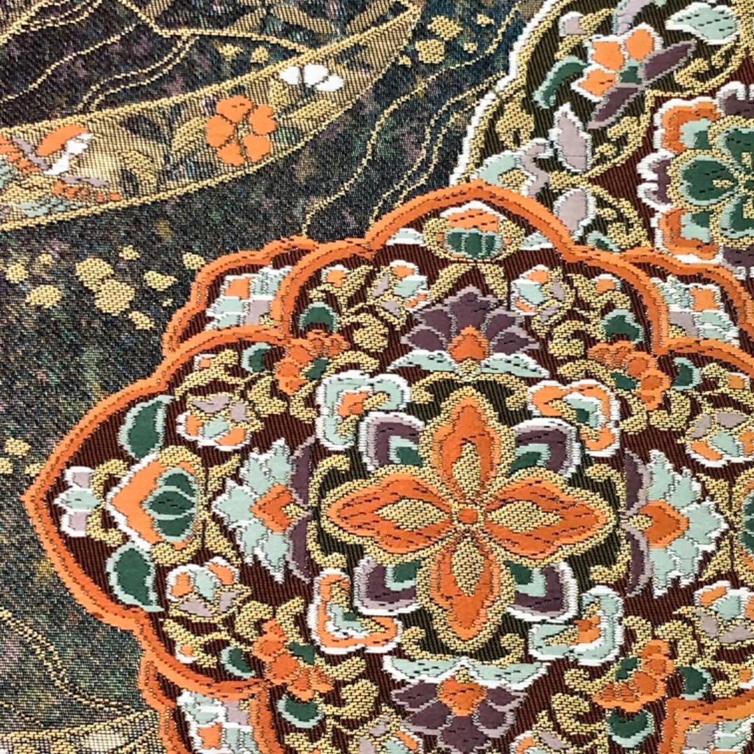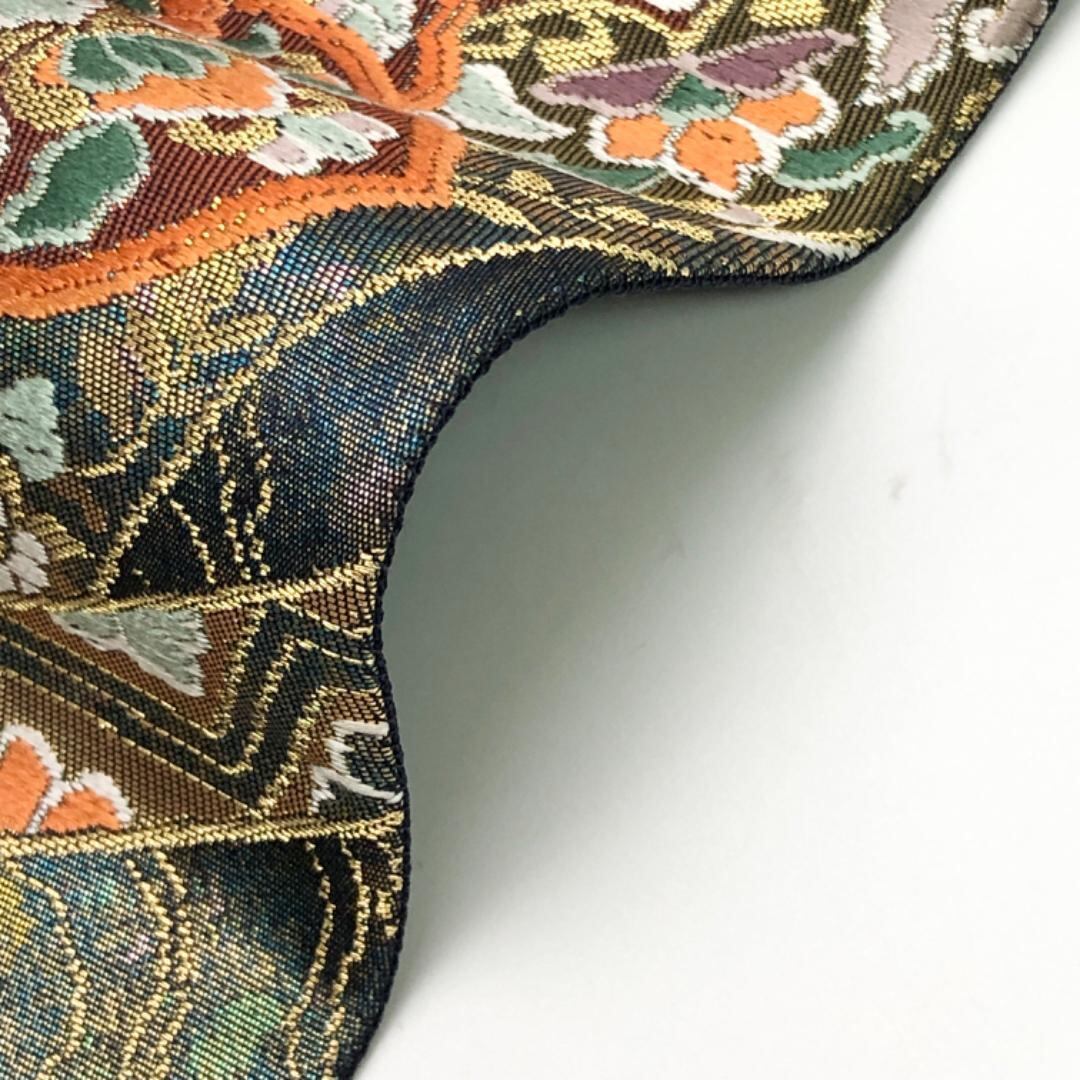 濃深藍色ベースの落ち着きあるお色味に熨斗に華柄模様の柄行がデザインされた素敵なお品でございます。