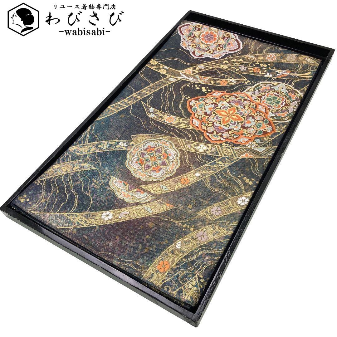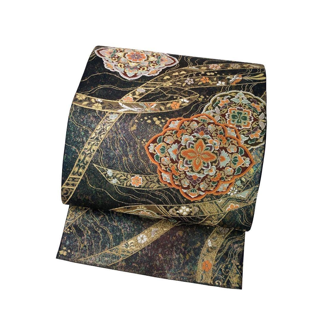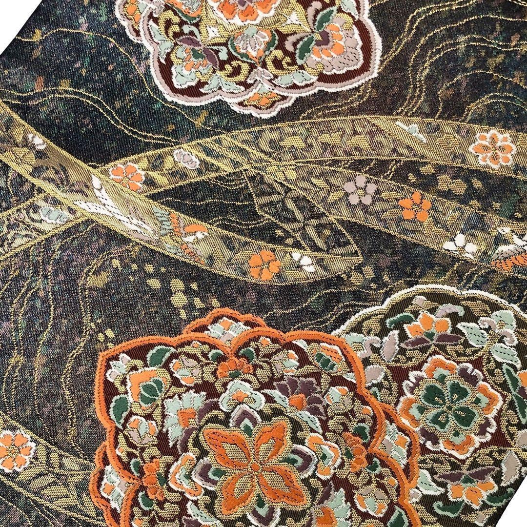 袋帯 流水小袖華文 熨斗に華柄模様 濃深藍色 金糸 O-5677 着物 きもの kimono 和服 和装 中古 リサイクル着物 【送料無料】