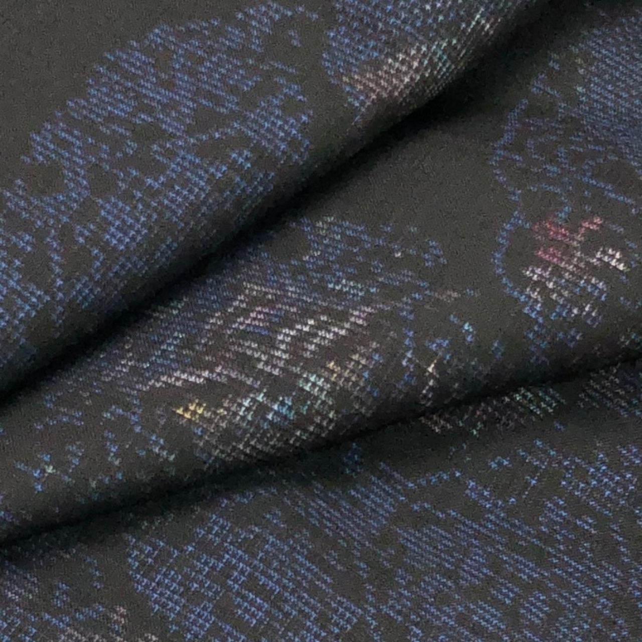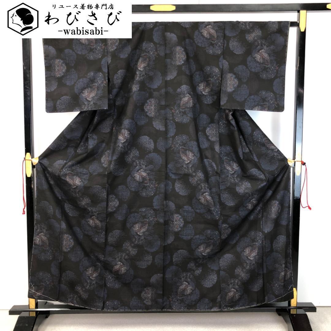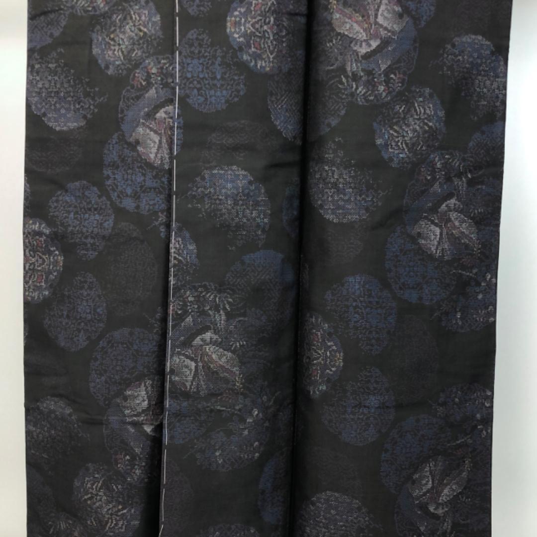 紺鉄色ベースのお色味、縦横の絣の雪輪に花模様などの柄裄がデザインされた雰囲気の良い素敵なお品でございます。