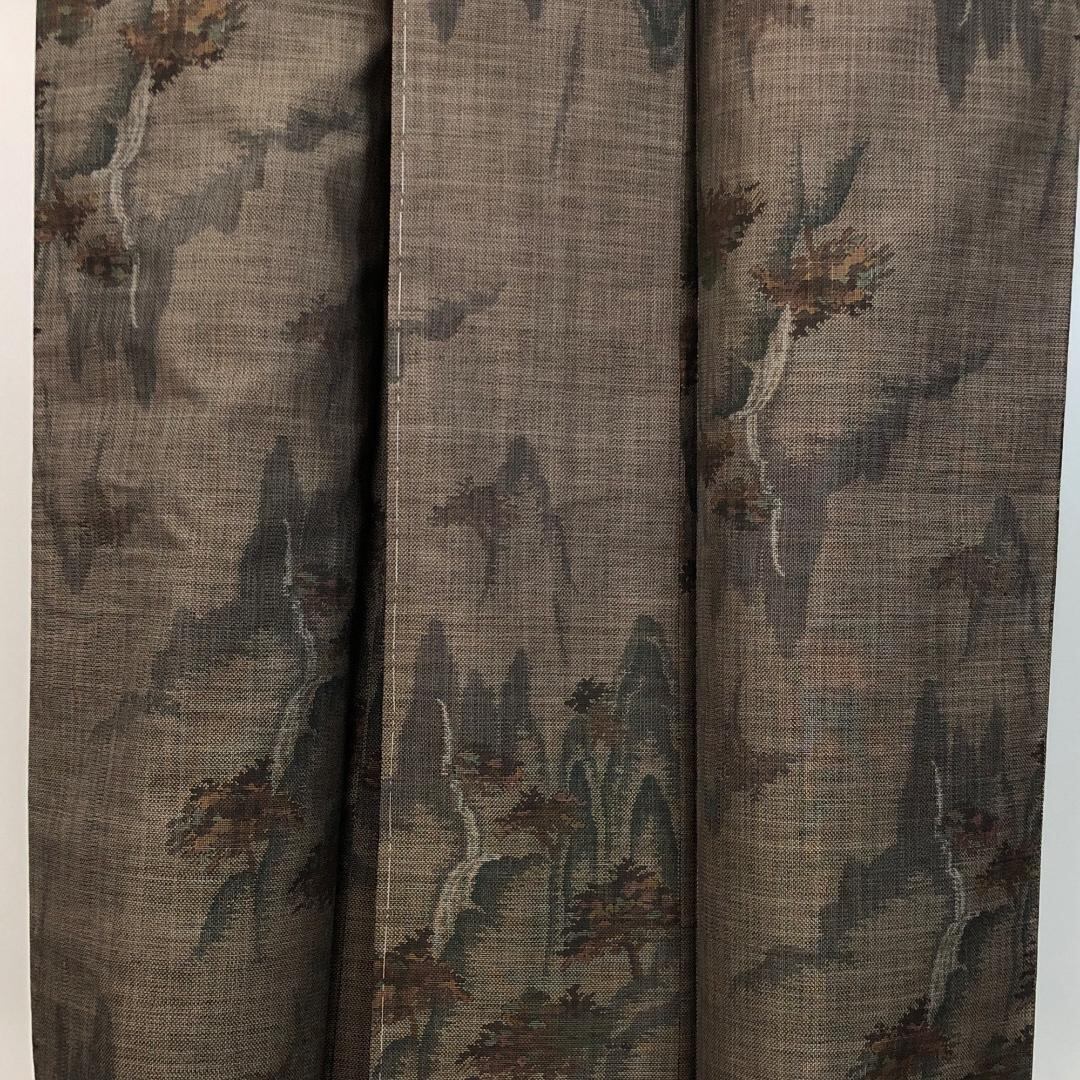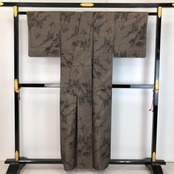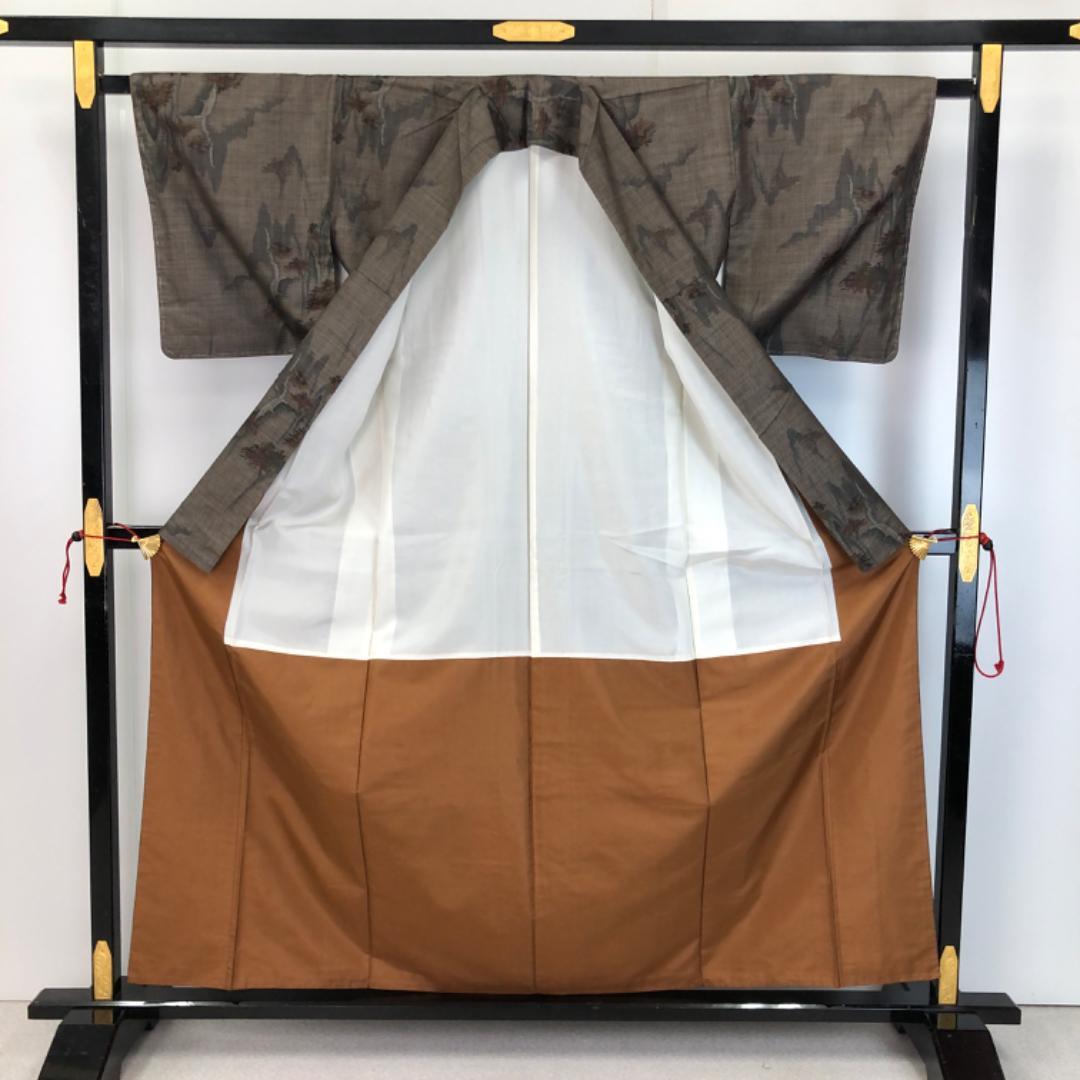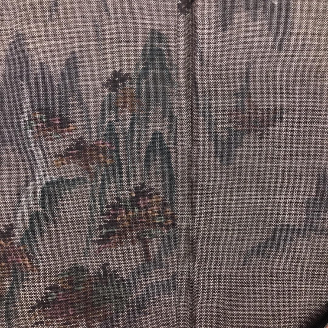 茶泥染の落ち着きあるお色味に風景模様の柄裄がデザインされた素敵なお品でございます。