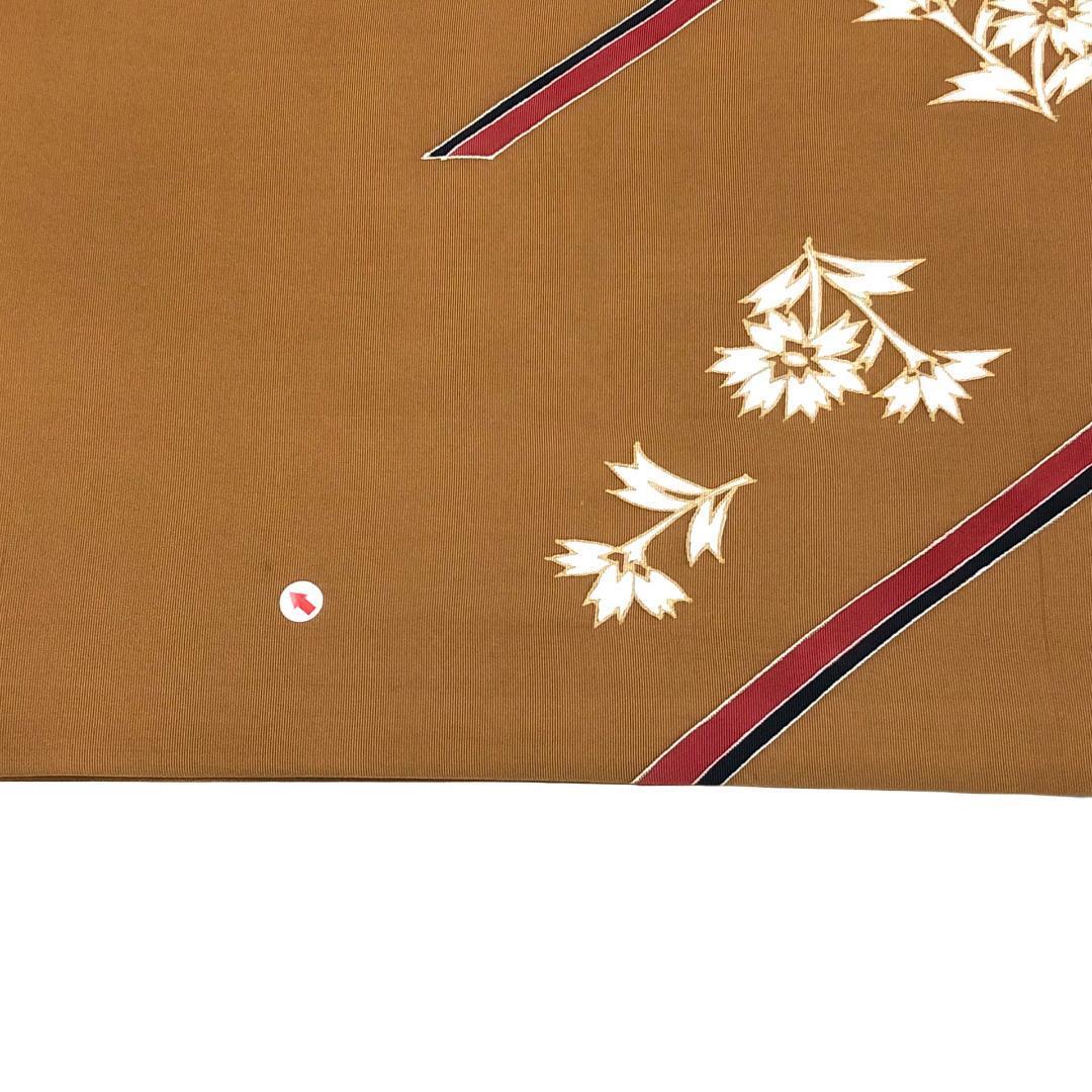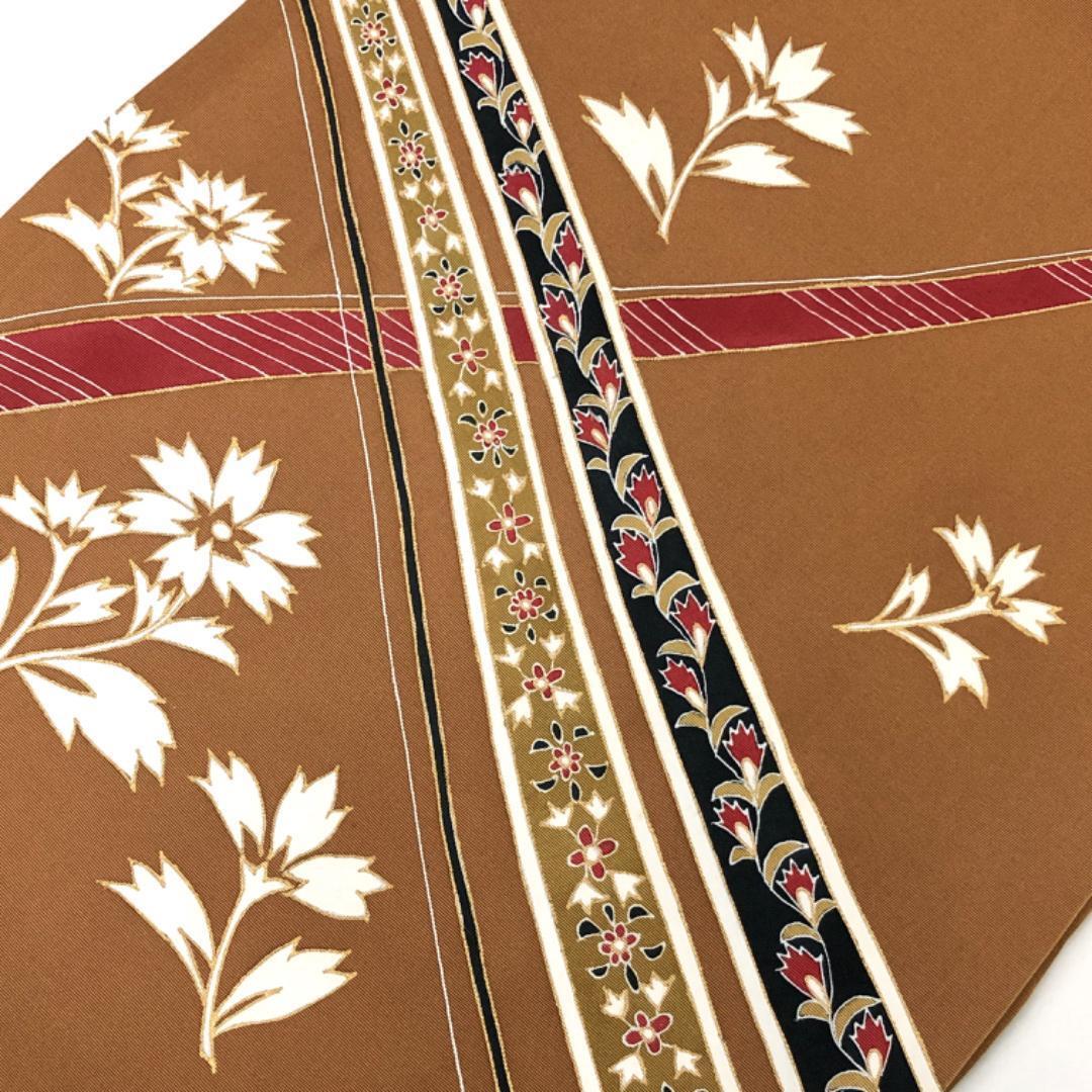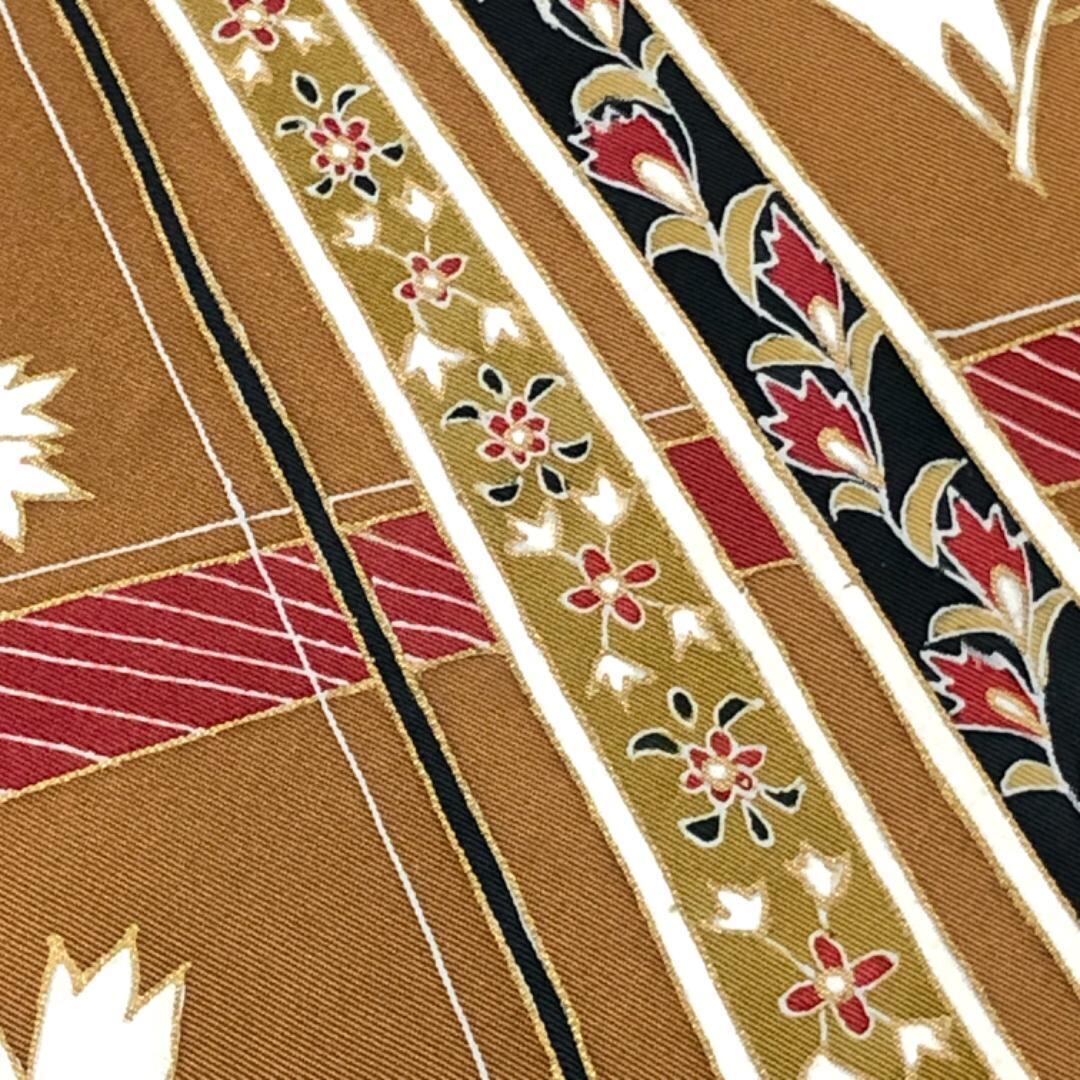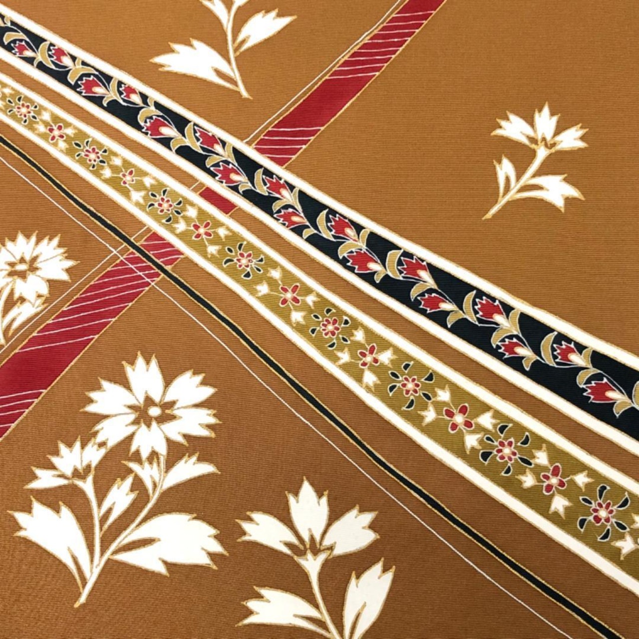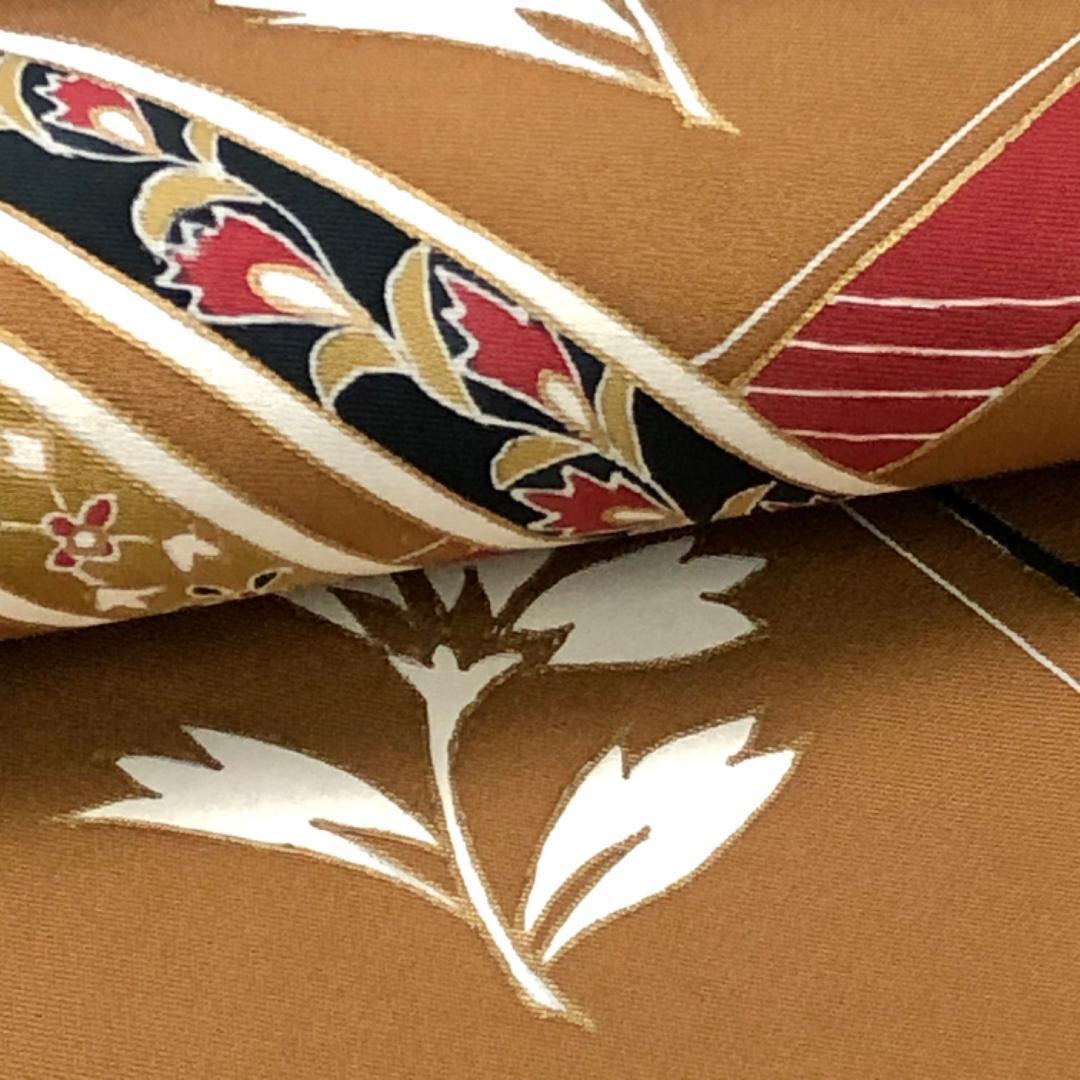 琥珀色のお色味に金彩が使われた花柄模様がデザインされた雰囲気の良い素敵な柄裄のお品でございます。